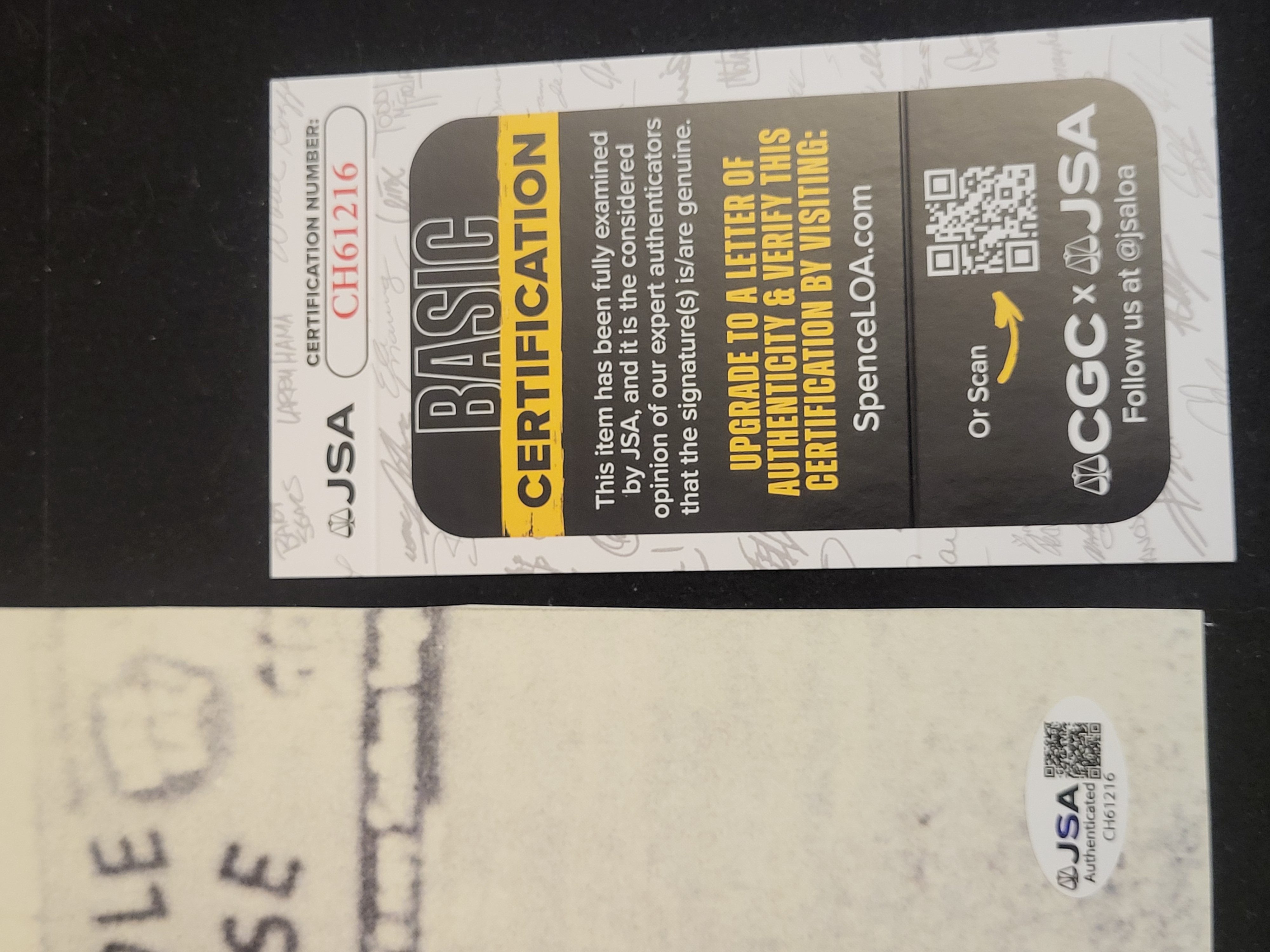 The photograph and authentication materials appear to be in good condition. A JSA authentication sticker is affixed to the upper right corner of the image. Minor surface wear consistent with age and handling.