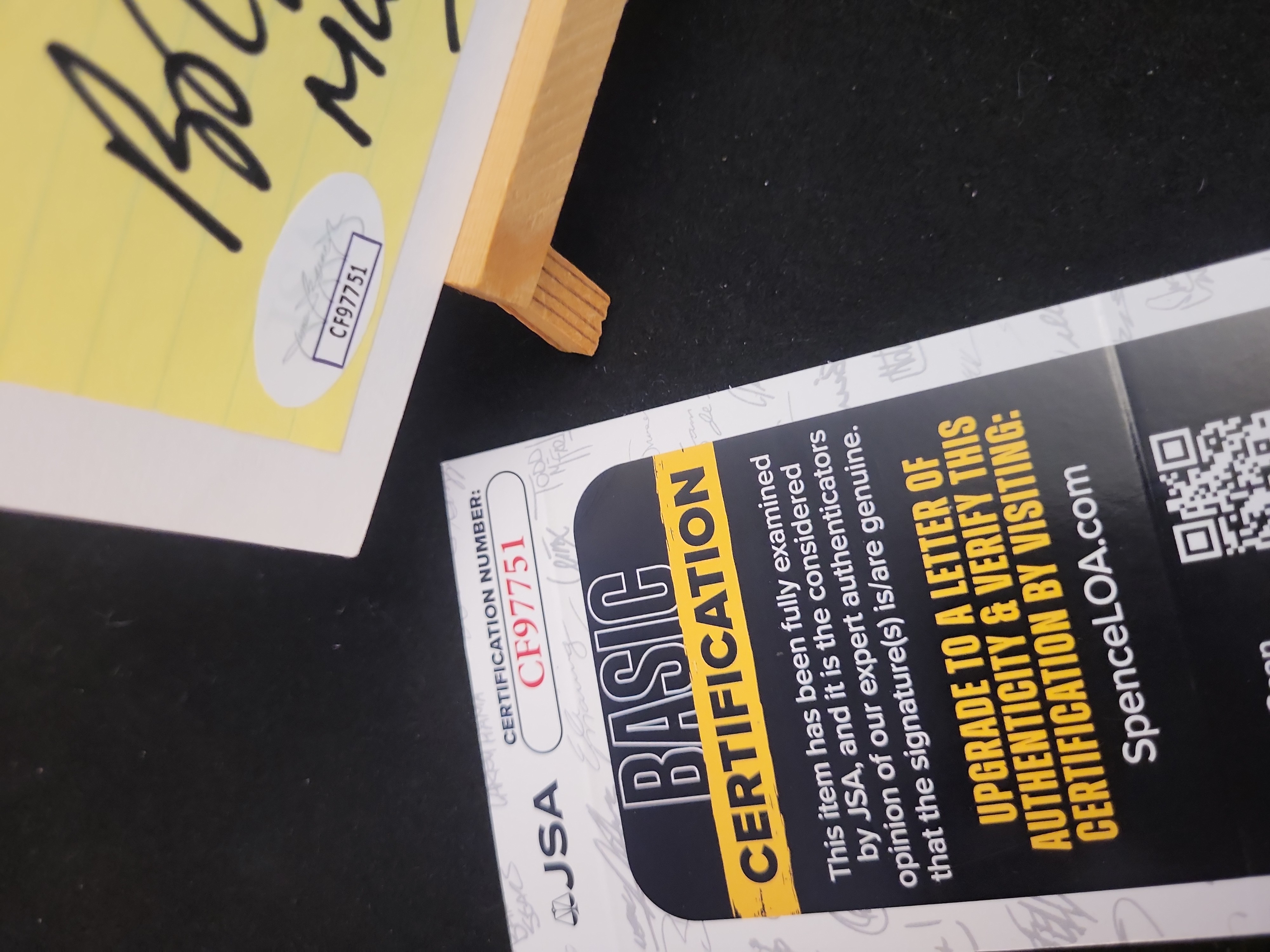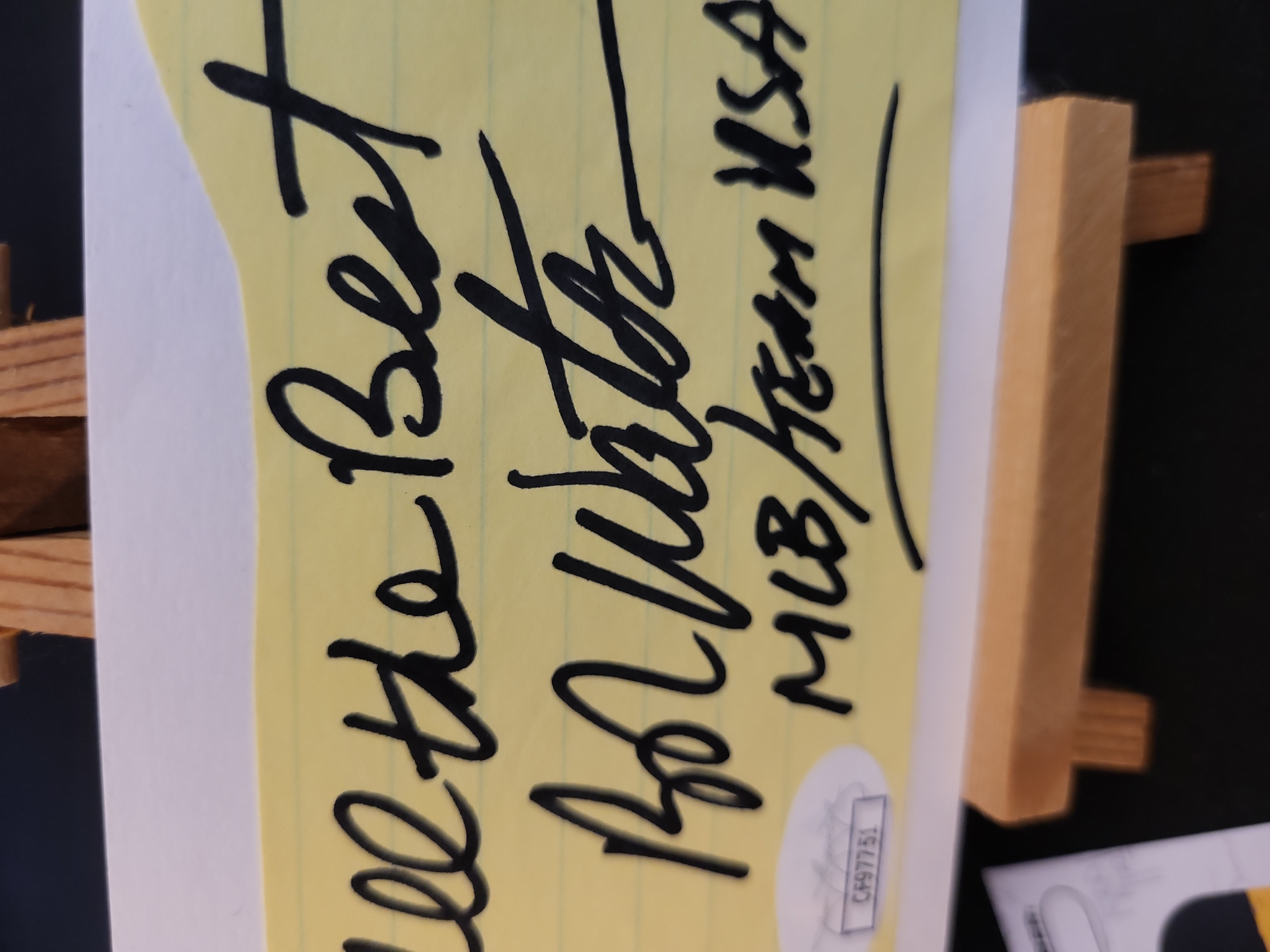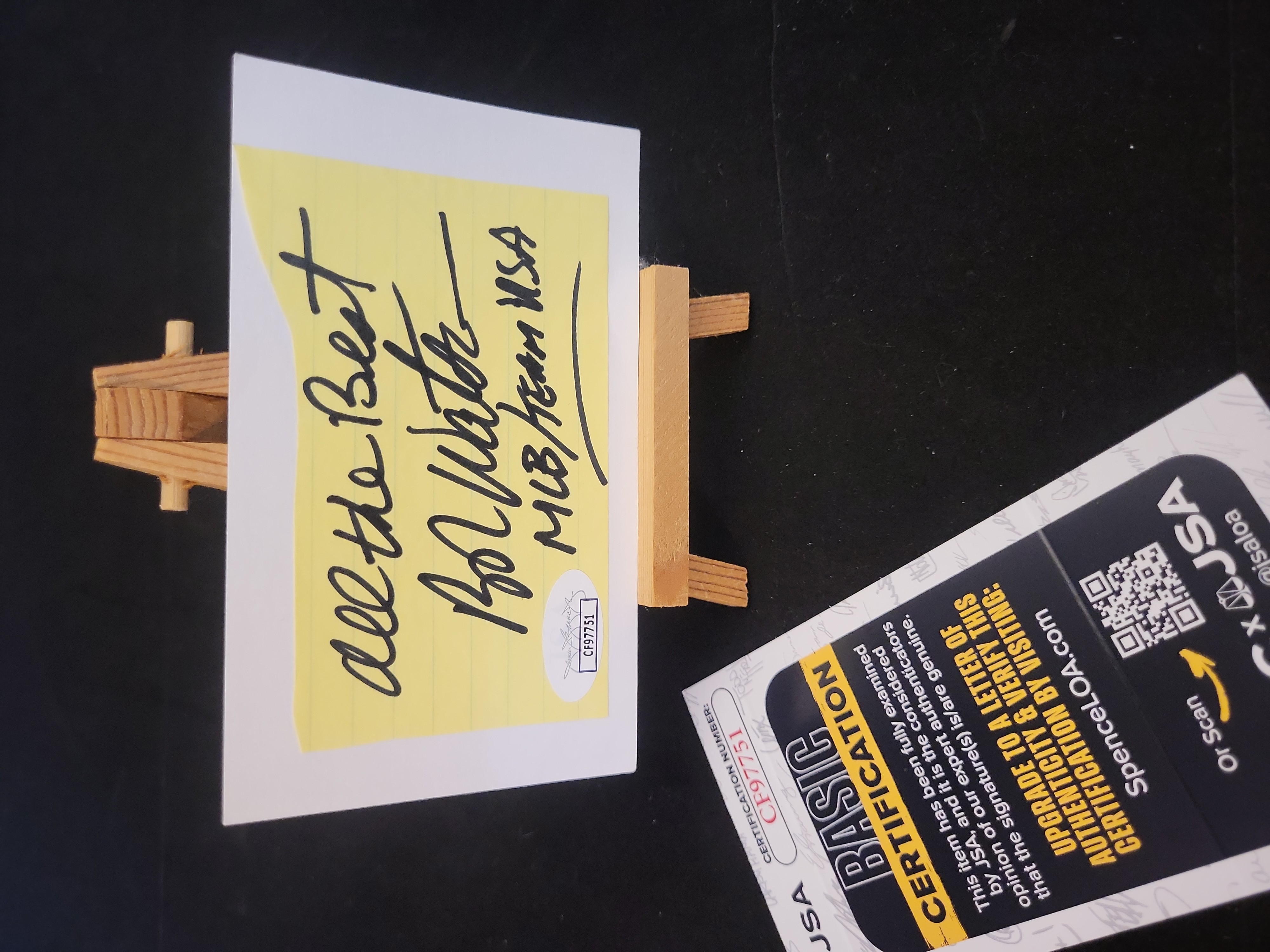 This lot features an authentic hand-signed note from the late Bob Watson, a highly respected Major League Baseball player and executive. Watson, a two-time All-Star, holds the distinction of scoring the one-millionth run in MLB history and later served as the General Manager for the Houston Astros and the World Series-winning New York Yankees. The autograph is written in bold black marker on a fragment of yellow lined paper and includes the personalized inscription All the Best Bob Watson MLB/TEAM USA. The signed fragment is mounted on a white card and is accompanied by a James Spence Authentication JSA Basic Certification card with a matching tamper-evident sticker, certification number CF97751. A small wooden display easel is included with the item for presentation.