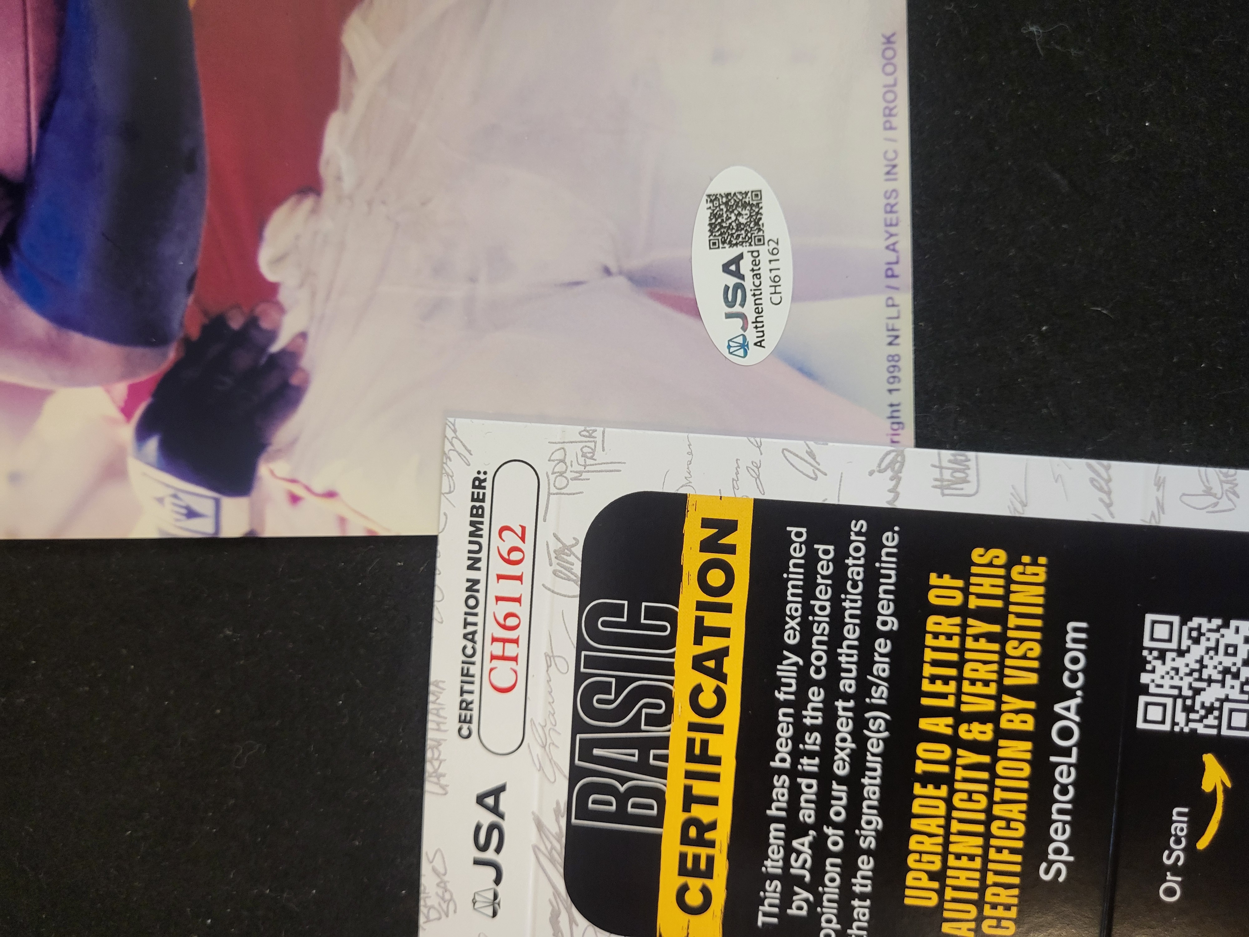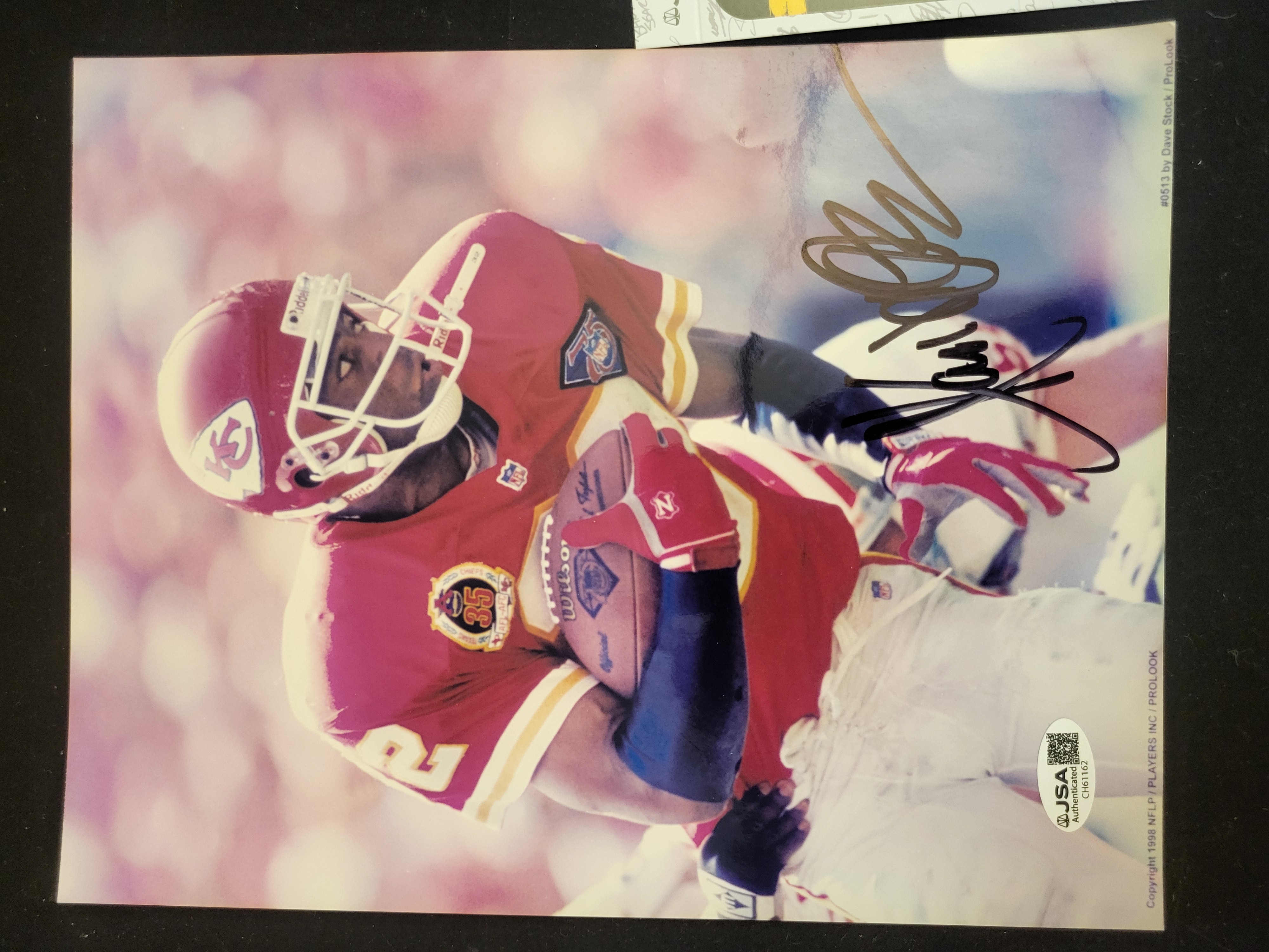 This lot features an autographed color photograph of Marcus Allen in his Kansas City Chiefs uniform, depicted in a mid-action pose holding a Wilson football. The subject is wearing a jersey adorned with the NFL 75th anniversary patch and the Chiefs 35th AFL anniversary patch. A bold signature in marker is positioned in the upper right quadrant. The photograph includes a copyright notice from 1998 for NFLP / Players Inc / ProLook and is attributed to photographer Dave Stock. The item is accompanied by a James Spence Authentication (JSA) tamper-evident sticker and a corresponding Basic Certification card, both bearing the matching certification number CH61162.