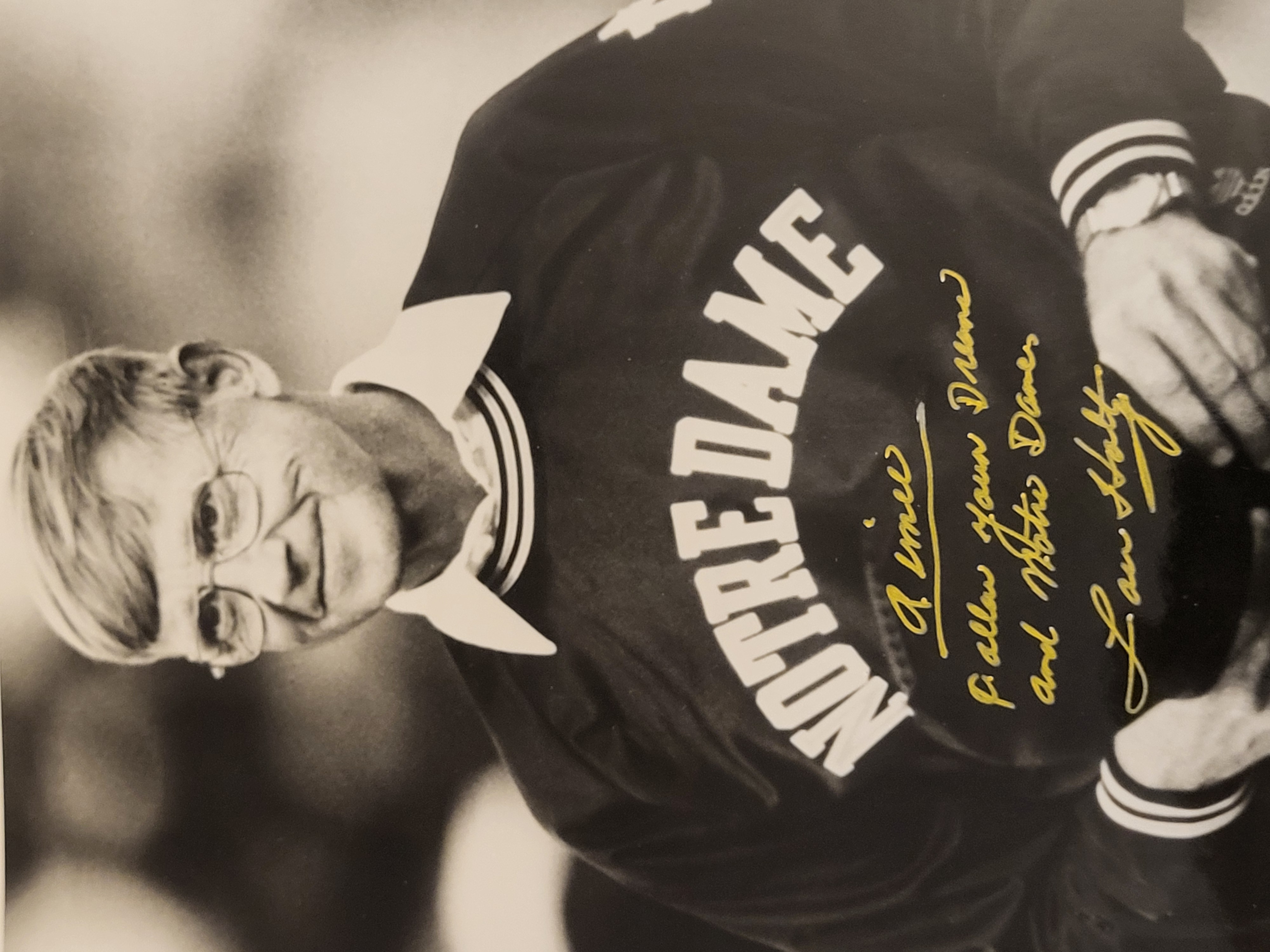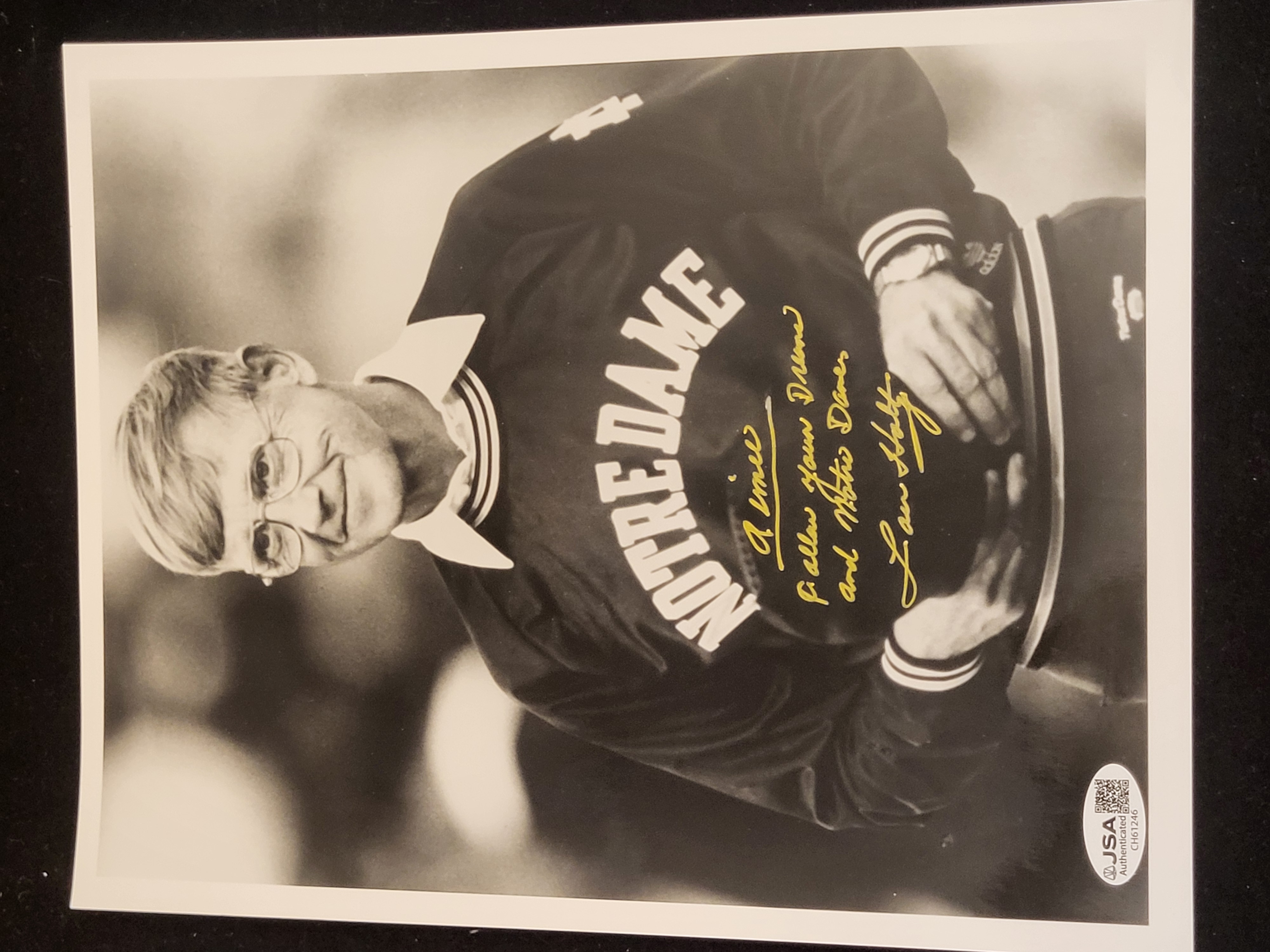 BID PER WHAT YOU SEE IN THE PHOTO, NOT THE AI GENERATED TITLES AND DESCRIPTIONS! Lou Holtz Autographed Notre Dame Black and White Photograph with JSA Certification
