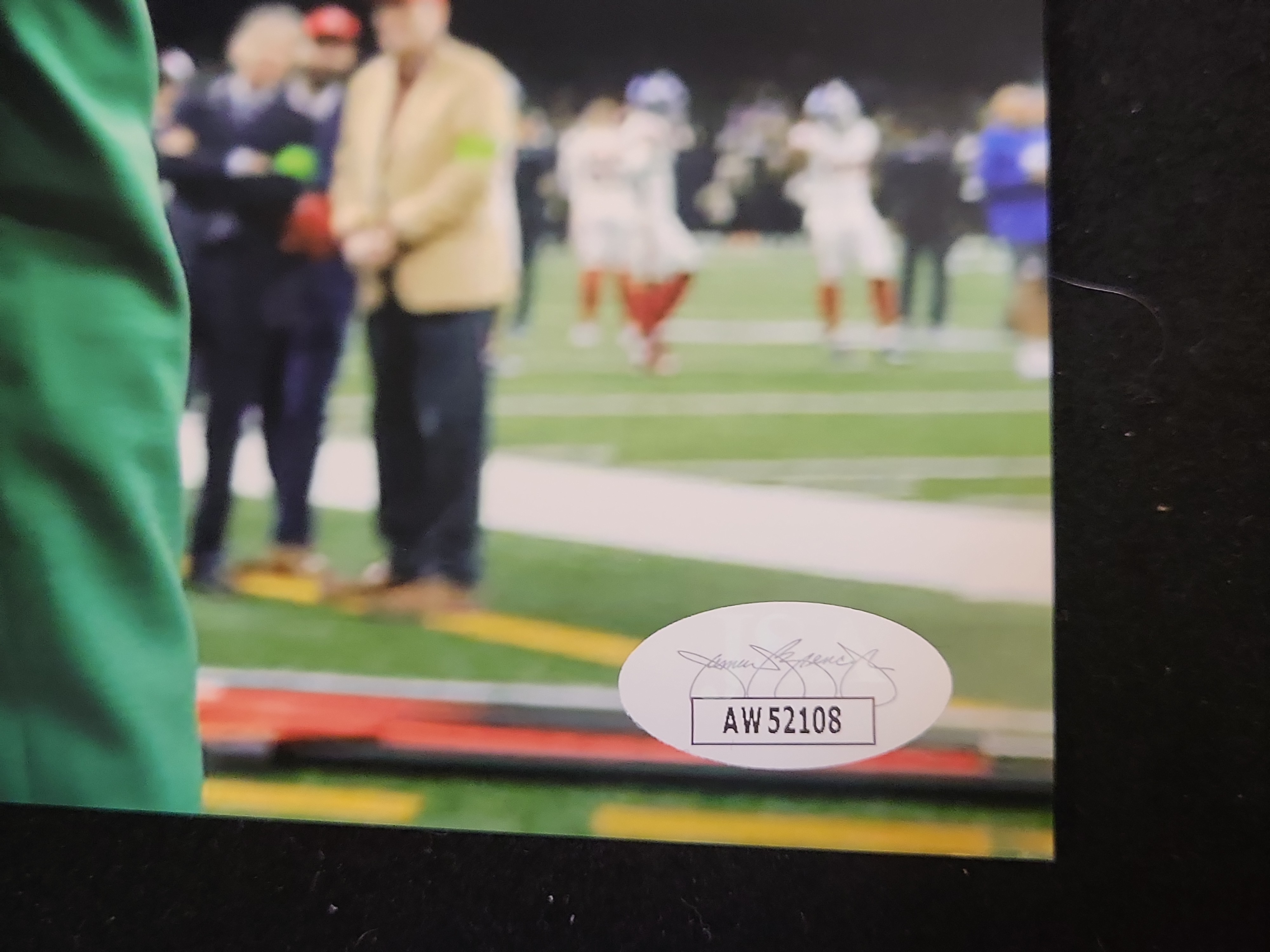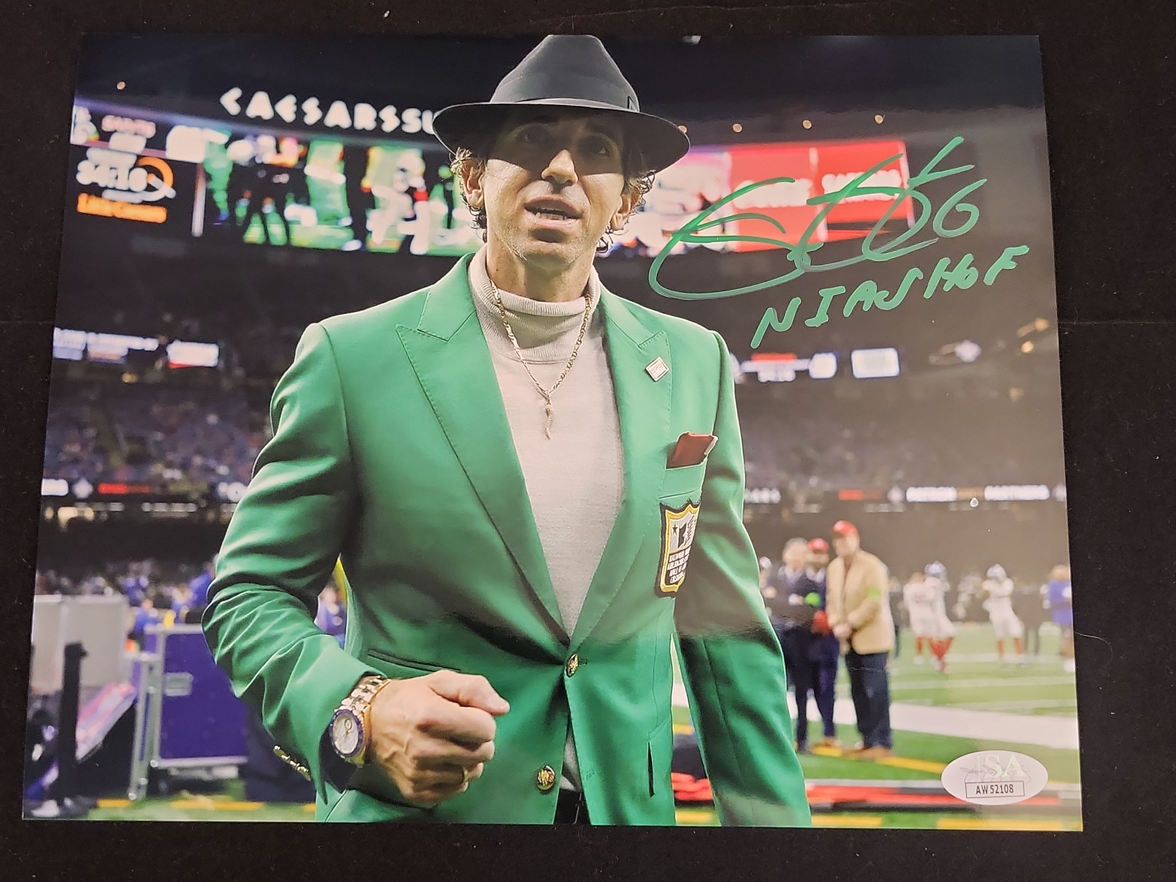This lot features a professional 8×10 high-gloss color photograph of NFL Draft analyst and media personality E.J. Snyder. The image captures Snyder on a stadium field wearing a charcoal fedora and the distinctive green blazer of the National Italian American Sports Hall of Fame (NIASHF). The photograph is hand-signed by Snyder in green bold felt-tip marker and includes the handwritten acronym NIASHF. Authentication is provided by the James Spence Authentication (JSA) Witnessed Protection Program, ensuring the signature was signed in the presence of a JSA representative. The item bears a tamper-evident JSA sticker with certification number AW52108 in the lower right corner.