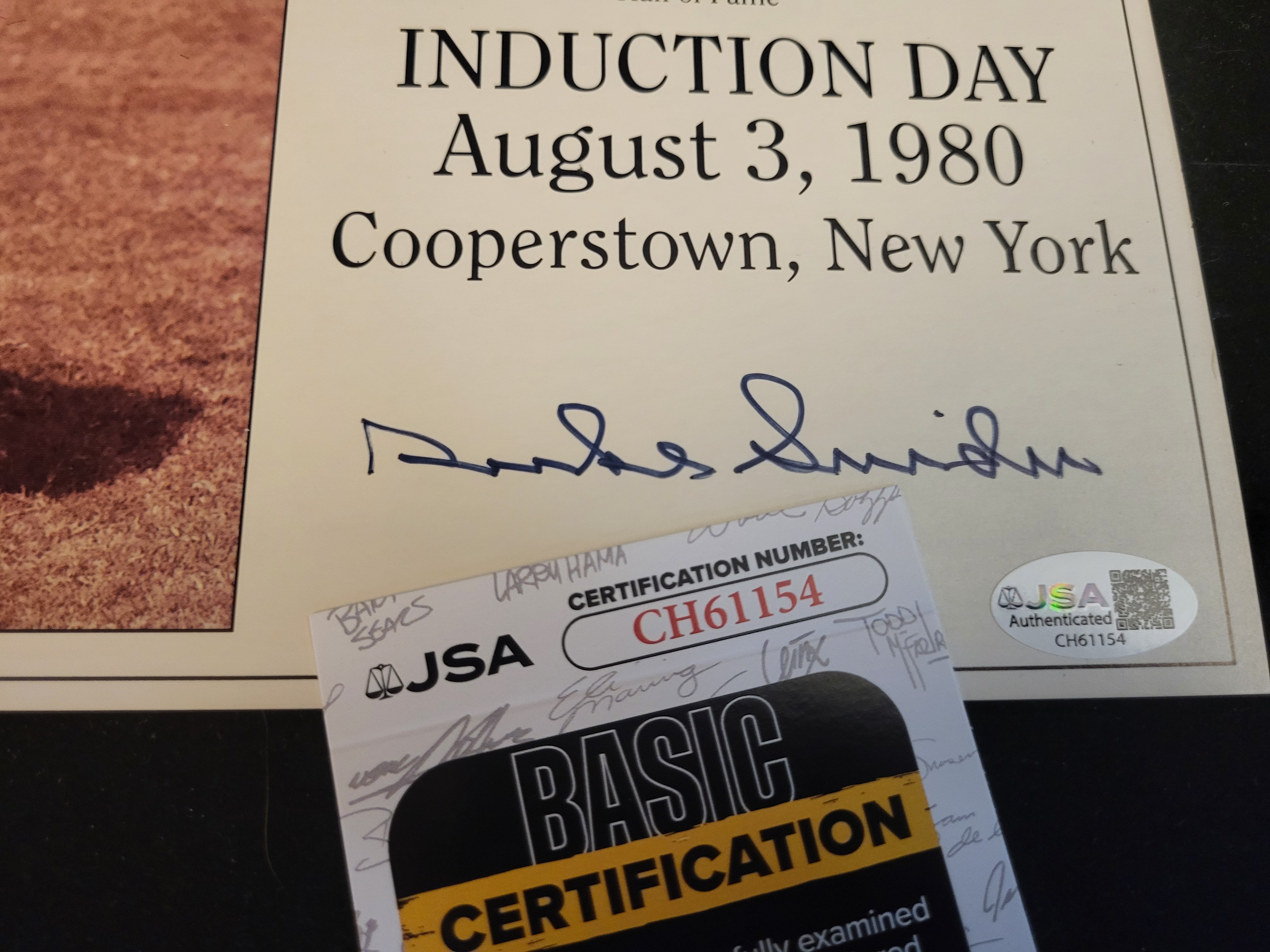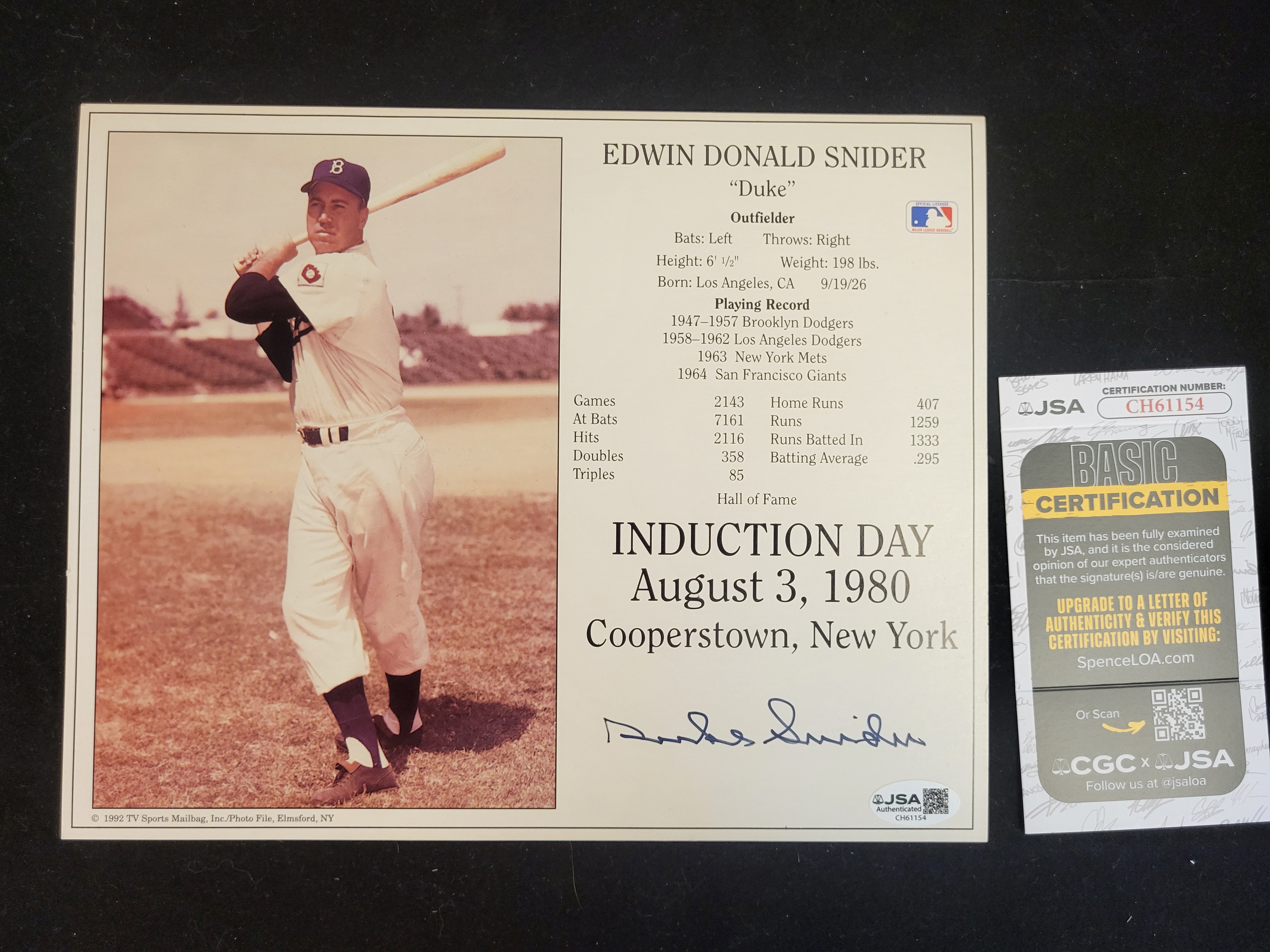 This lot consists of a hand-signed commemorative plaque and a corresponding authentication card for Major League Baseball Hall of Famer Edwin Donald Duke Snider. The primary item is a printed sheet produced in 1992 by TV Sports Mailbag, Inc., featuring a color photograph of Snider in his Brooklyn Dodgers uniform. The sheet includes his career statistics and a summary of his playing record with the Brooklyn Dodgers, Los Angeles Dodgers, New York Mets, and San Francisco Giants. It commemorates his Hall of Fame induction on August 3, 1980, in Cooperstown, New York. Centered below the text is a hand-signed autograph in blue ink by Snider. The item is marked with a James Spence Authentication JSA tamper-evident sticker with certification number CH61154. Accompanying the signed piece is a JSA Basic Certification card with a matching certification number. The lower-left corner of the plaque is printed with 1992 TV Sports Mailbag, Inc./Photo File, Elmsford, NY.