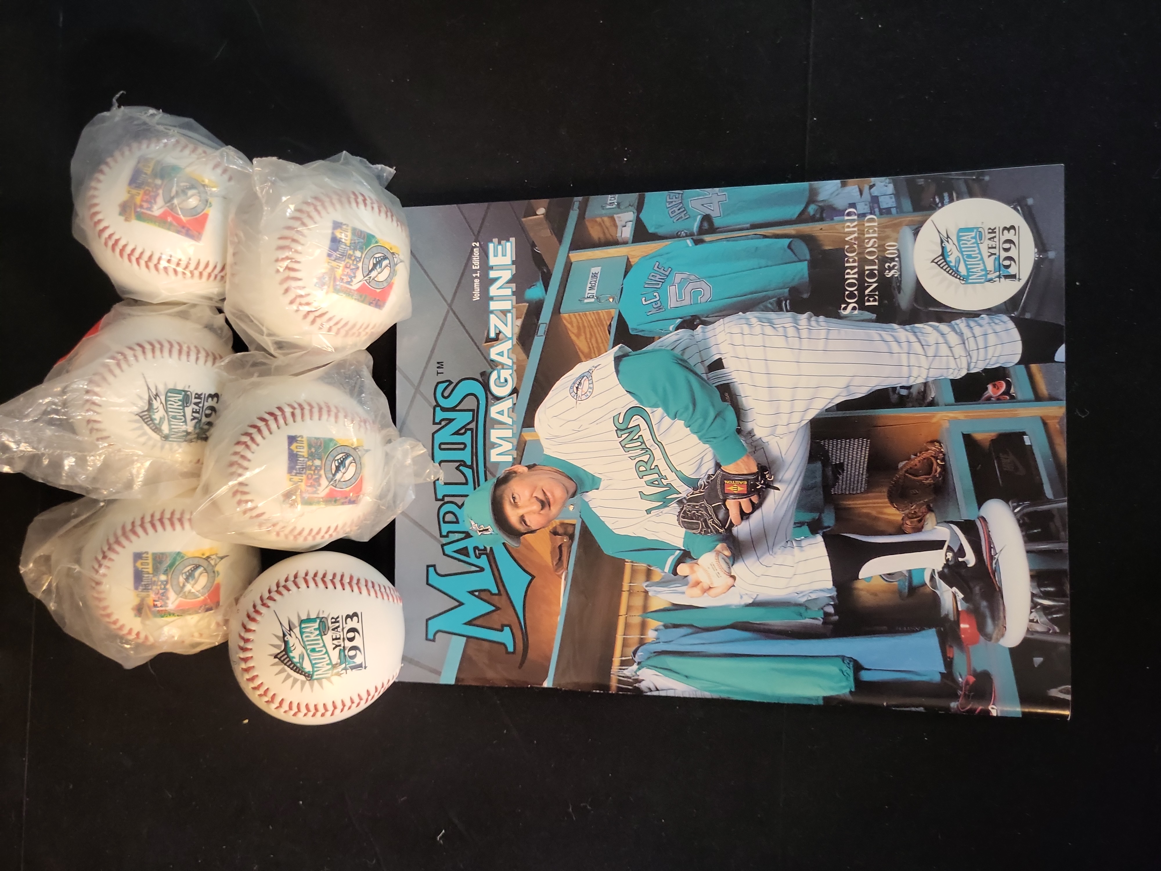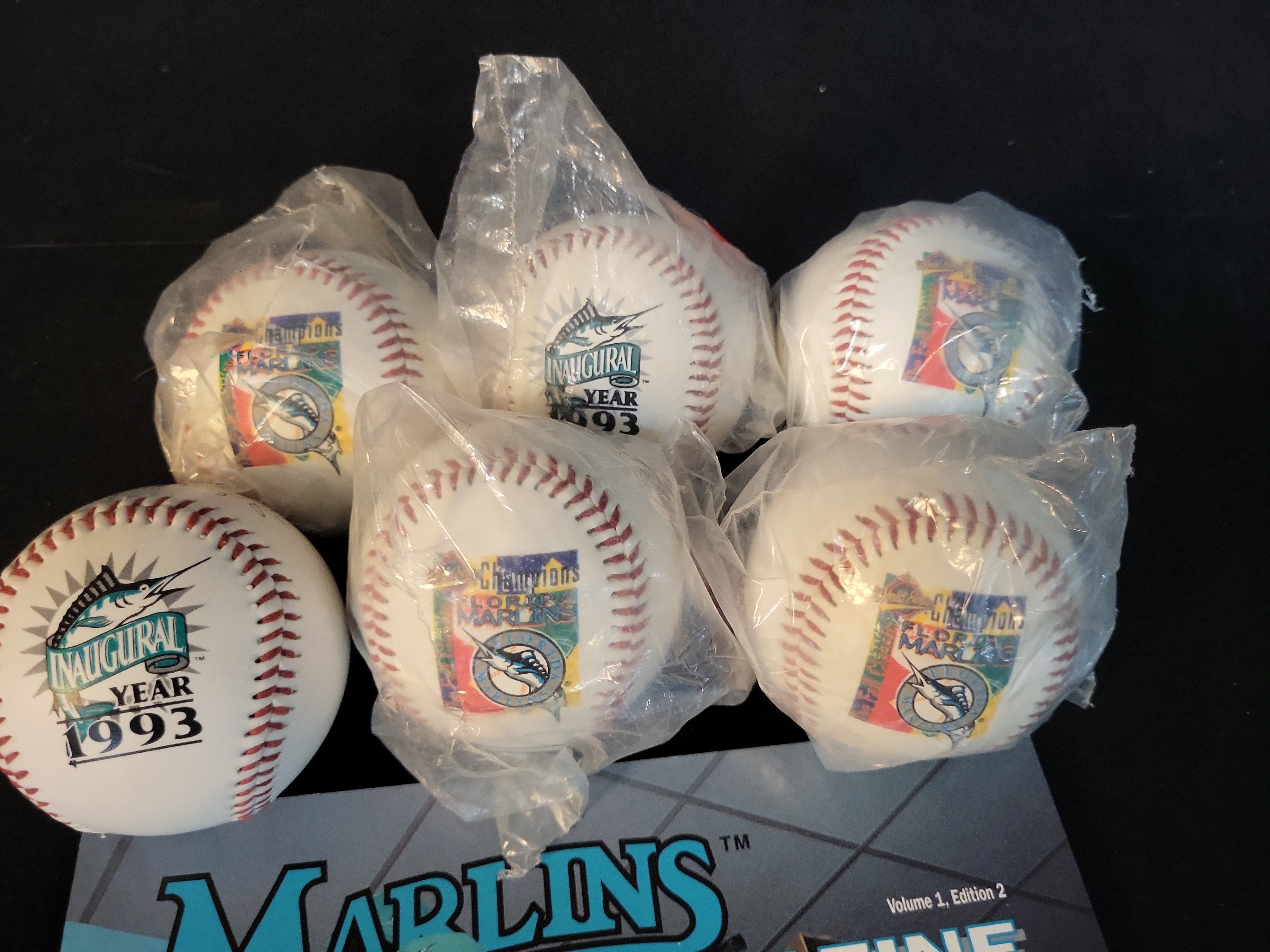 This lot features a collection of commemorative memorabilia from the early history of the Florida Marlins franchise. The collection includes six souvenir baseballs and one official team publication. The baseballs consist of two 1993 Inaugural Year commemorative balls featuring the original team logo and four World Series Champions baseballs celebrating the team’s 1997 victory. The magazine is a 1993 "Marlins Magazine" Volume 1, Edition 2, from the inaugural season. The cover depicts veteran pitcher Charlie Hough in the team locker room and notes that a scorecard is enclosed. These items are mass-produced souvenir-grade collectibles and do not feature athlete signatures, game-use evidence, or third-party authentication.