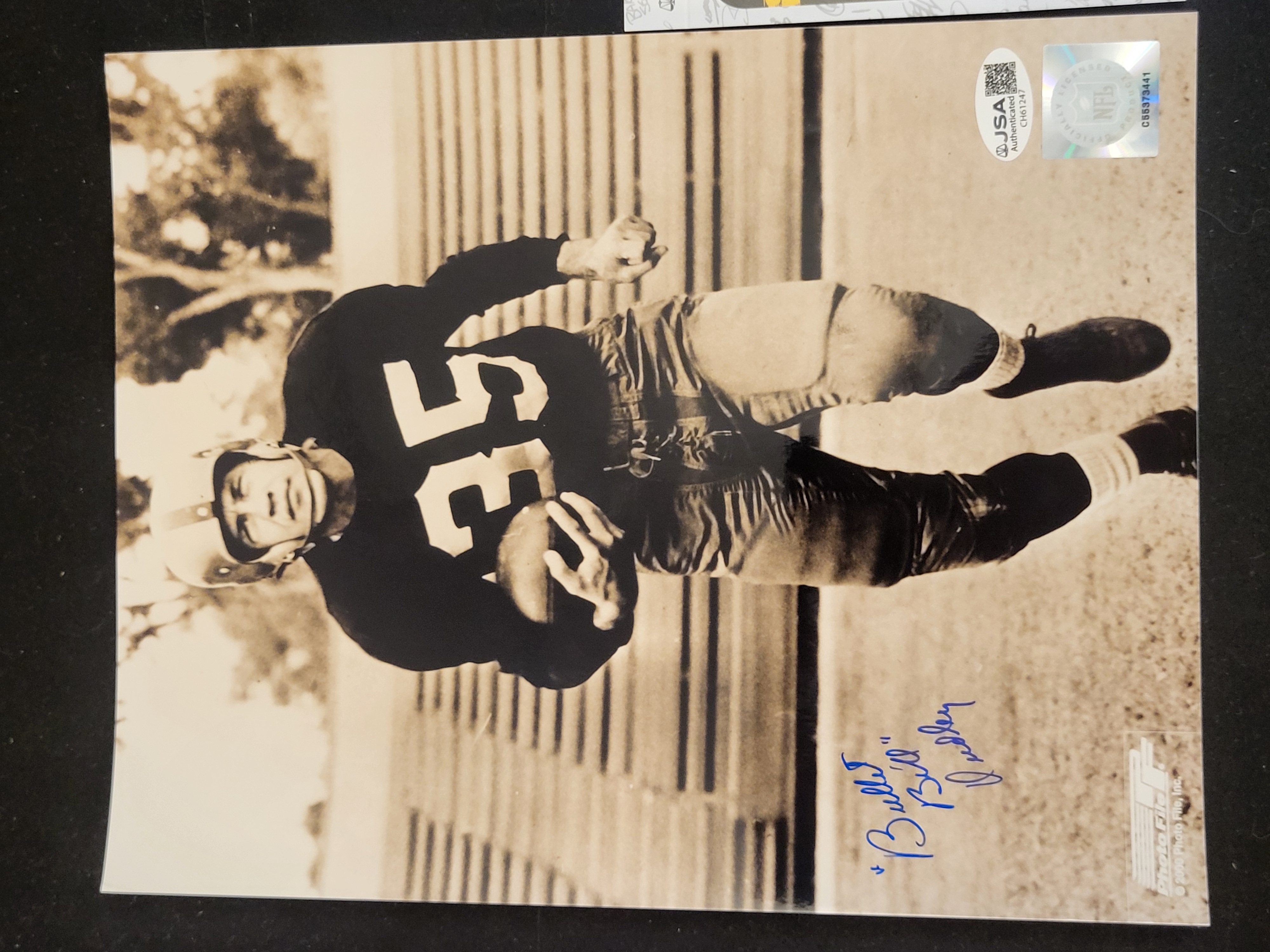 A sepia-tone photograph depicting NFL Hall of Famer Bill Bullet Dudley in a vintage-style uniform with jersey number 35. This item is a reproduction produced by Photo File, Inc. and bears a copyright date of 2000. The photograph is signed in blue ink Bullet Bill Dudley. It features a James Spence Authentication (JSA) sticker, certification number CH61247, and an NFL Officially Licensed Product hologram, number C55373441. The lot includes a matching JSA Basic Certification card.