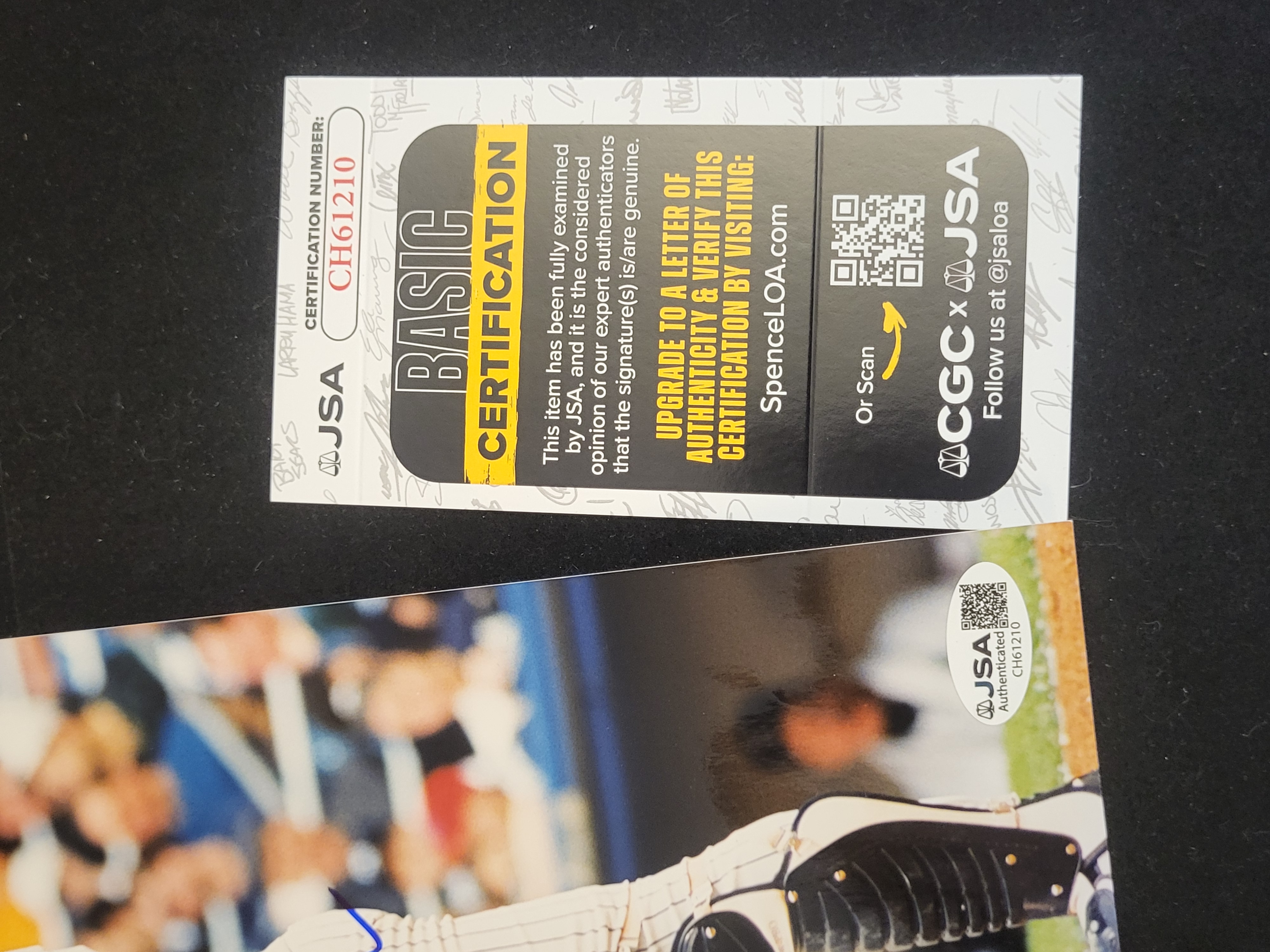 This lot features an autographed color photograph of New York Yankees catcher Jorge Posada. The glossy print depicts Posada in a home pinstripe uniform wearing catcher’s gear, including a mask, chest protector, and shin guards. The photograph is signed by Posada in blue ink across the midsection. The item is accompanied by a James Spence Authentication (JSA) Basic Certification card and features a matching tamper-evident hologram sticker in the upper right corner, both bearing certification number CH61210. The lower right corner of the print includes official MLB and Photo File licensing logos.