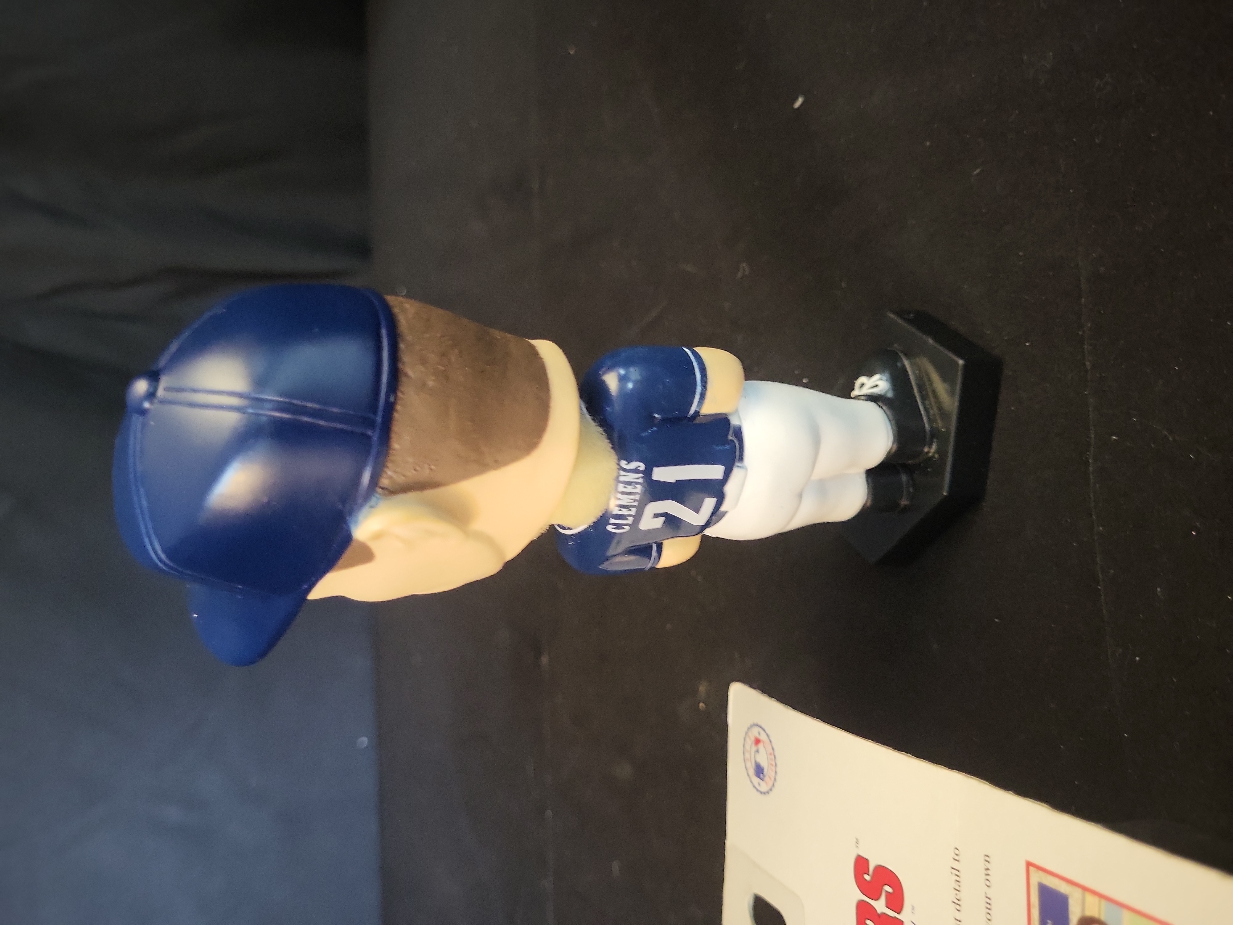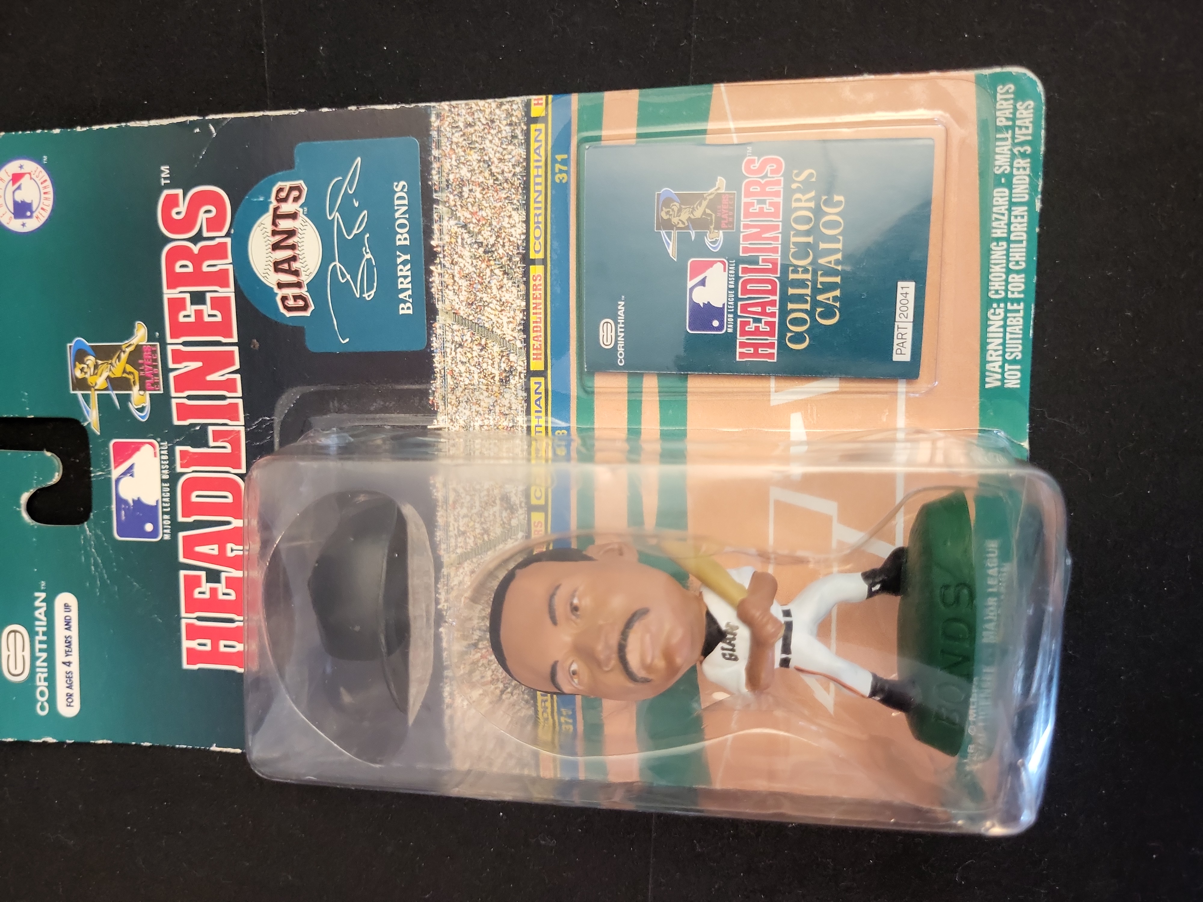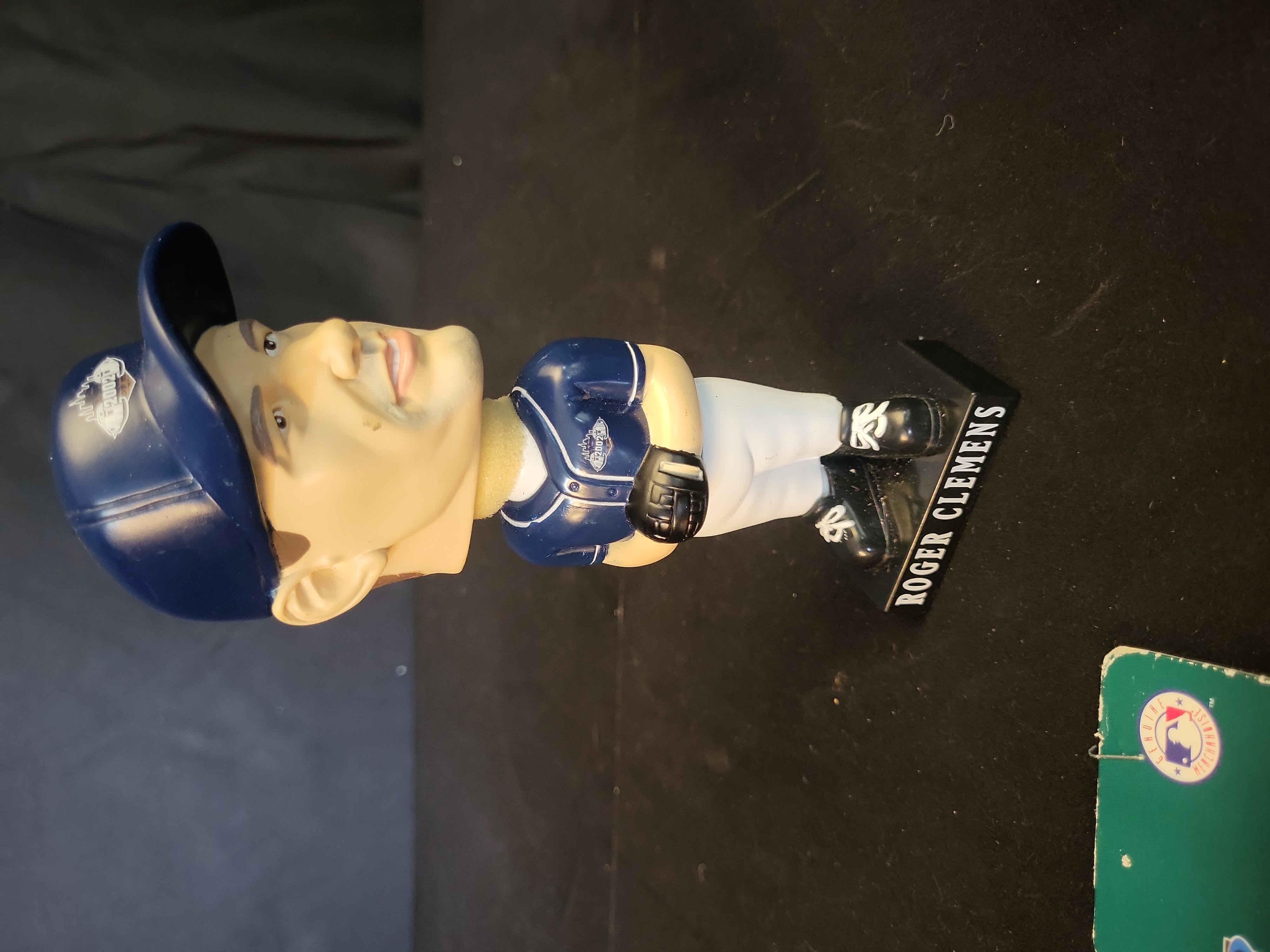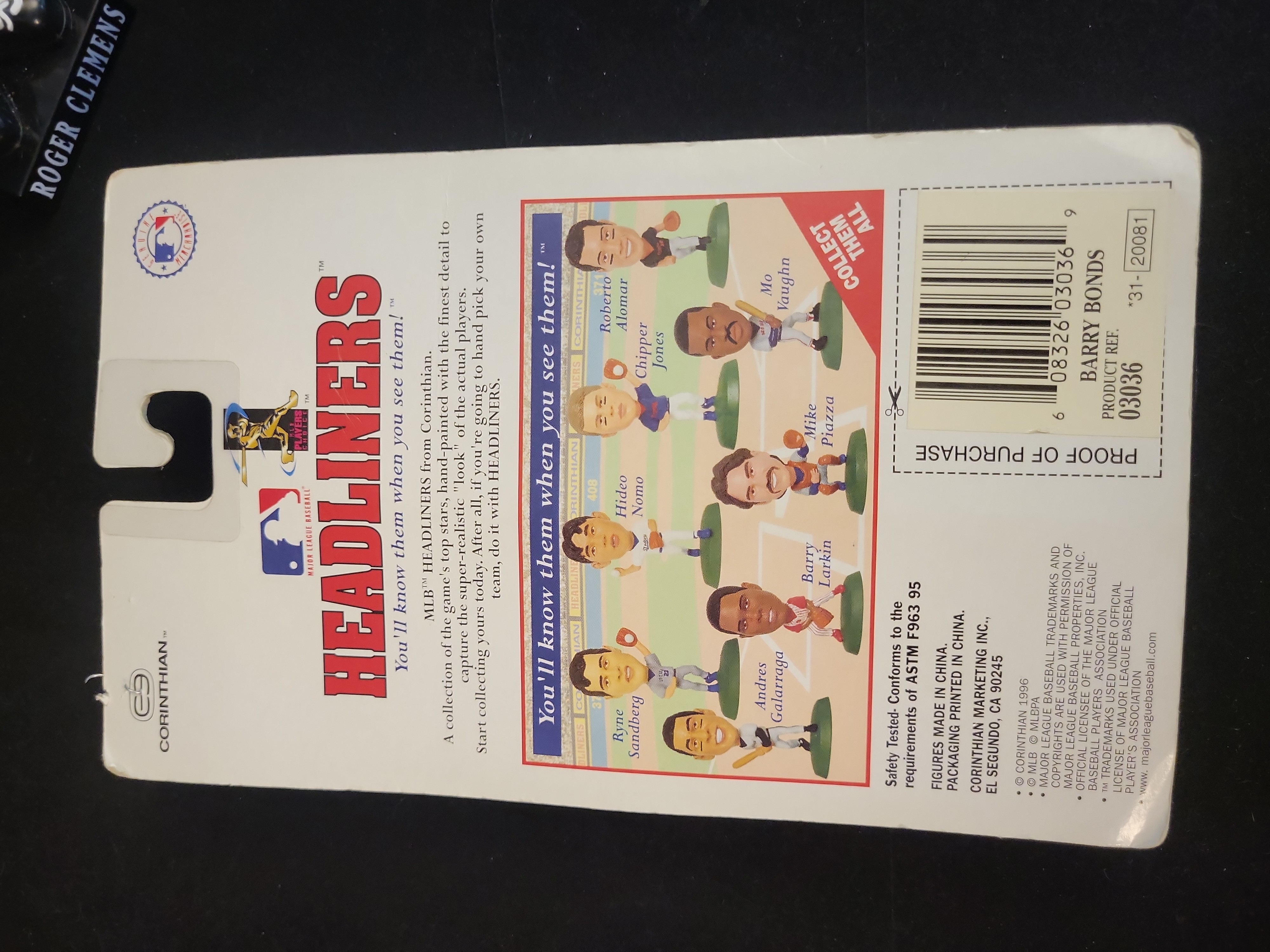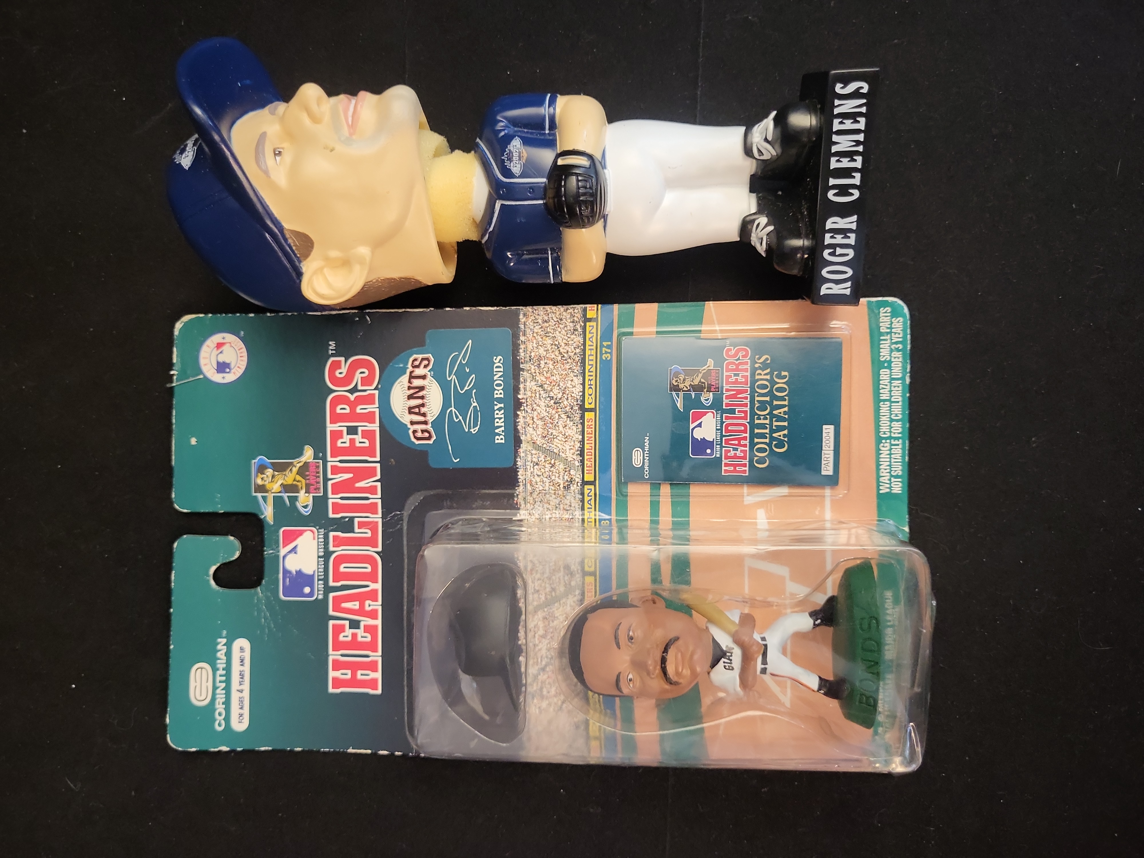 This lot features two vintage Major League Baseball collectible figures. The first is a Roger Clemens New York Yankees bobblehead depicting the pitcher in a navy jersey with number 21. The cap features a commemorative logo consistent with 2002 branding. The second item is a 1996 Barry Bonds San Francisco Giants figure from the Corinthian Headliners series. This hand-painted miniature depicts Bonds in a batting stance and includes a removable batting helmet and a Headliners Collector’s Catalog. The Bonds packaging features a facsimile signature on the cardback. No authentic hand-signed elements or third-party authentication are present for either item.