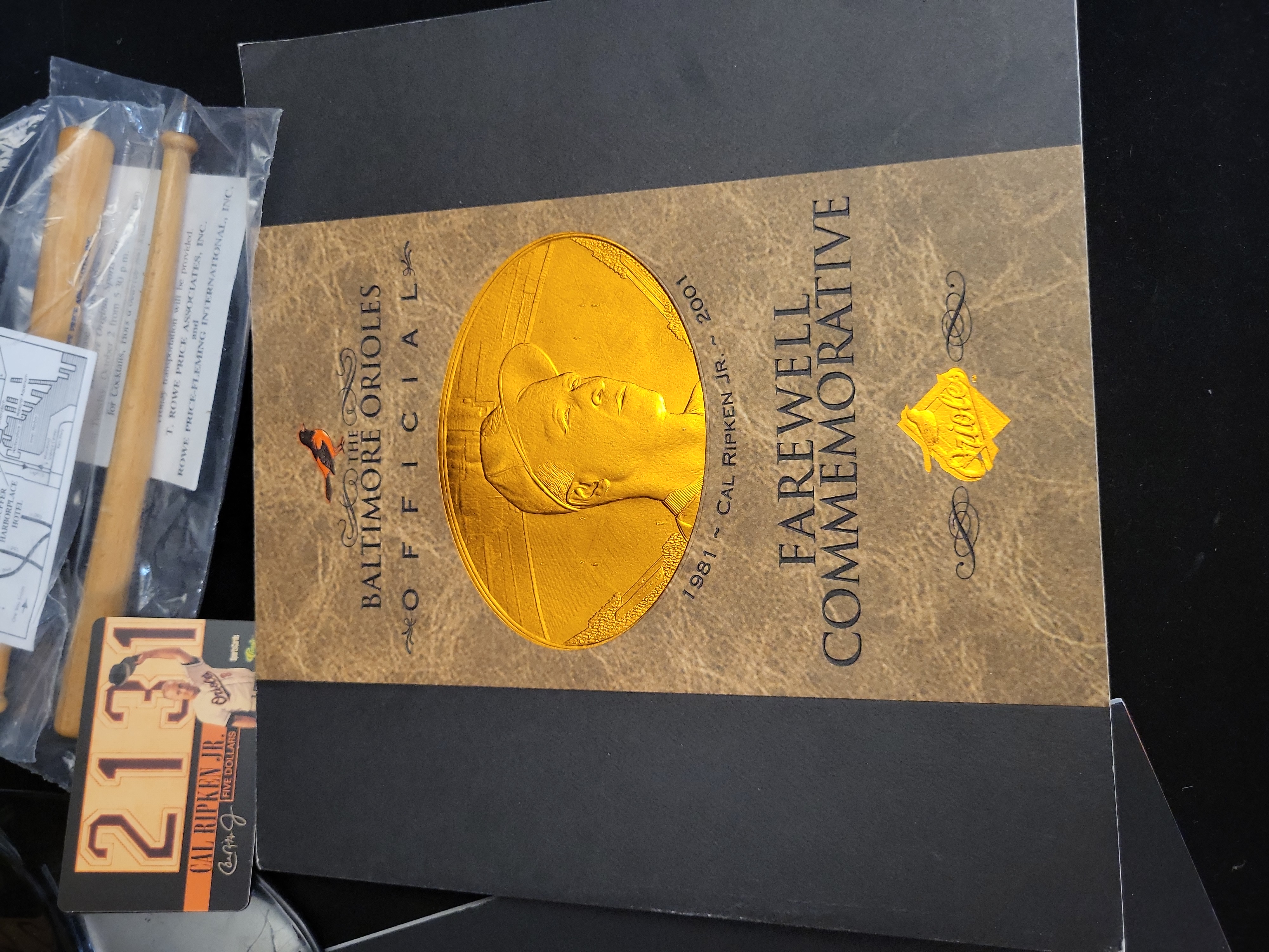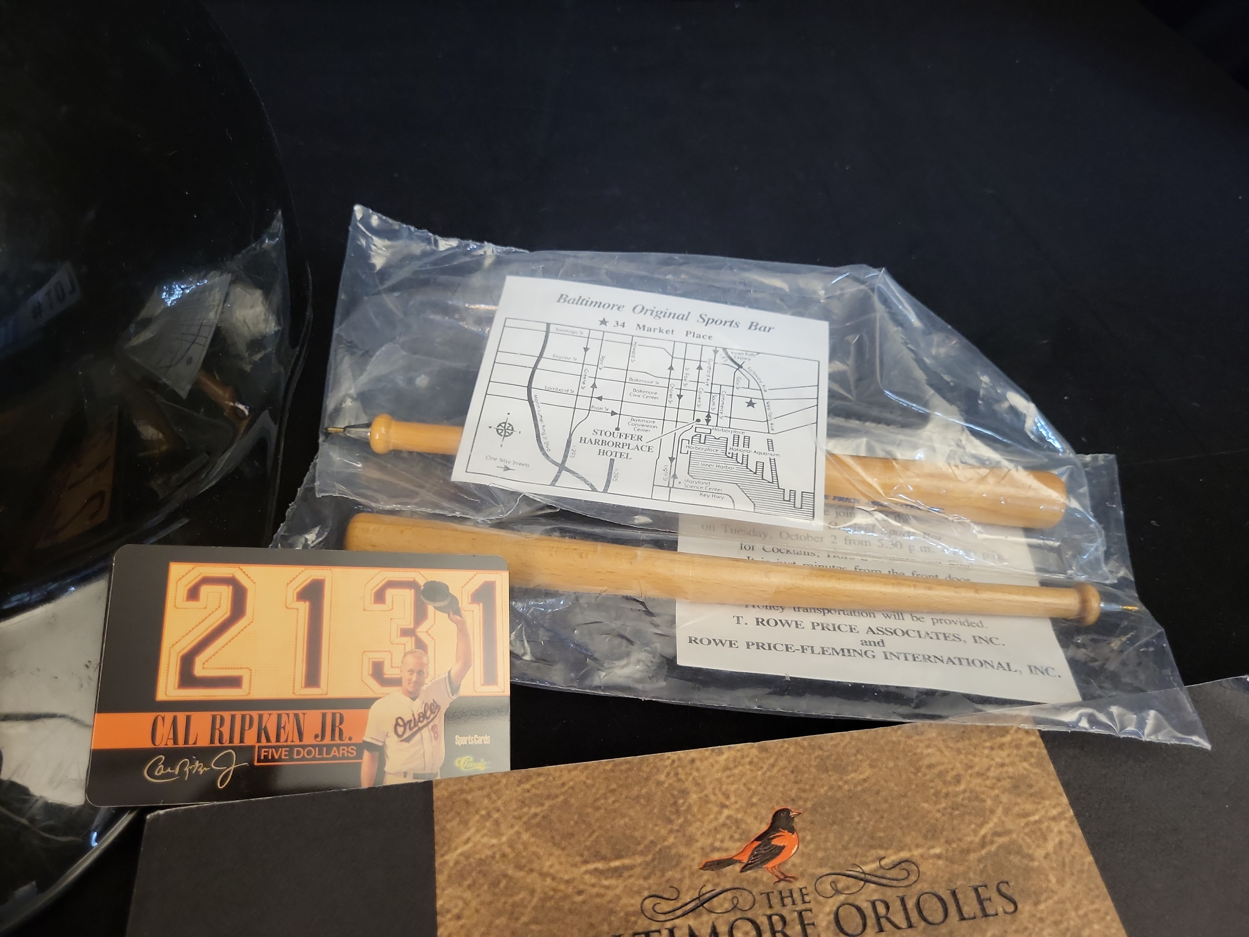 This lot features a collection of Baltimore Orioles commemorative memorabilia honoring Hall of Fame shortstop Cal Ripken Jr. The collection includes a black souvenir batting helmet with the team’s cartoon bird logo and two official programs. One program is the 1981-2001 Farewell Commemorative with a gold foil medallion, and the other is a black and gold script commemorative book. Also included are two miniature wooden baseball bat pens in their original promotional packaging for T. Rowe Price and the Baltimore Original Sports Bar. The lot is completed by a 2131 commemorative five-dollar card from SportsCards Classic. No hand-signed autographs are present; the signature on the card is a printed design element. No third-party certificates of authenticity are included. All items are mass-produced souvenirs and do not contain game-used components.