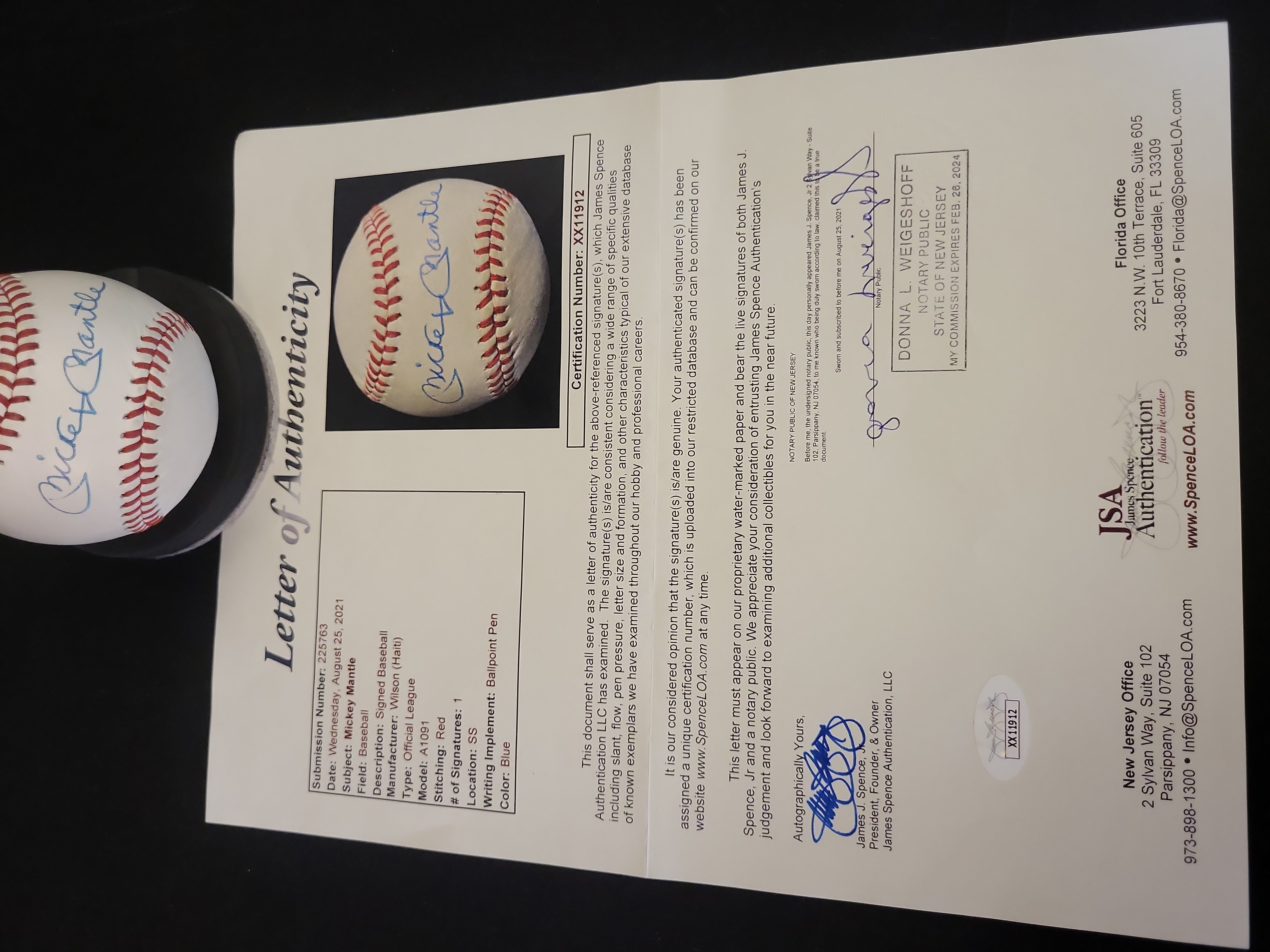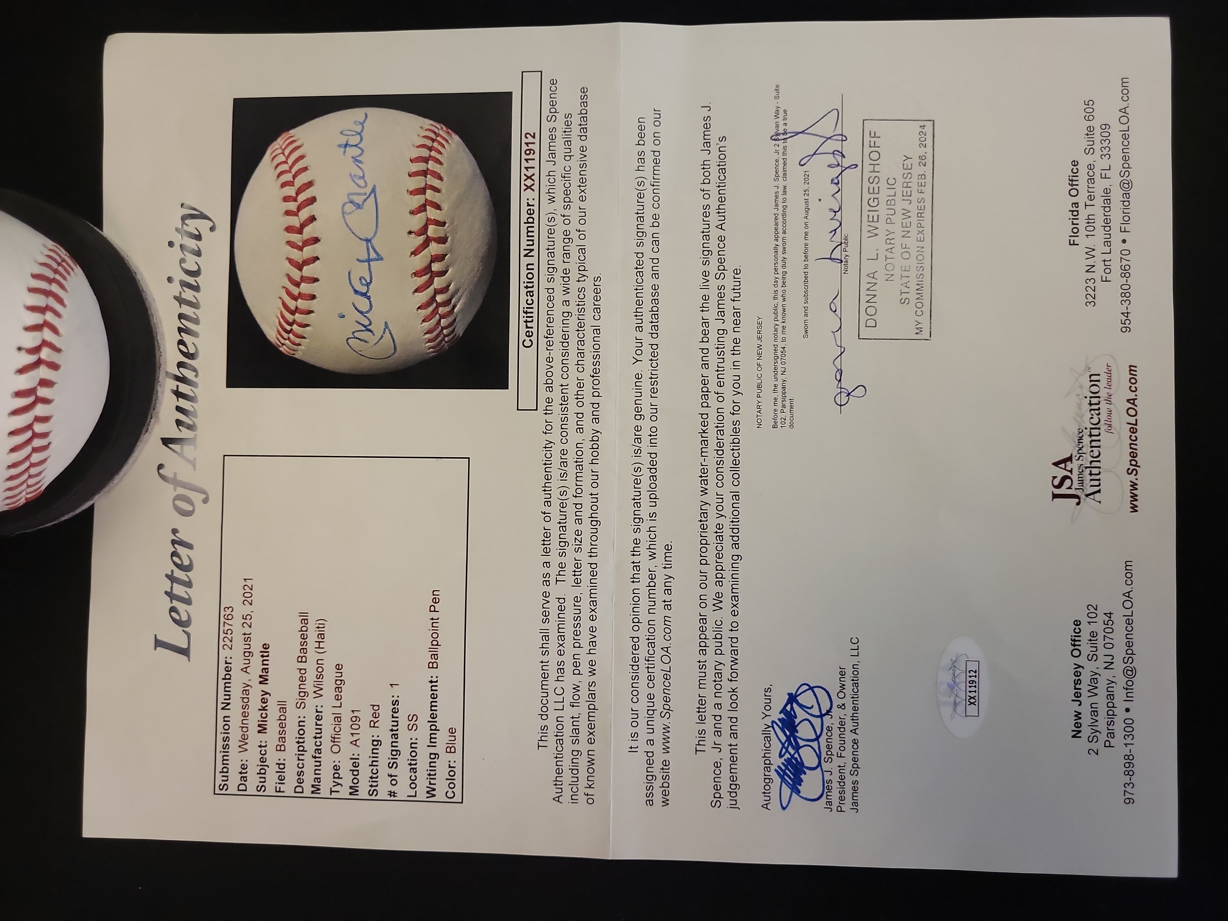 This is a premier sports memorabilia offering featuring a single-signed baseball from New York Yankees legend and Hall of Famer Mickey Mantle. The signature is expertly placed on the sweet spot of a Wilson Official League baseball, Model A1091, using a blue ballpoint pen. This item is accompanied by a full Letter of Authenticity from James Spence Authentication, JSA, certification number XX11912, dated August 25, 2021. The LOA includes a matching high-resolution photograph of the item and a notarized signature from the JSA staff. The baseball was manufactured in Haiti and features traditional red stitching. The lot includes a circular black plastic display stand and a clear globe-style display case with a gold-toned base.
