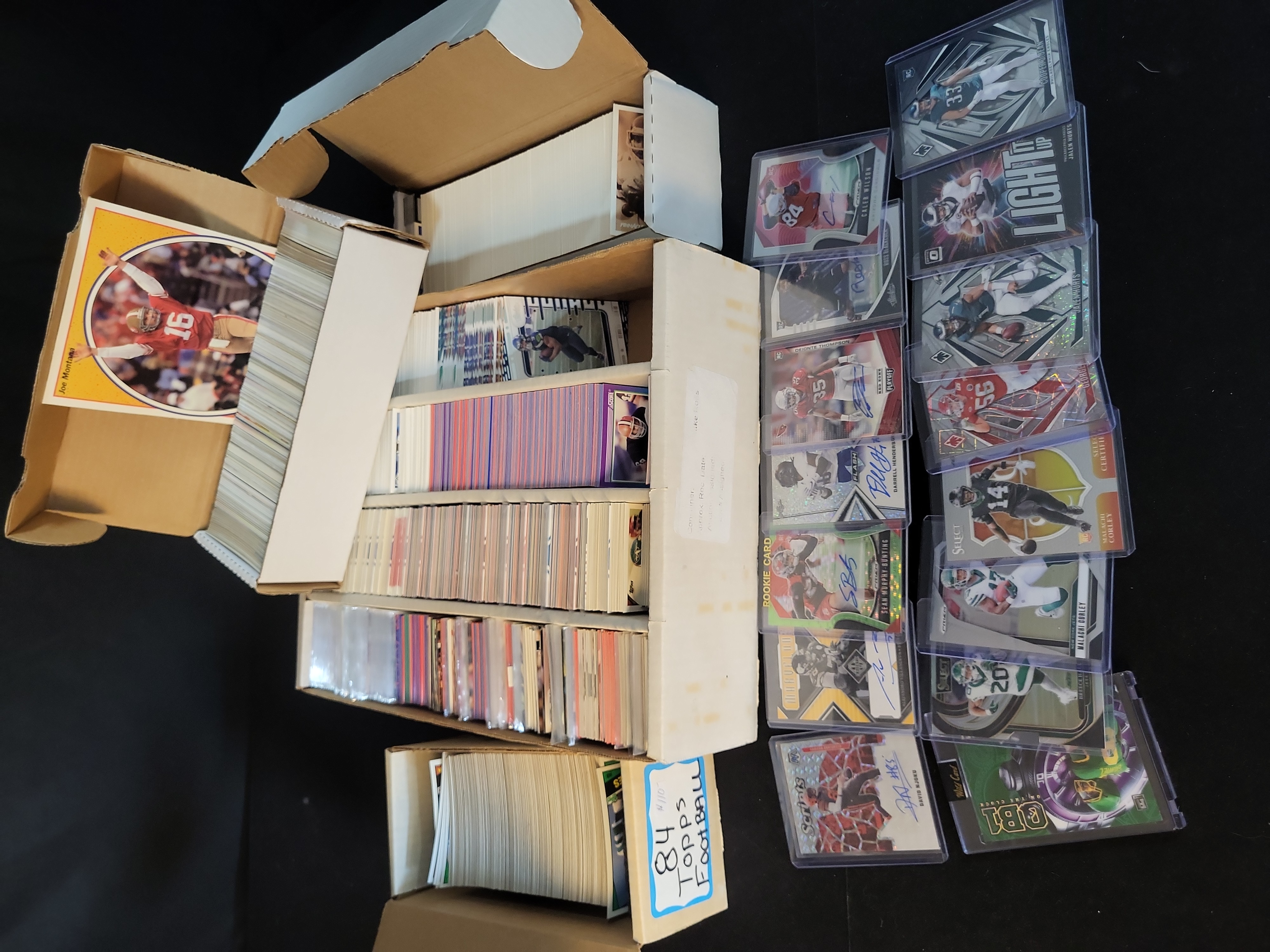 This comprehensive football trading card estate features a mix of vintage 1980s classics and modern Panini-era hits. Highlighted cards include a 2023 Panini Mosaic Scripts David Njoku Autograph (S-DN) Mosaic parallel, a 2019 Panini Prizm Sean Murphy-Bunting Rookie Autograph (322) Green Prizm parallel, and a 2020 Panini Phoenix Jalen Hurts Rookie Card (102). Additional key modern items include a 2022 Panini Select Breece Hall Rookie Card (245) Concourse Level Silver Prizm, a 2024 Panini Phoenix Cooper DeJean Rookie Card (133), and a 2021 Panini Donruss Optic Jalen Hurts Light It Up Insert (LI-JH). The autograph selection further includes a 2018 Panini Absolute Alejandro Villanueva, 2019 Leaf Flash Darrell Henderson Blue Flash, 2019 Panini Playoff Deionte Thompson Red Zone, 2020 Panini Absolute Ross Blacklock (168), and 2019 Panini Prizm Caleb Wilson (346). Notable inserts feature 2024 Panini Prizm Draft Picks Malachi Corley Silver, 2024 Panini Select Draft Picks Malachi Corley Certified, 2022 Panini Phoenix George Karlaftis Fire parallel, and a 2024 Wild Card QB1 On The Clock. The vintage portion is headlined by a 1984 Topps Joe Montana (16) Oversized Super Print and a dedicated box of 1984 Topps Football containing several hundred cards from the set. The collection is rounded out by a 4-row monster box containing approximately 3,000 to 4,000 cards from 2018-2024, including brands such as Score, Panini Absolute, Phoenix, and Prestige.
