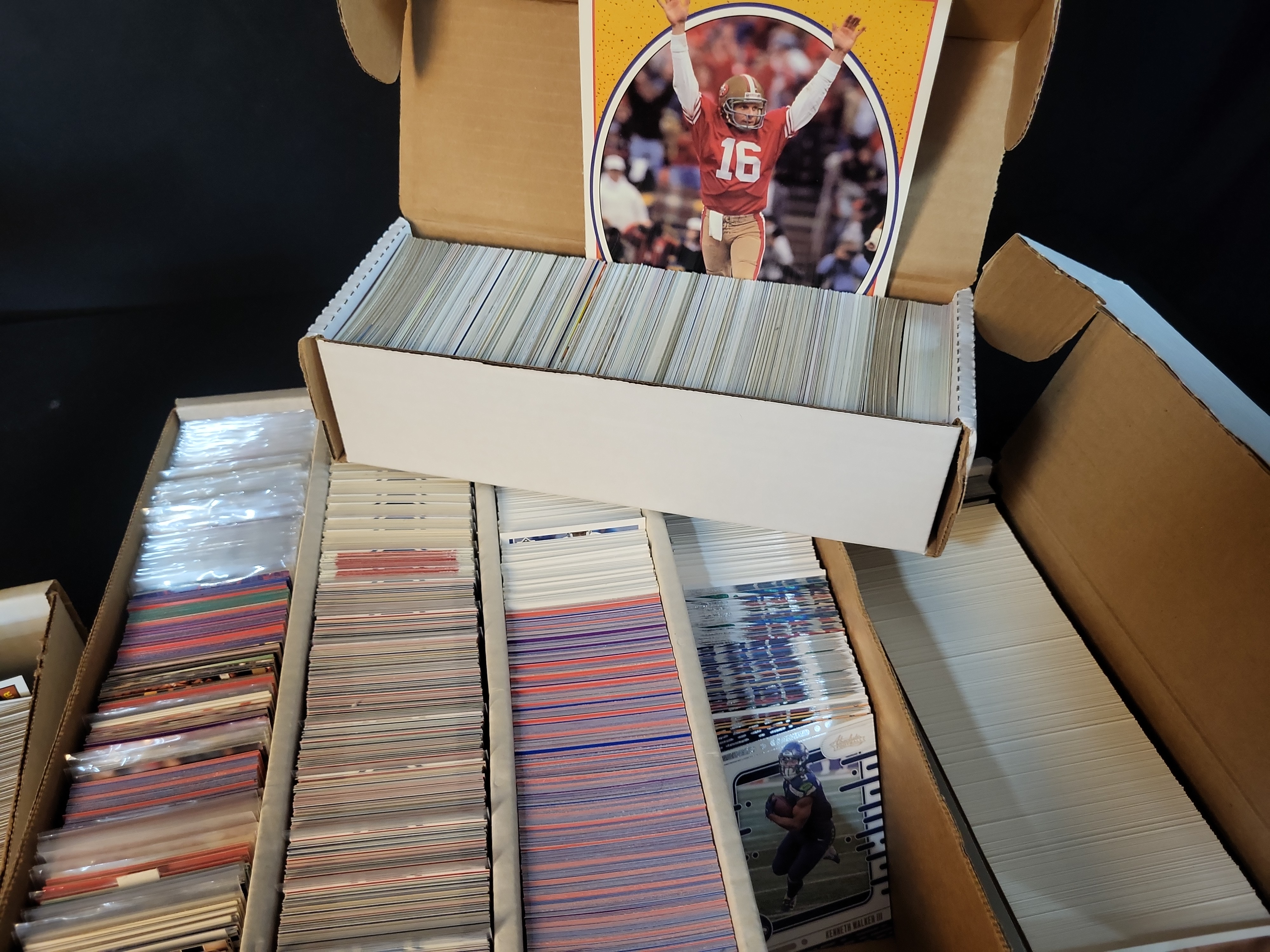 Centering: Generally excellent on highlights; 2020 Jalen Hurts RC favors the left, 2019 Sean Murphy-Bunting favors top-to-bottom. Corners: Sharp on all top-loaded cards. Edges: Clean and well-preserved. Surface: High-gloss finishes on modern Prizm and Optic cards are free of major scratches; vintage Montana Super Print displays vibrant color. The collection is un-graded and appears to range from Near Mint to Mint for protected cards. Bulk cards are neatly organized and well-maintained.