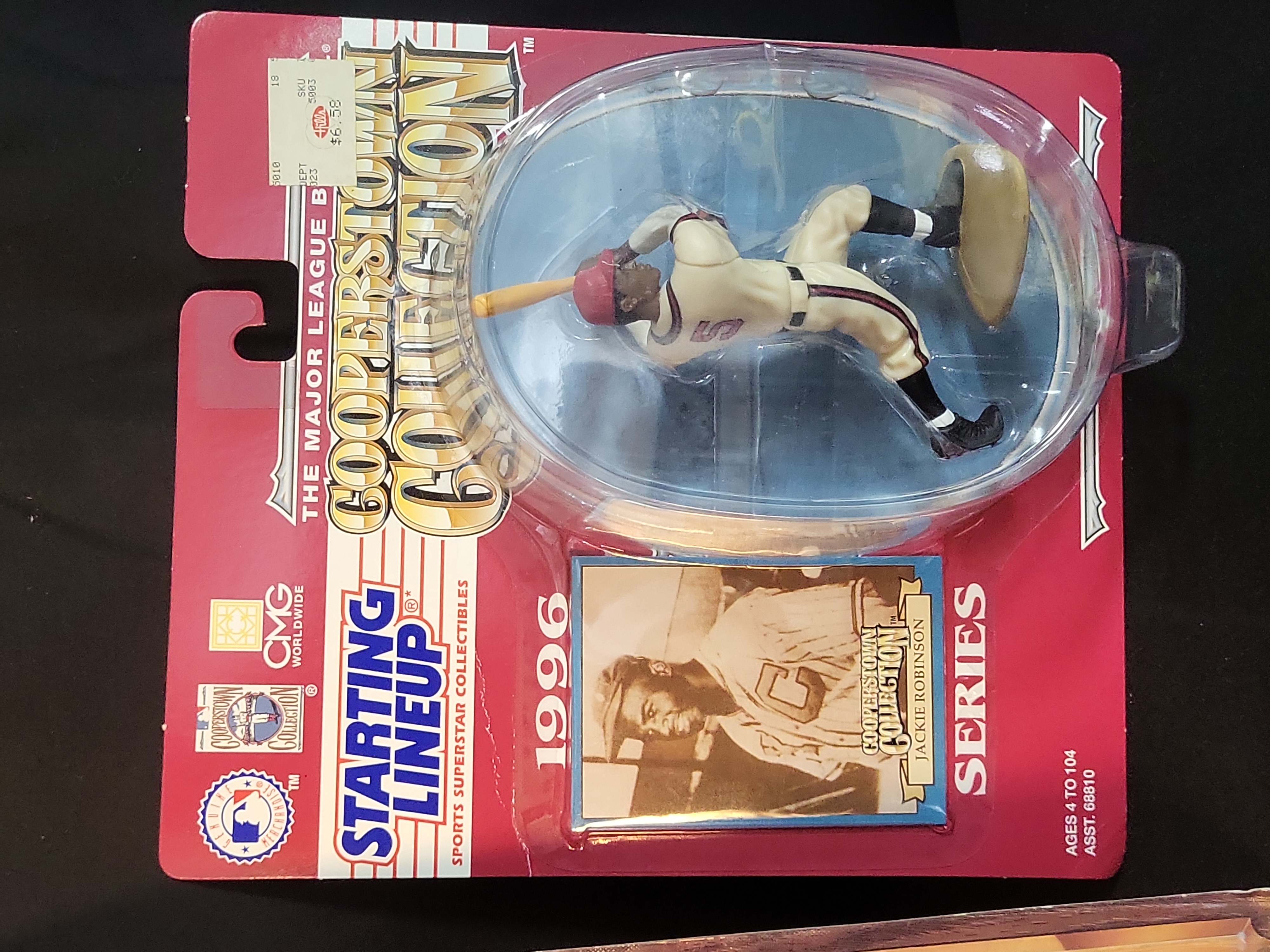 This lot features a collection of three vintage Kenner Starting Lineup baseball action figure sets celebrating legendary Major League Baseball Hall of Fame players. The collection includes the 1989 Baseball Greats double pack featuring New York Yankees icons Mickey Mantle and Joe DiMaggio, complete with their respective collector trading cards. Also included are two figures from the 1996 Cooperstown Collection series: Jackie Robinson of the Brooklyn Dodgers and Mel Ott of the New York Giants. Each set remains in its original factory-sealed blister packaging and includes an exclusive collector trading card. These items are mass-produced retail collectibles and do not contain autographs, third-party authentication, or game-used materials.