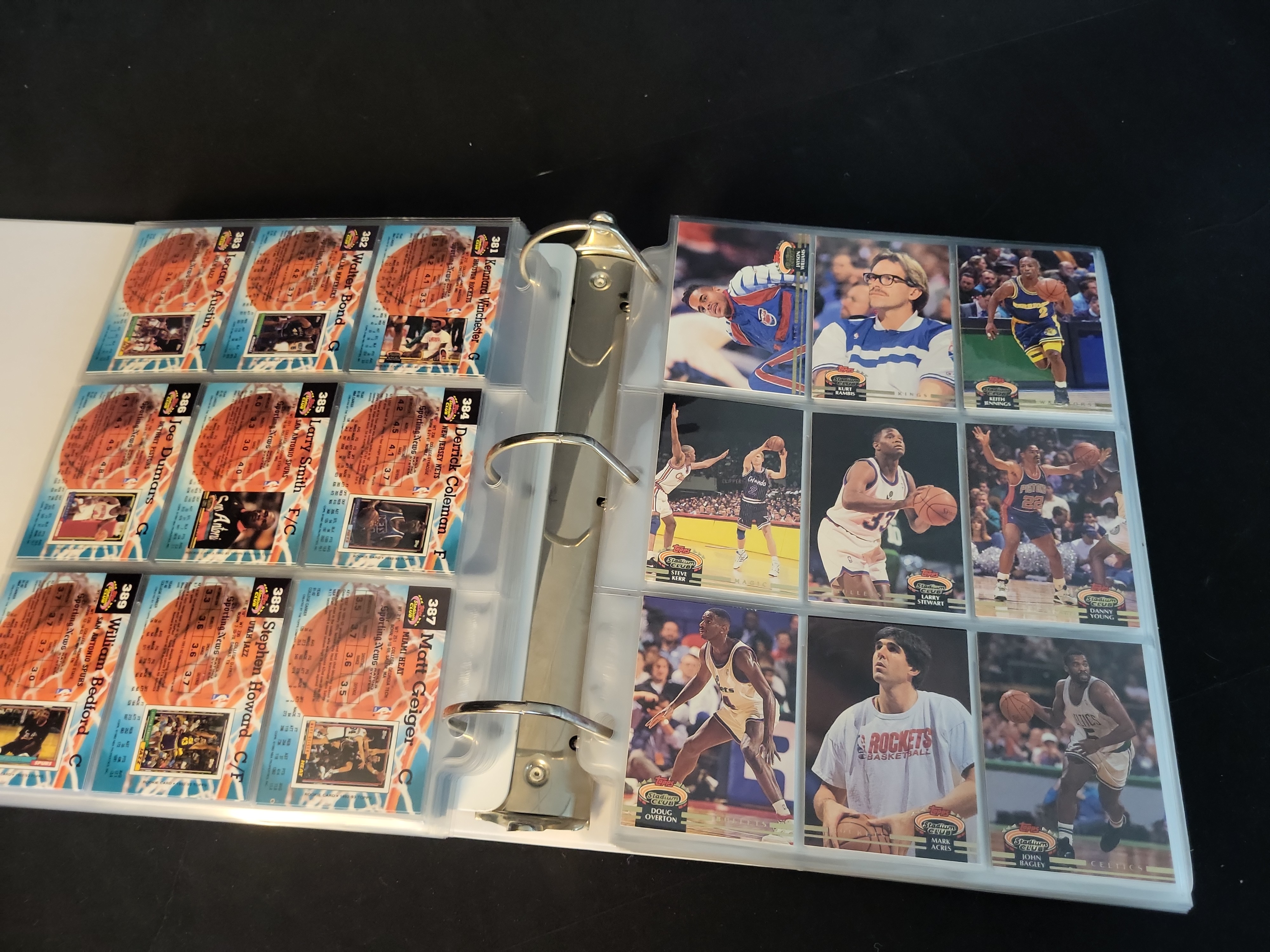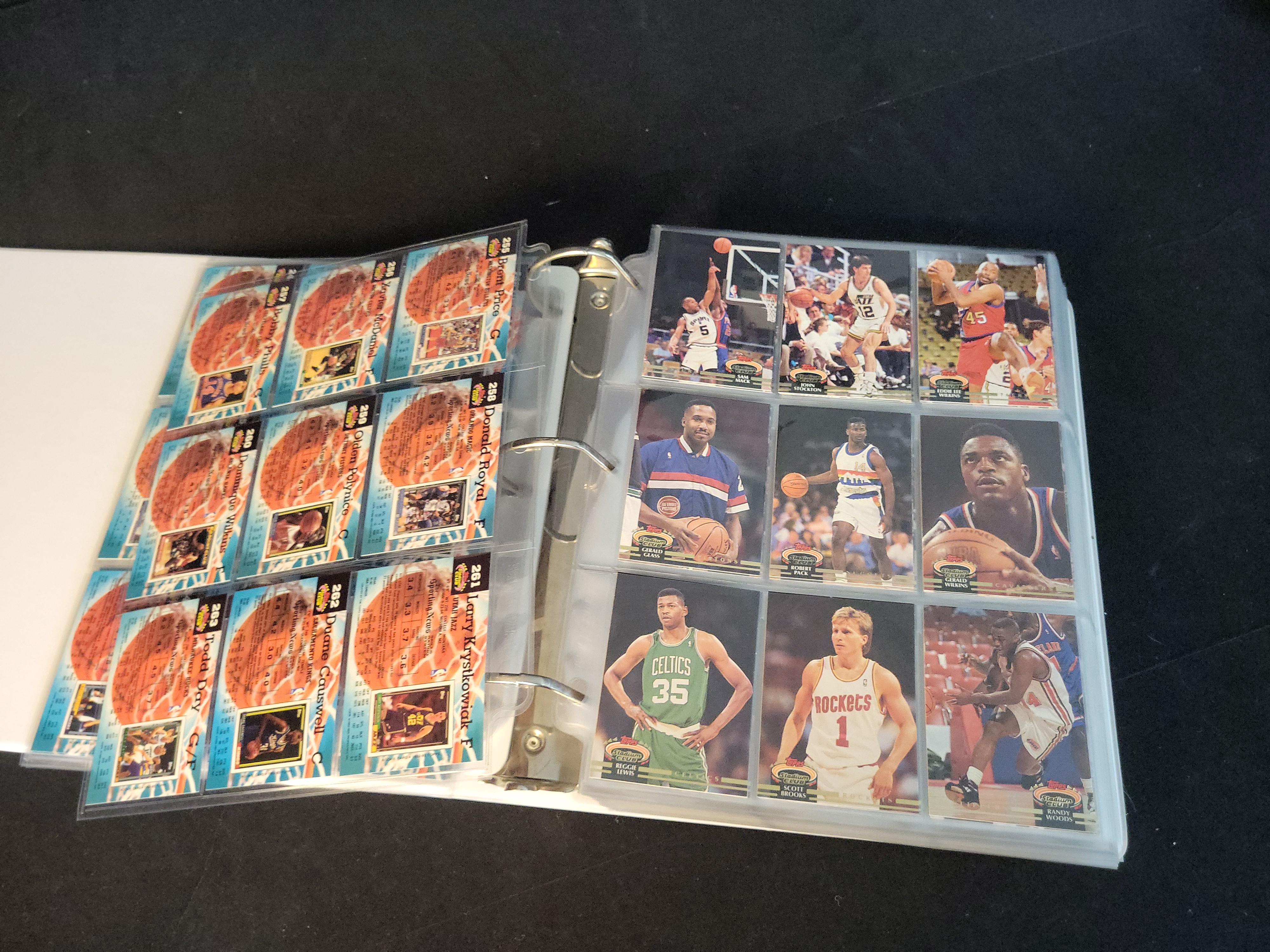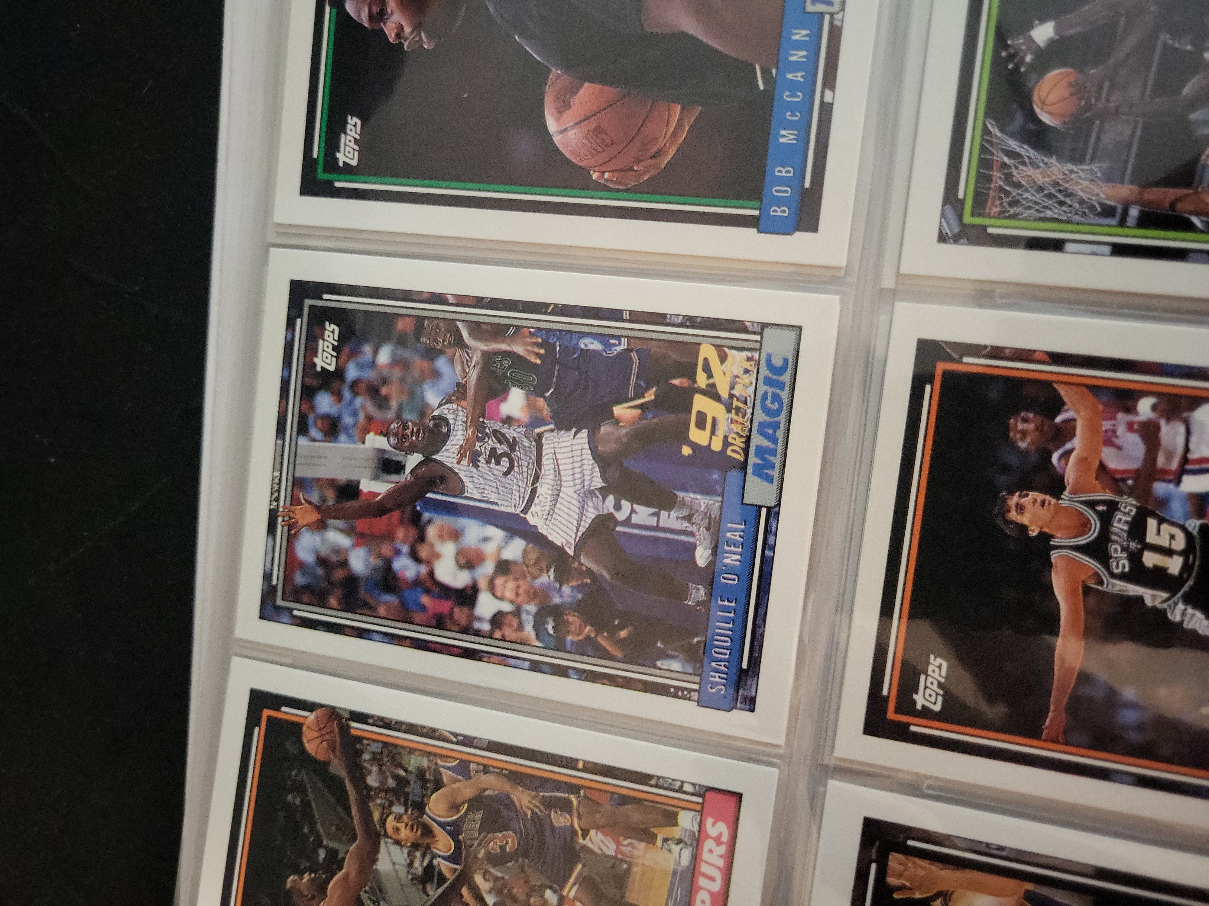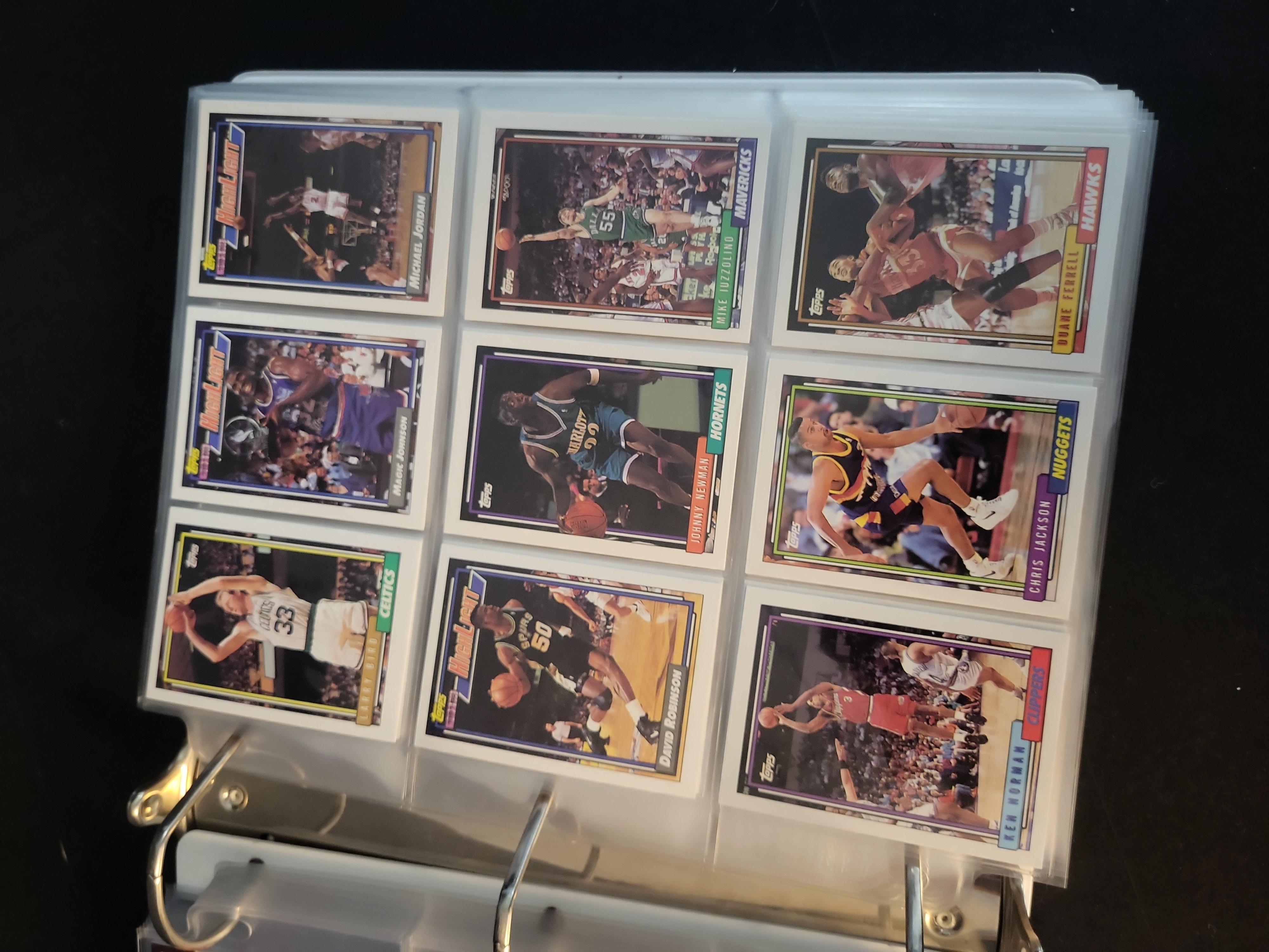 This professional collection features a significant assembly of 1990s NBA trading cards, primarily focused on the 1991-92 Topps and 1992-93 Topps Stadium Club sets. Major highlights include the 1992-93 Topps Gold Shaquille O’Neal rookie card number 362 and the 1992-93 Topps Stadium Club Michael Jordan Member’s Choice number 1. The collection includes a 1991-92 Topps Michael Jordan subset trio featuring card number 54 Highlight, number 31 All-Star, and number 53 50 Point Club. Research indicates the inclusion of later decade highlights such as the 1998-99 Topps Dirk Nowitzki rookie card number 154 and 1994-95 Jason Kidd rookie cards. The lot contains a near-complete Stadium Club Member’s Choice subset and extensive 1991-92 Topps subsets featuring Hall of Famers Larry Bird, Scottie Pippen, Charles Barkley, David Robinson, John Stockton, Hakeem Olajuwon, and Magic Johnson. The cards are organized in a white three-ring binder with multi-card protective sleeves.