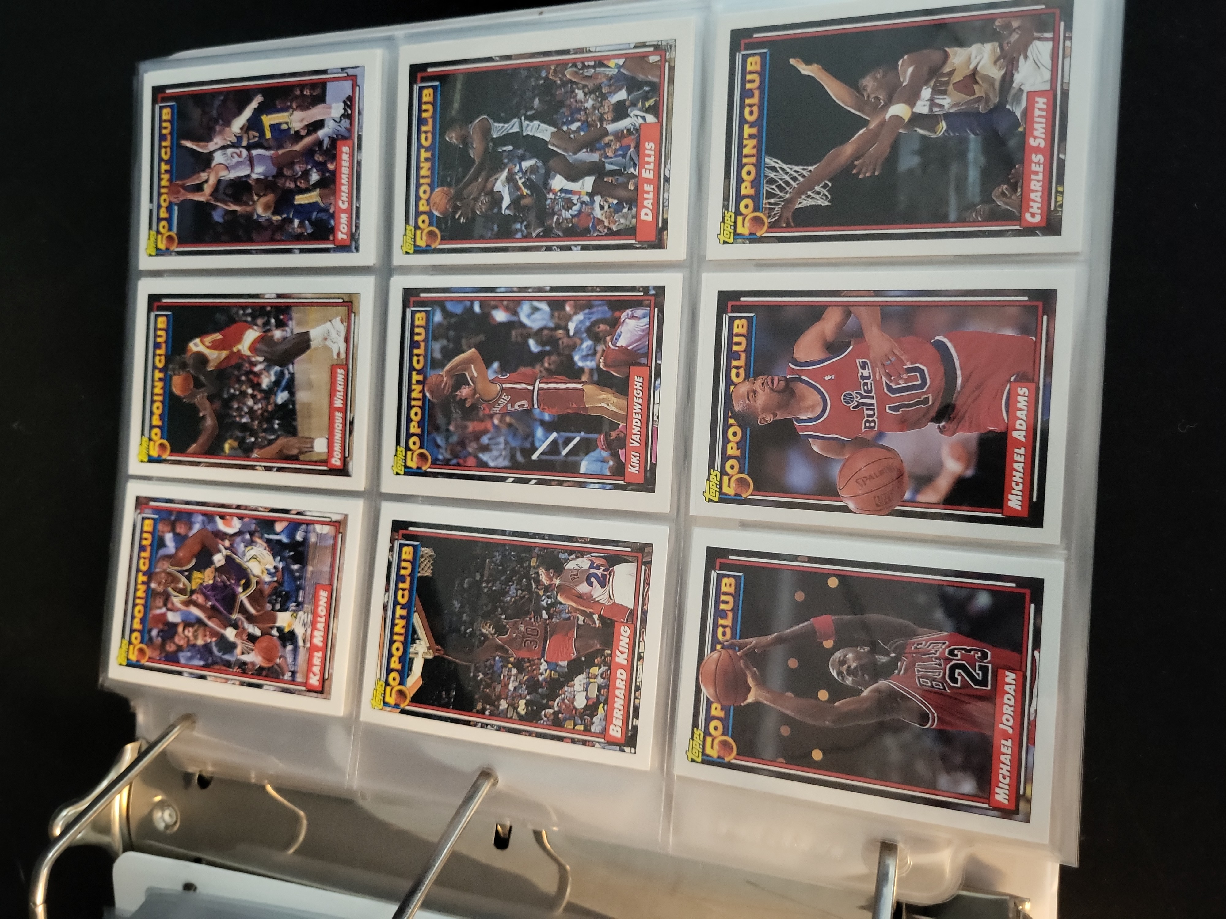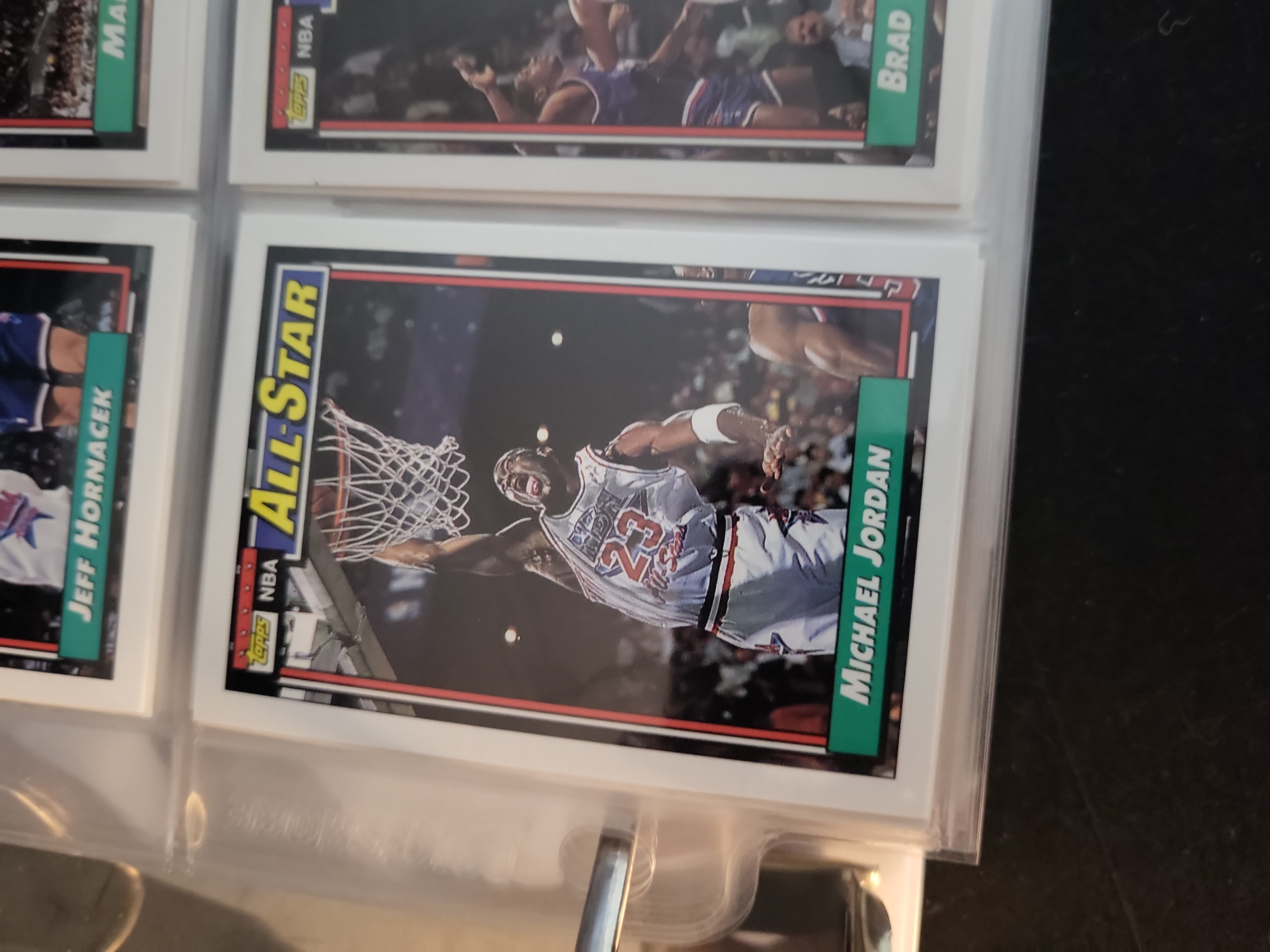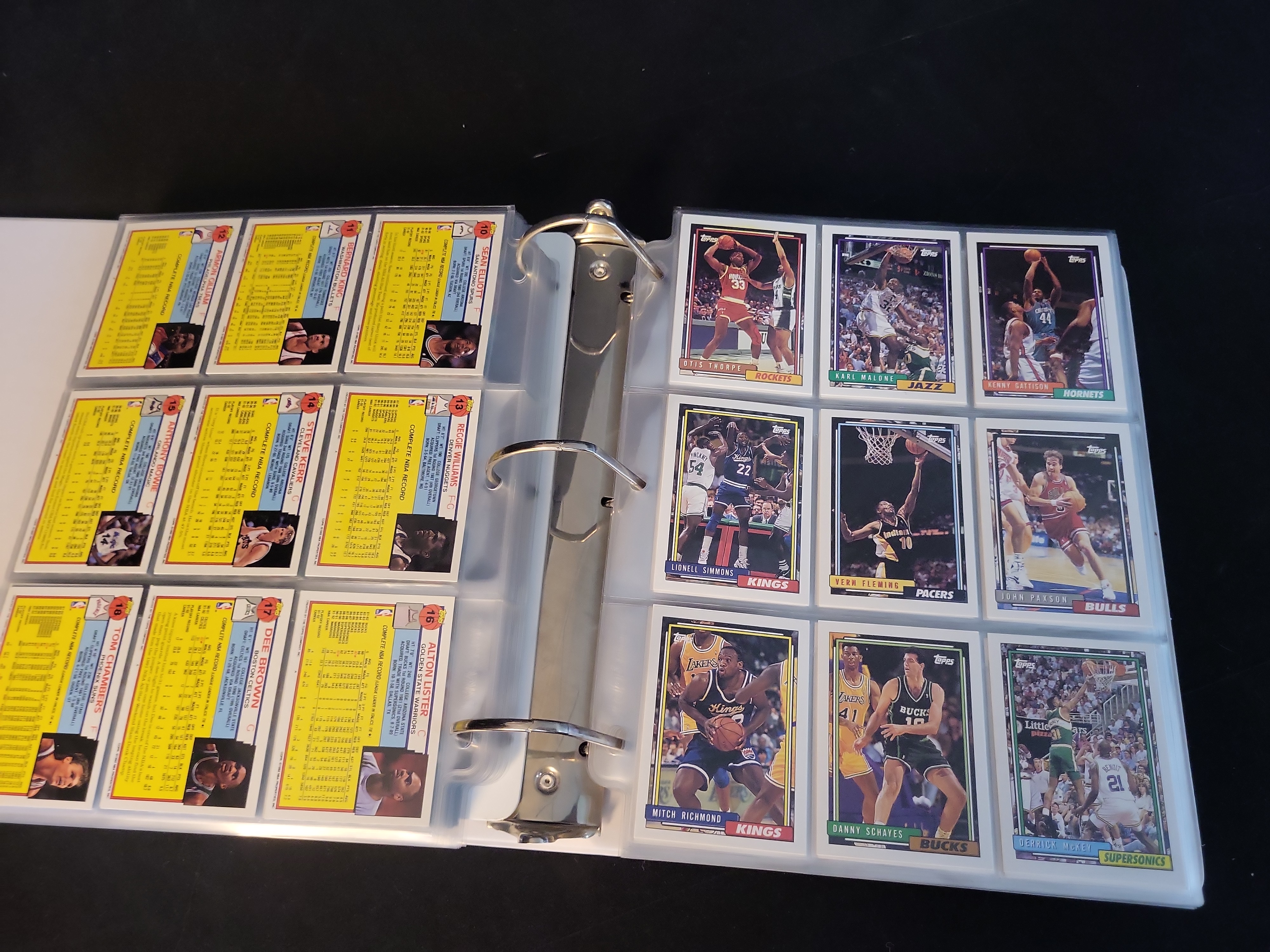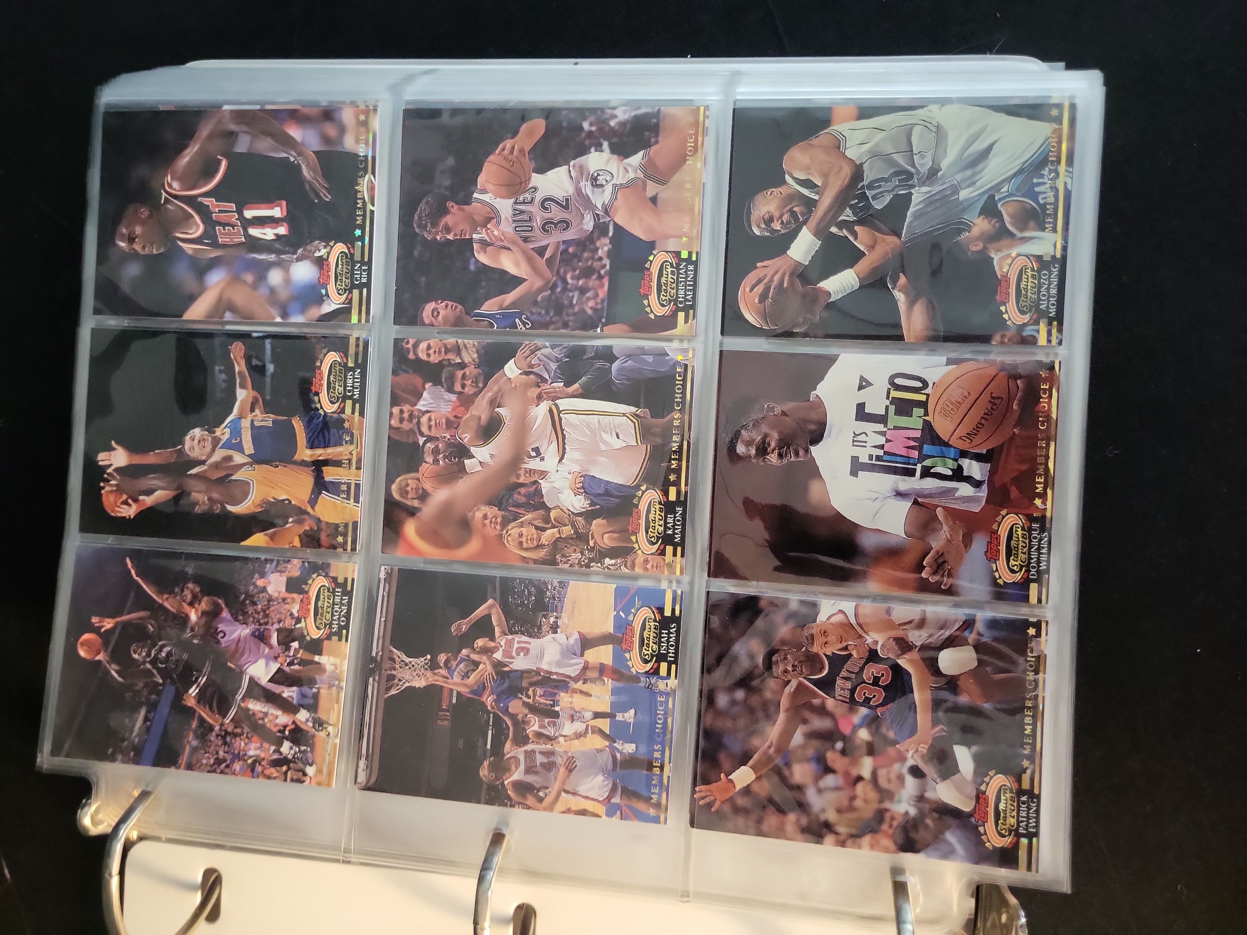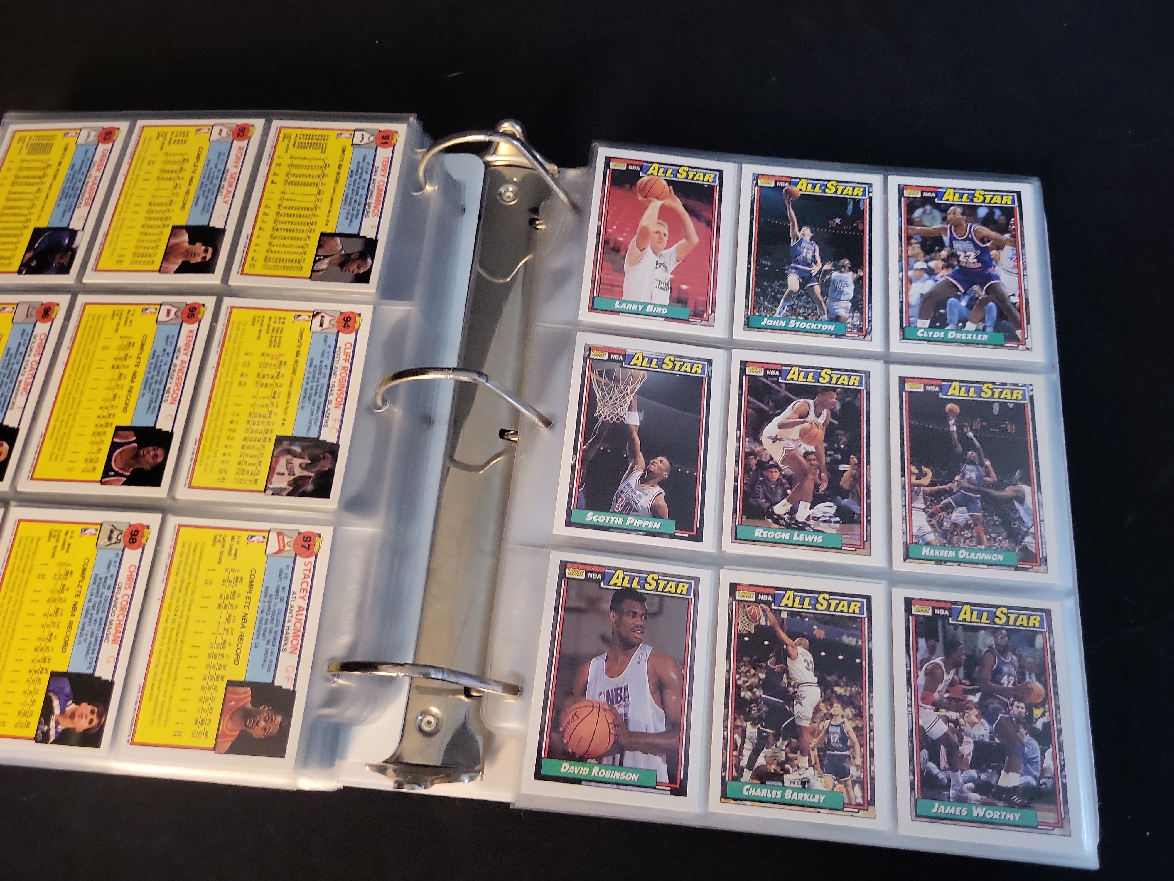 This professional collection features a significant assembly of 1990s NBA trading cards, primarily focused on the 1991-92 Topps and 1992-93 Topps Stadium Club sets. Major highlights include the 1992-93 Topps Gold Shaquille O’Neal rookie card number 362 and the 1992-93 Topps Stadium Club Michael Jordan Member’s Choice number 1. The collection includes a 1991-92 Topps Michael Jordan subset trio featuring card number 54 Highlight, number 31 All-Star, and number 53 50 Point Club. Research indicates the inclusion of later decade highlights such as the 1998-99 Topps Dirk Nowitzki rookie card number 154 and 1994-95 Jason Kidd rookie cards. The lot contains a near-complete Stadium Club Member’s Choice subset and extensive 1991-92 Topps subsets featuring Hall of Famers Larry Bird, Scottie Pippen, Charles Barkley, David Robinson, John Stockton, Hakeem Olajuwon, and Magic Johnson. The cards are organized in a white three-ring binder with multi-card protective sleeves.