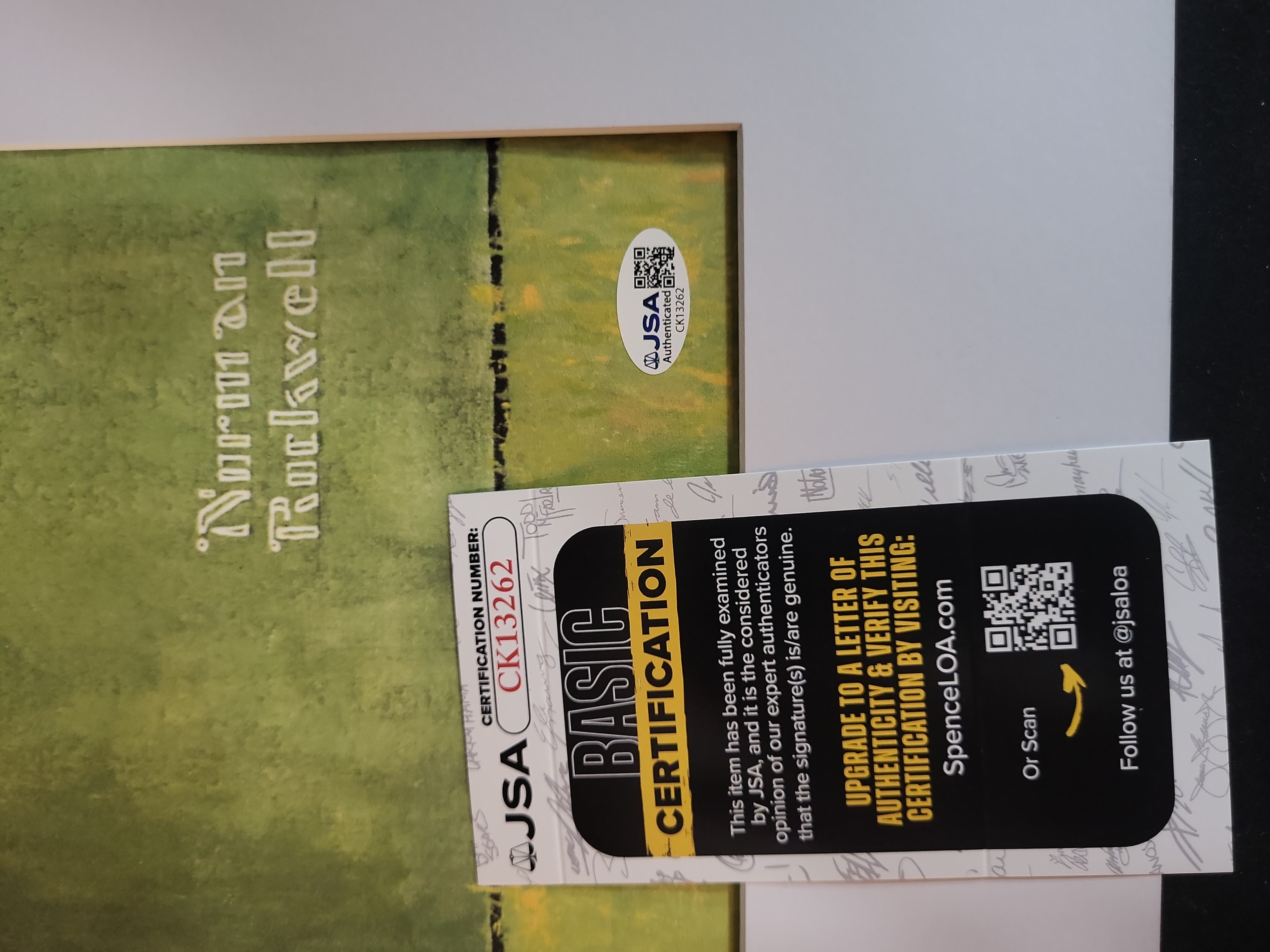 This lot features a hand-signed reproduction print of the celebrated Norman Rockwell painting titled "Gee Thanks, Brooks, " featuring Baltimore Orioles legend and Hall of Famer Brooks Robinson. The artwork captures a classic Americana scene of Robinson signing autographs for fans; notably, Rockwell included a self-portrait of himself as the man smoking a cigar in the upper-left corner. This specific piece carries significant historical provenance, having been commissioned in 1971 by Figgie International (the parent company of Rawlings and Adirondack) to commemorate Robinson’s 1970 World Series MVP honors. The print is hand-signed by Brooks Robinson in vibrant blue ink with a comprehensive inscription reading: "My Best Always, Brooks Robinson, Hall of Fame 1983." The piece is double-authenticated, featuring a JSA (James Spence Authentication) Basic Certification sticker (Cert #CK13262) with a matching COA card, as well as a "Brooks C. Robinson Norman Rockwell Reproduction Certificate of Authenticity" that is also hand-signed by Robinson. The print comes professionally matted and is ready for framing.