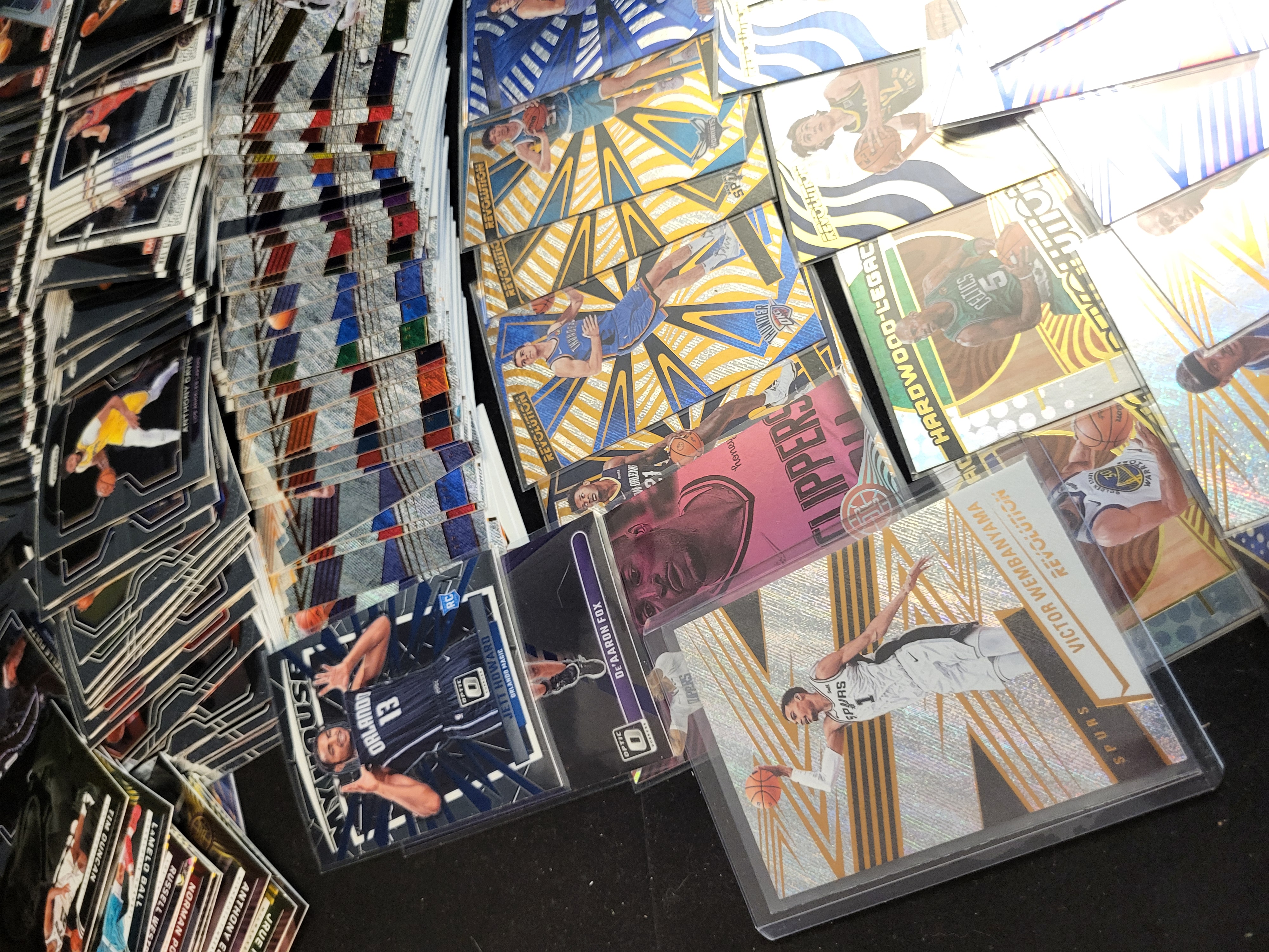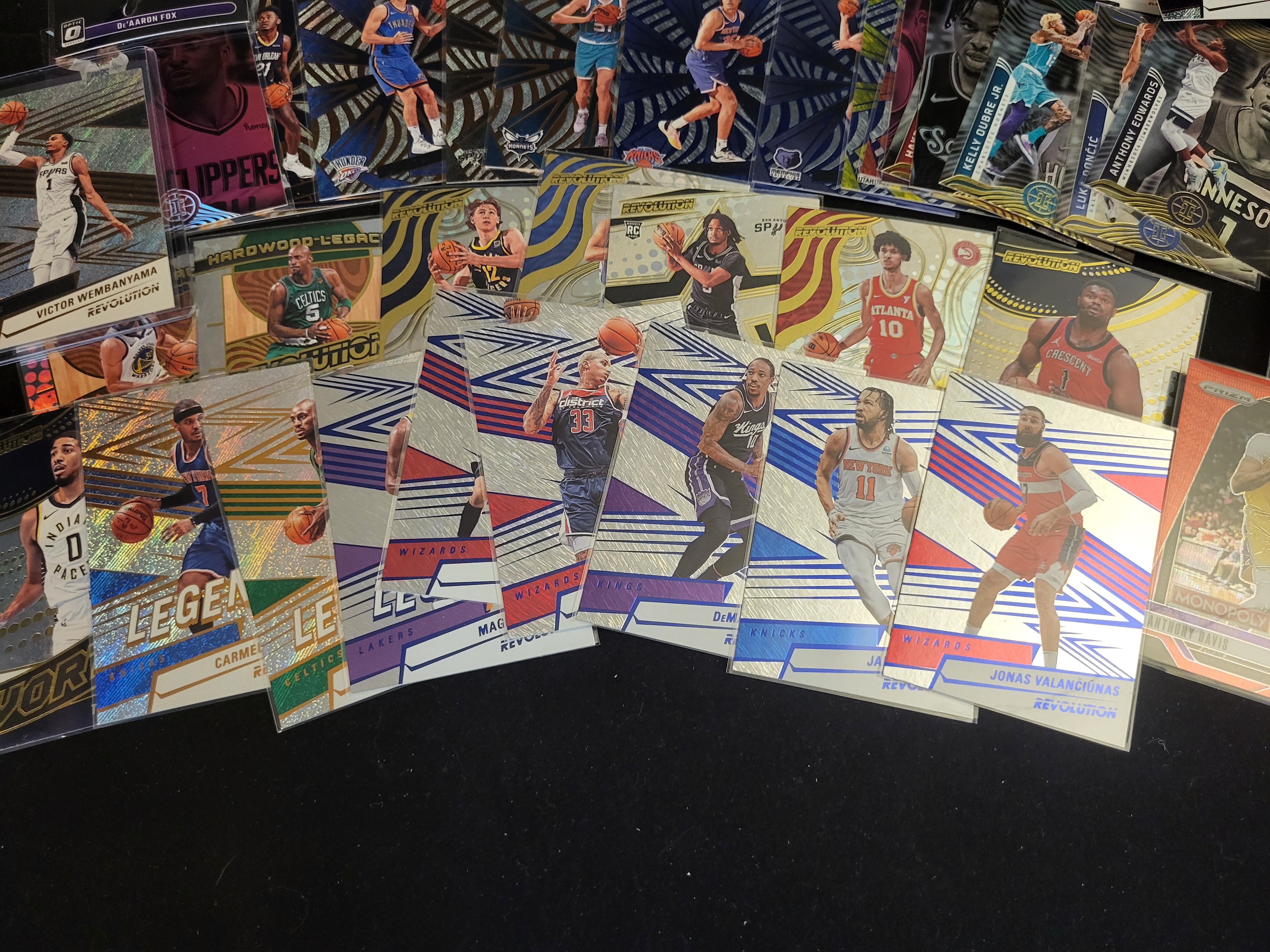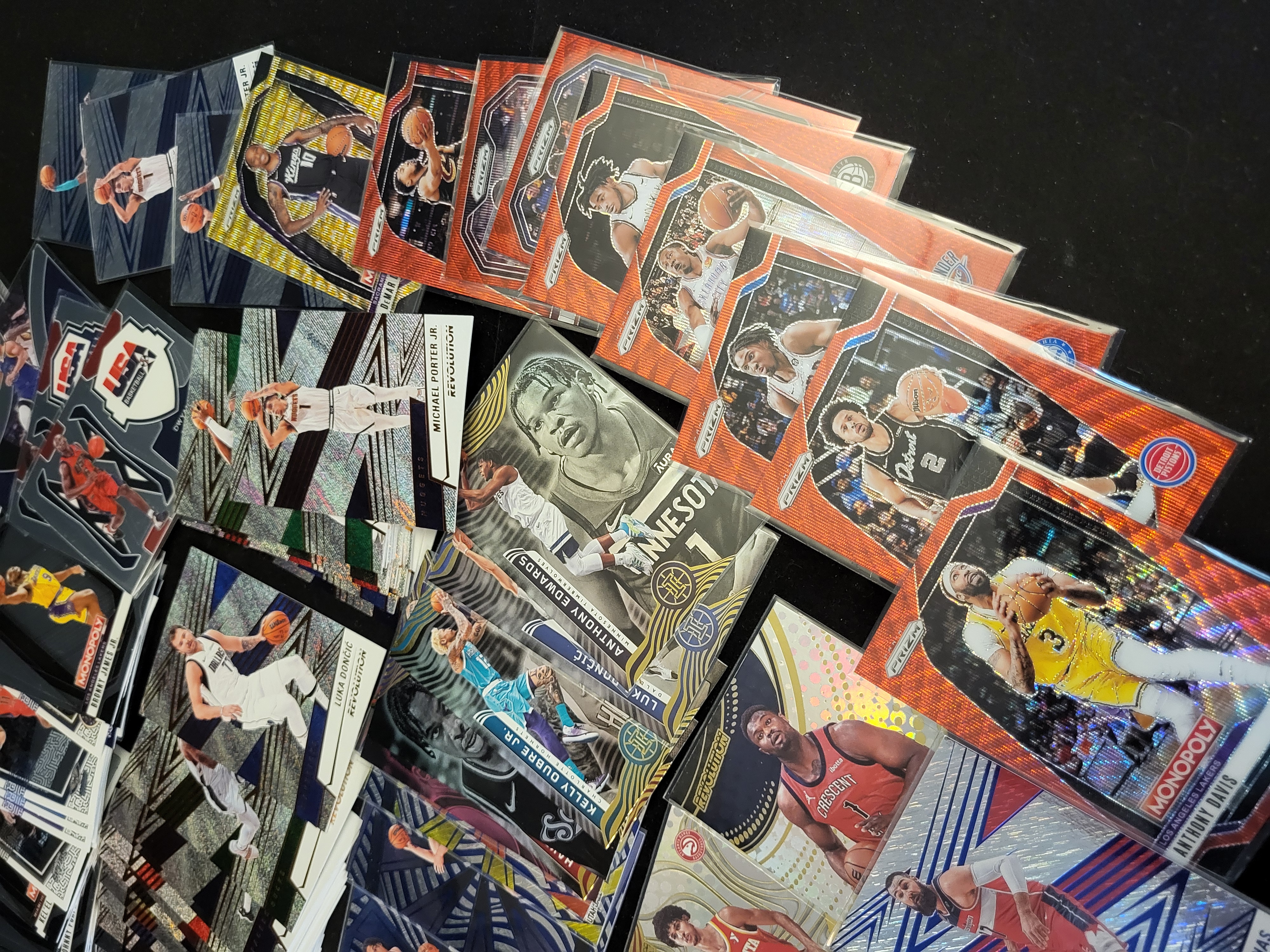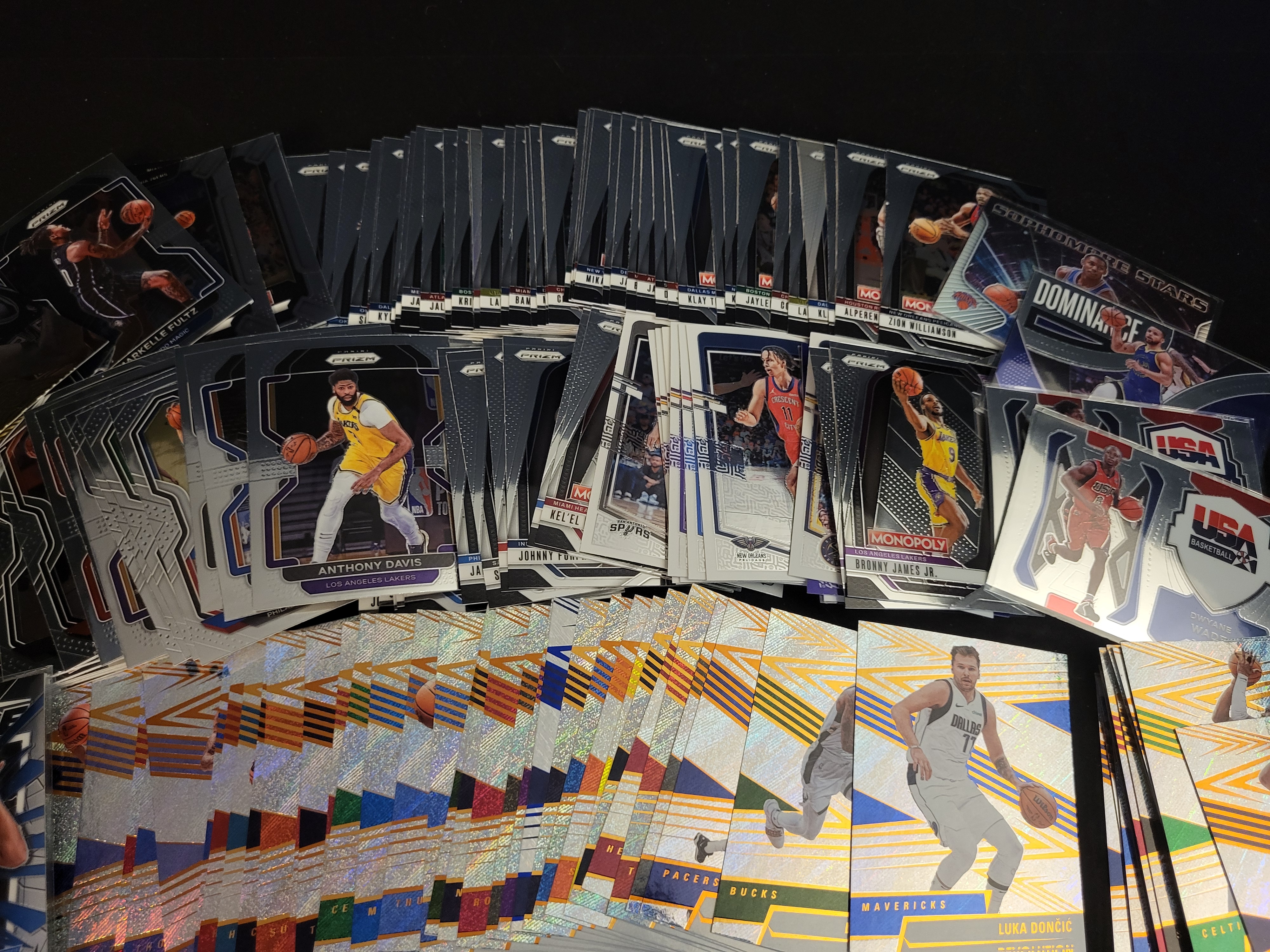 A large assortment of contemporary NBA basketball trading cards produced by Panini. The collection includes various series such as Prizm, Revolution, Illusions, Optic, and Donruss. Featured players include Victor Wembanyama, Anthony Davis, Luka Dončić, Anthony Edwards, Bronny James Jr., and others. The lot contains a variety of base cards, inserts, and parallels characterized by holographic, patterned, and chrome-like finishes. Specific sub-series markings include Hardwood Legacy, My House, USA Basketball, and Monopoly. Several cards are housed in individual protective top loaders and soft sleeves, while the remainder are organized in loose stacks.
