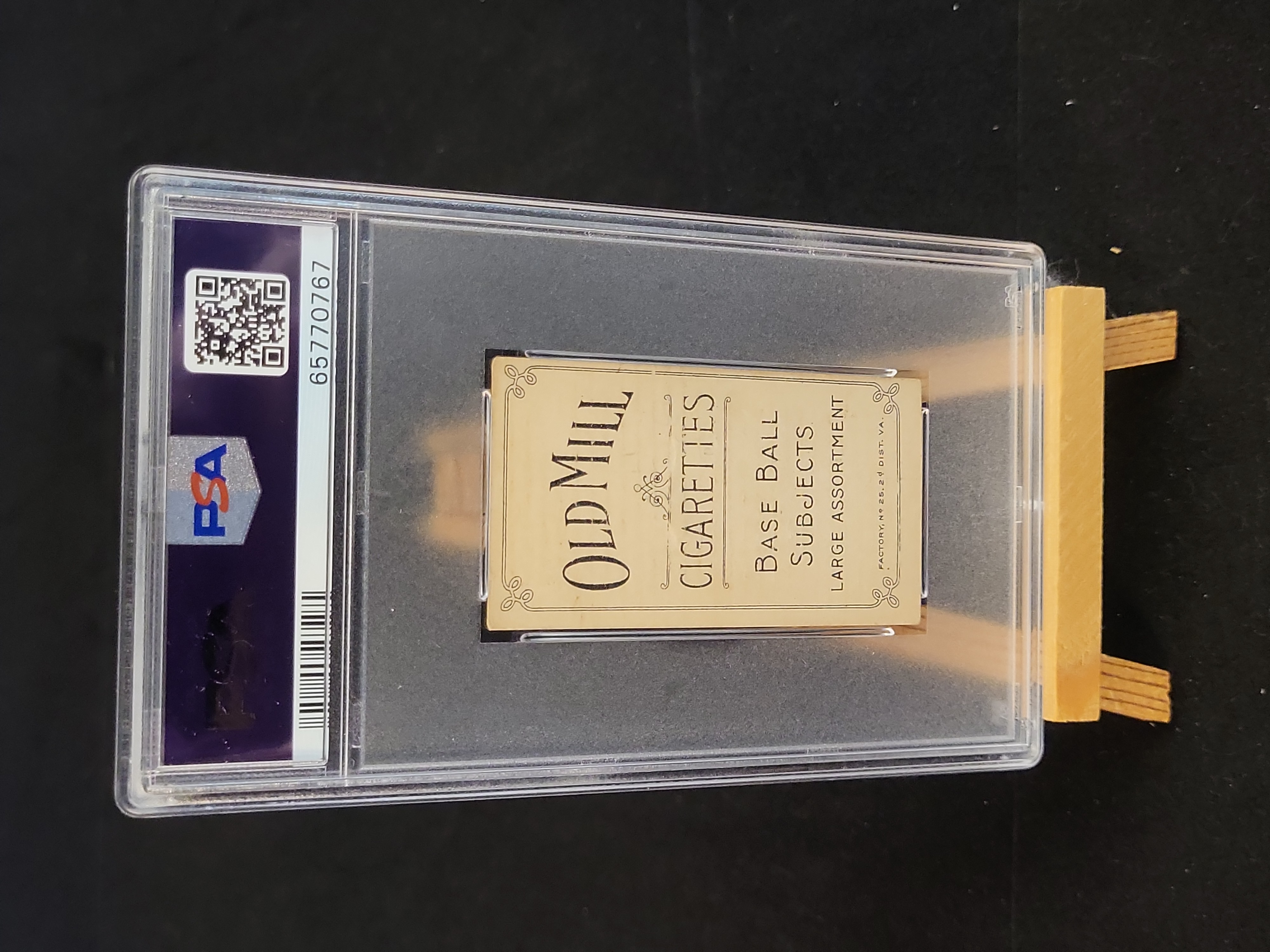 This is an authentic 1909-1911 T206 "White Border" tobacco card featuring Wid Conroy of the Washington Nationals. This specimen depicts the "Fielding" variant, notable for its horizontal orientation which distinguishes it from the standard vertical poses of the era. The card features the scarcer Old Mill Cigarettes advertisement on the reverse, designated as Factory No. 25, 2d Dist. VA. The T206 set is the cornerstone of vintage baseball card collecting, and examples with "minor" tough backs like Old Mill are highly sought after by set completionists and back-brand specialists. The card is housed in a modern PSA holder with a black internal gasket designed specifically for the tobacco card format.