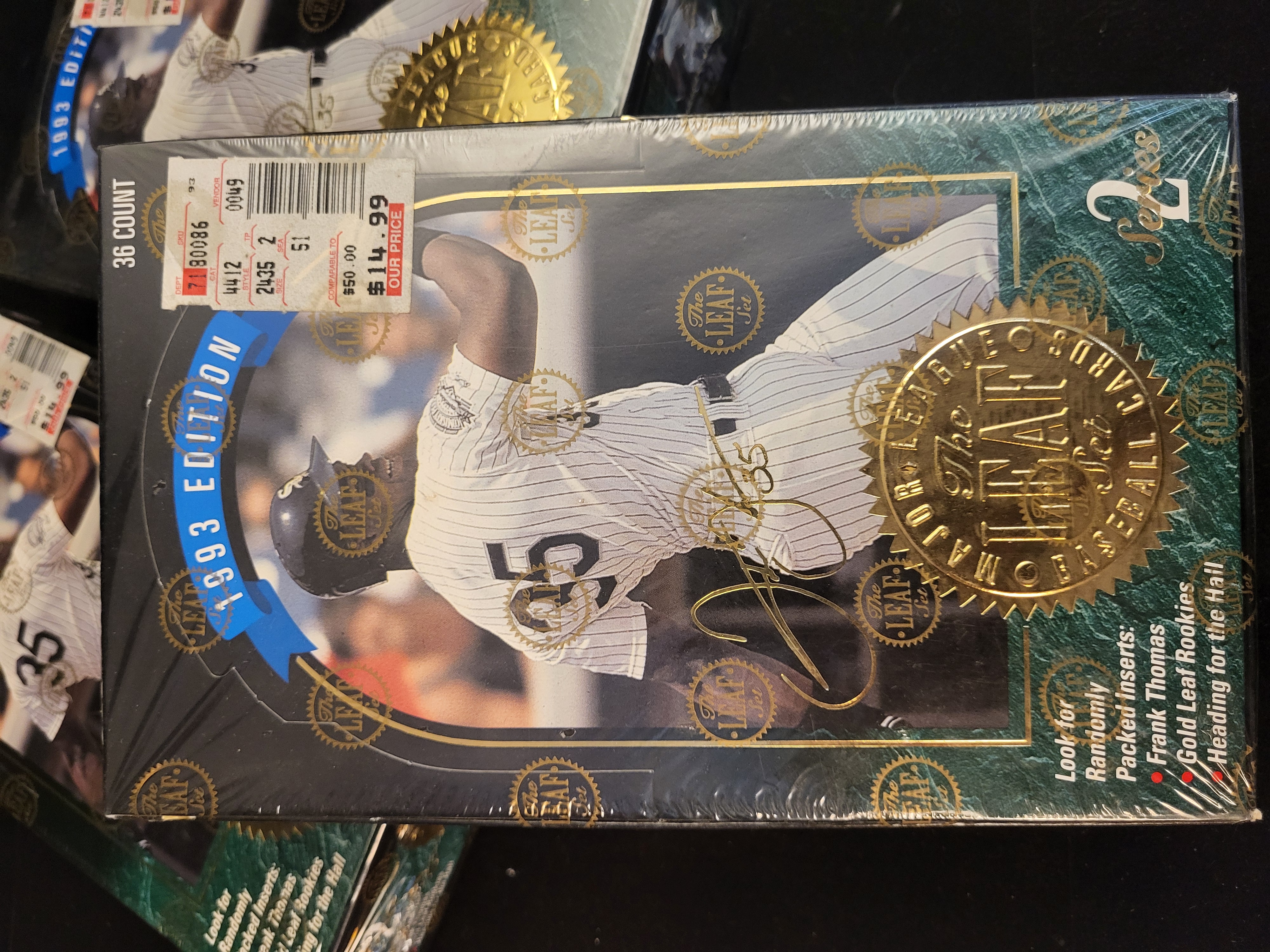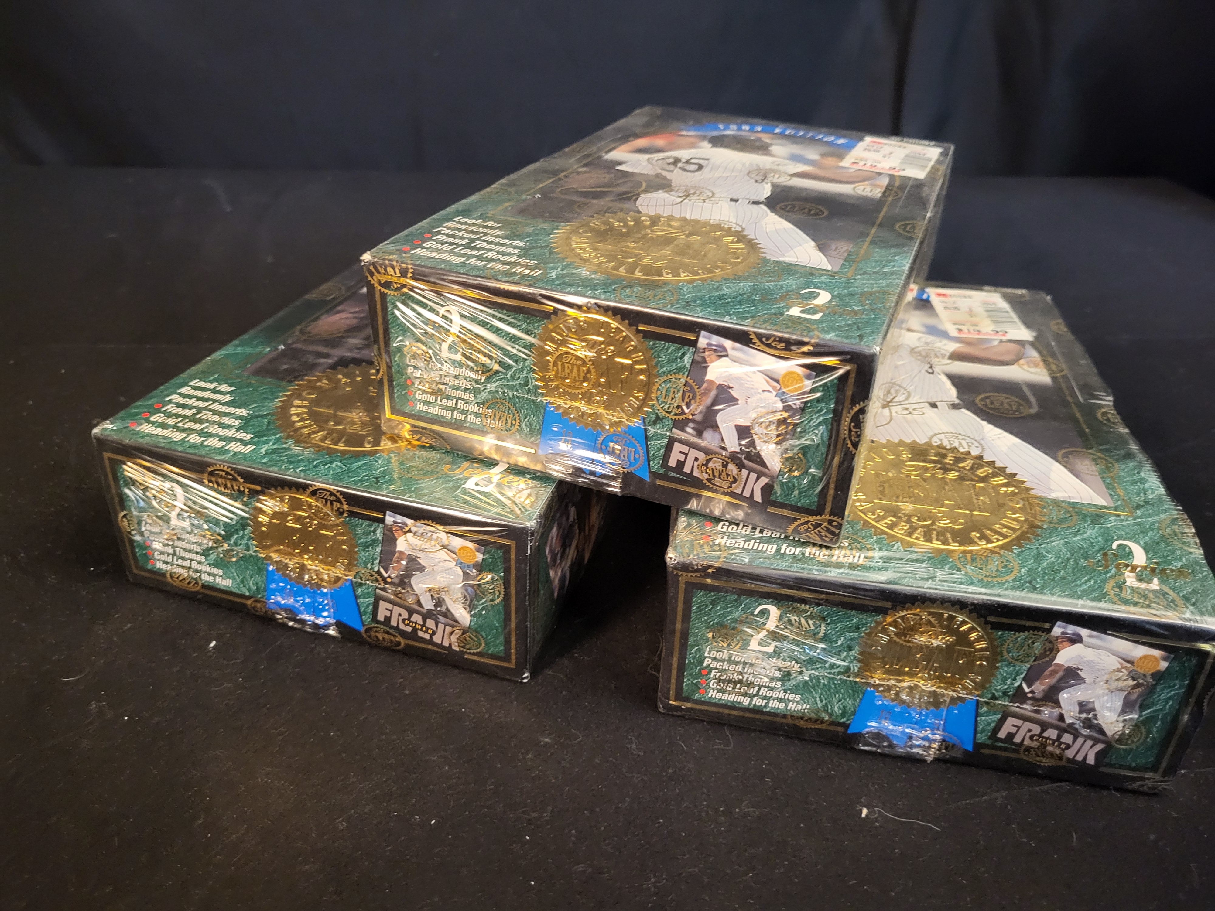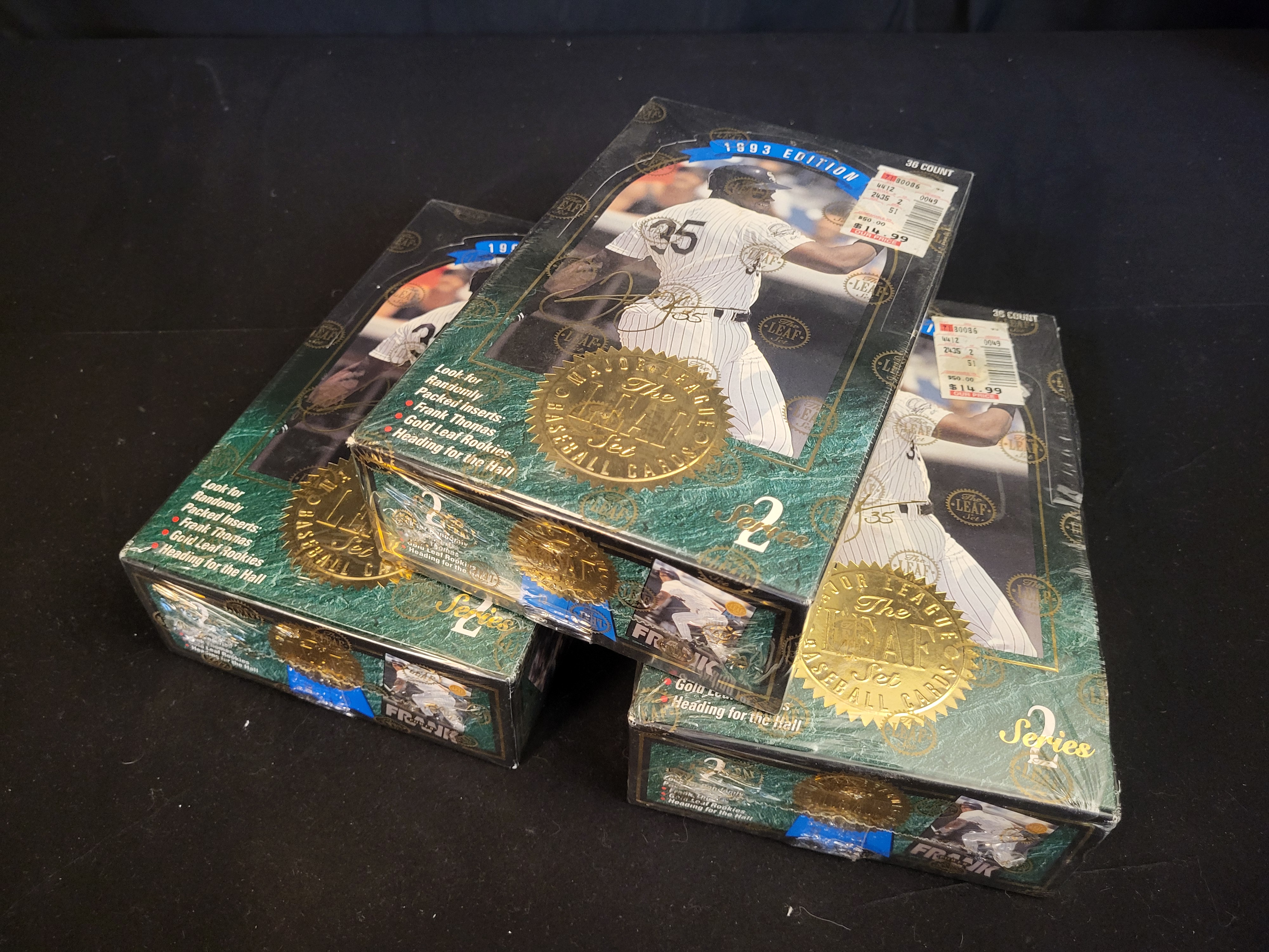 A trio of 1993 Leaf Series 2 Major League Baseball factory-sealed card boxes. Each box is a 36 count edition featuring a green marbleized pattern with gold-tone accents. The front of each box displays an image of Frank Thomas in a Chicago White Sox uniform and a gold embossed seal. Text on the packaging indicates the inclusion of randomly packed inserts such as Frank Thomas cards, Gold Leaf Rookies, and Heading for the Hall. The boxes are encased in original cellophane wrap featuring repeating The LEAF Set logos. Retail price stickers are visible on the exterior of the packaging.