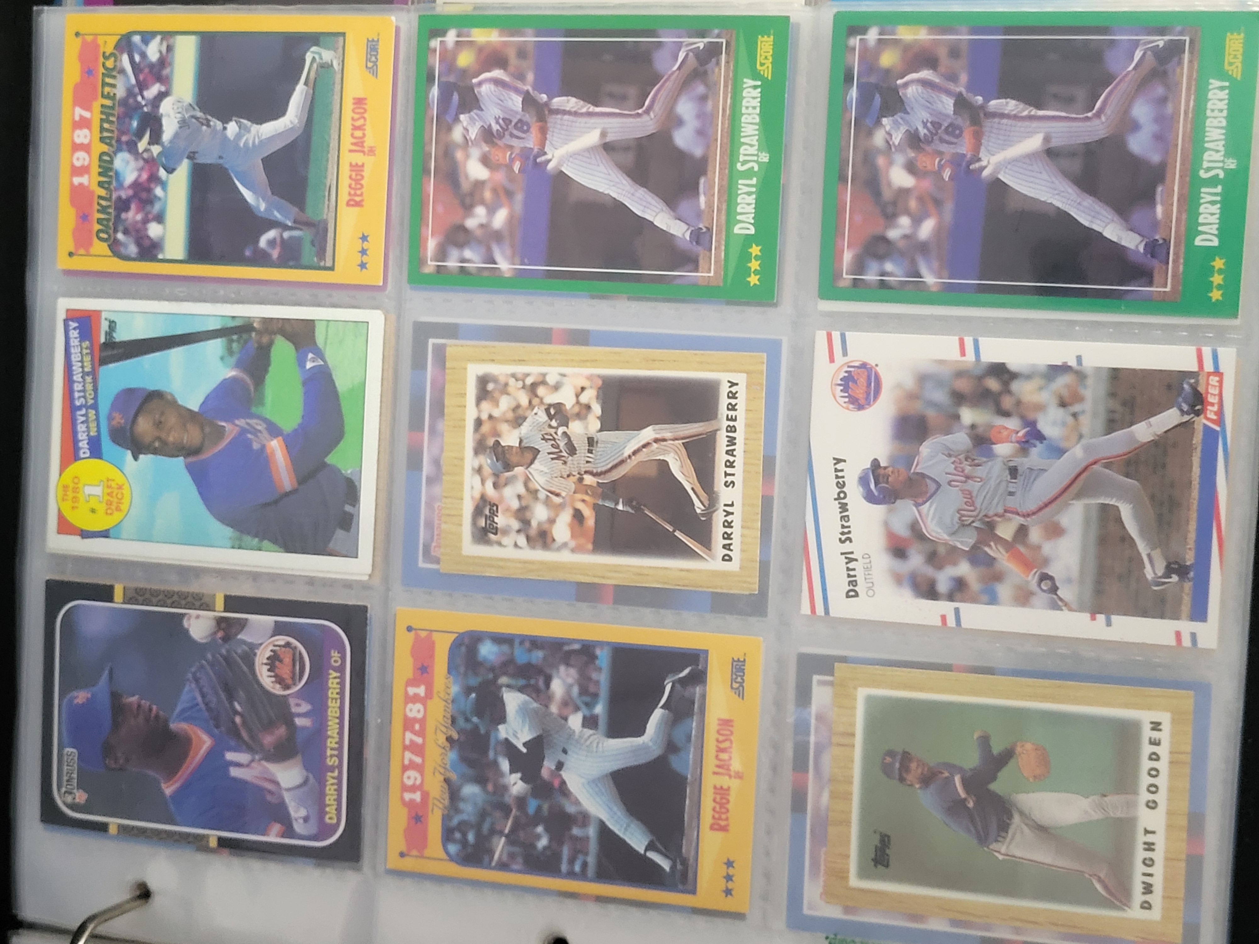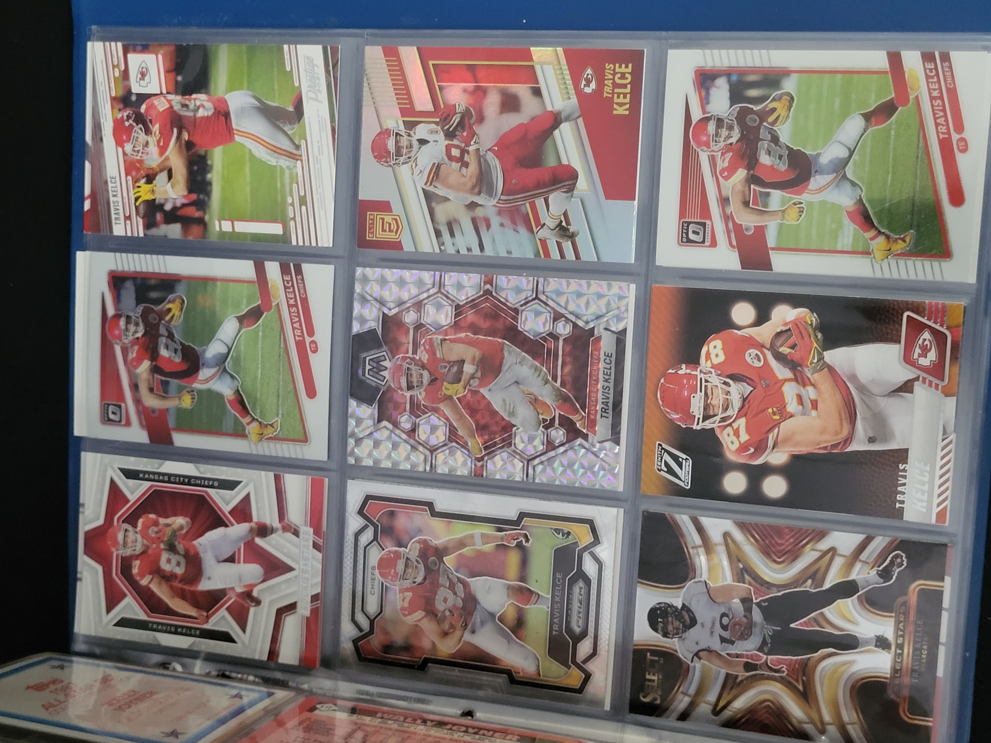 A collection of sports trading cards spanning several decades, housed in a blue vinyl three-ring binder titled Sports Card Collection. The assembly includes baseball cards from the mid-1950s to the late 1980s and contemporary football cards from the early 2020s. Identified manufacturers include Topps, Fleer, Donruss, Score, and Panini. Notable players represented in the vintage section include Johnny Podres, Sam McDowell, Reggie Jackson, and Darryl Strawberry. The modern section features multiple cards of Travis Kelce from various Panini brands including Prizm, Mosaic, and Select. The items are presented in clear plastic nine-pocket page protectors.