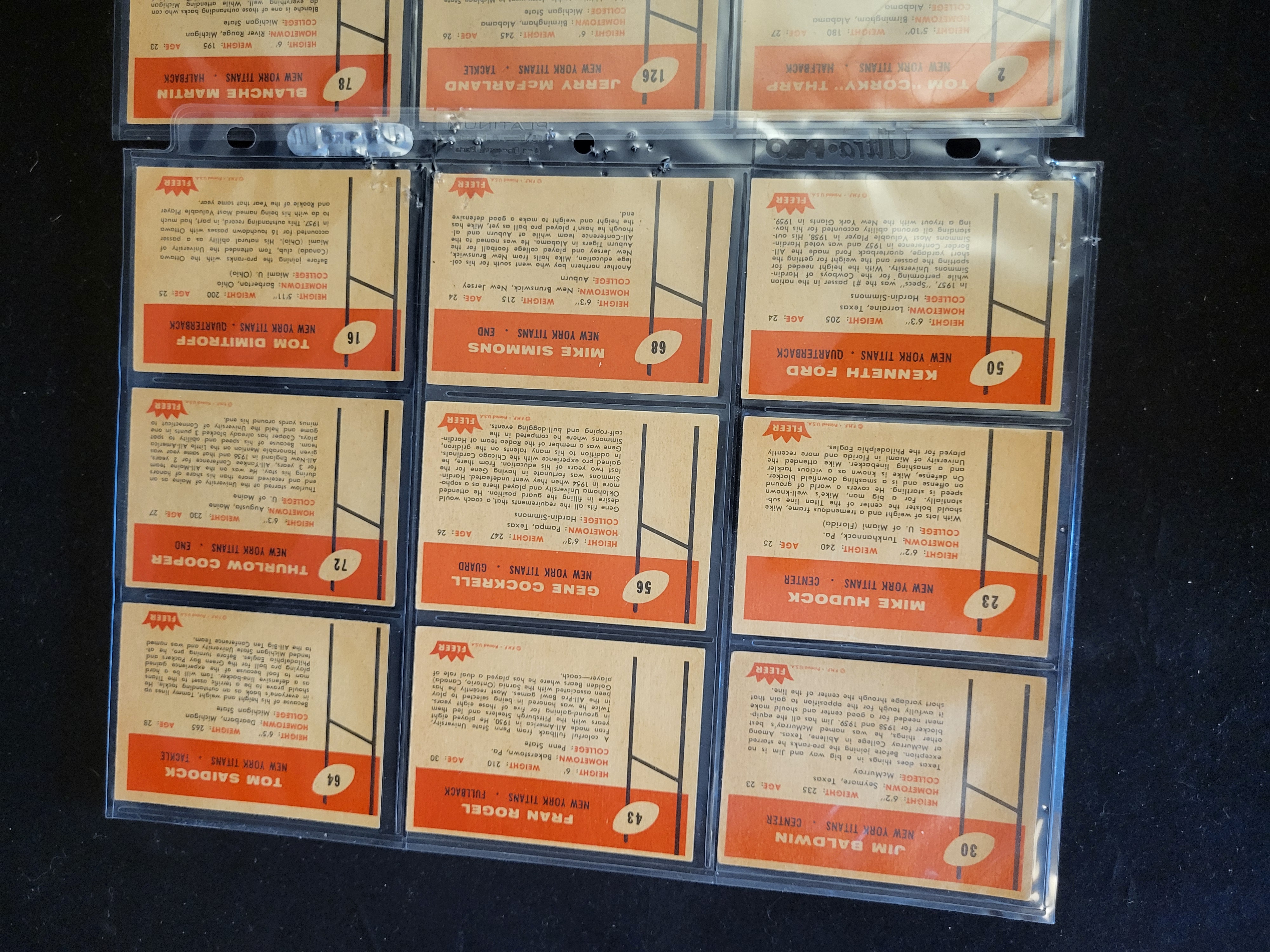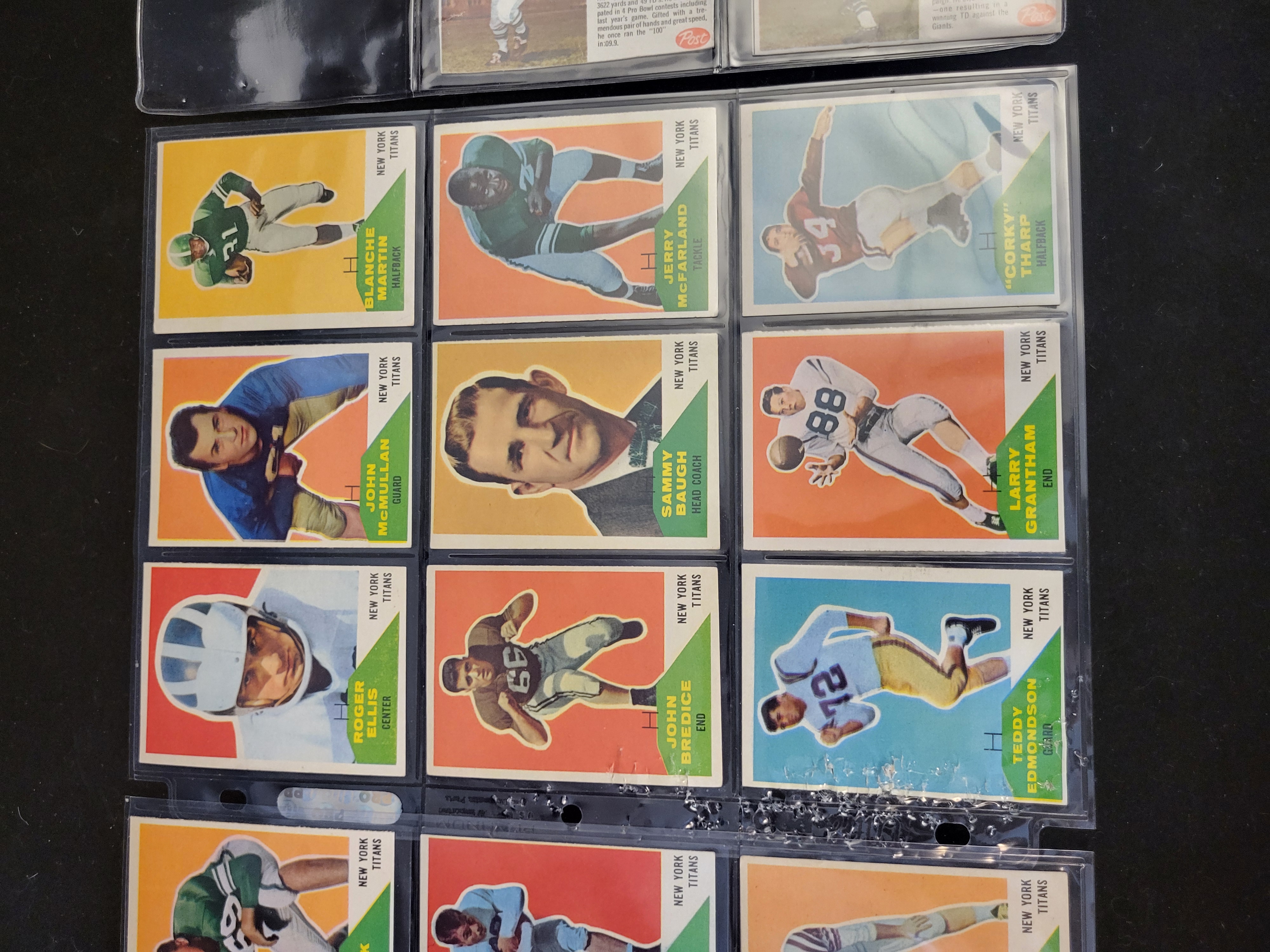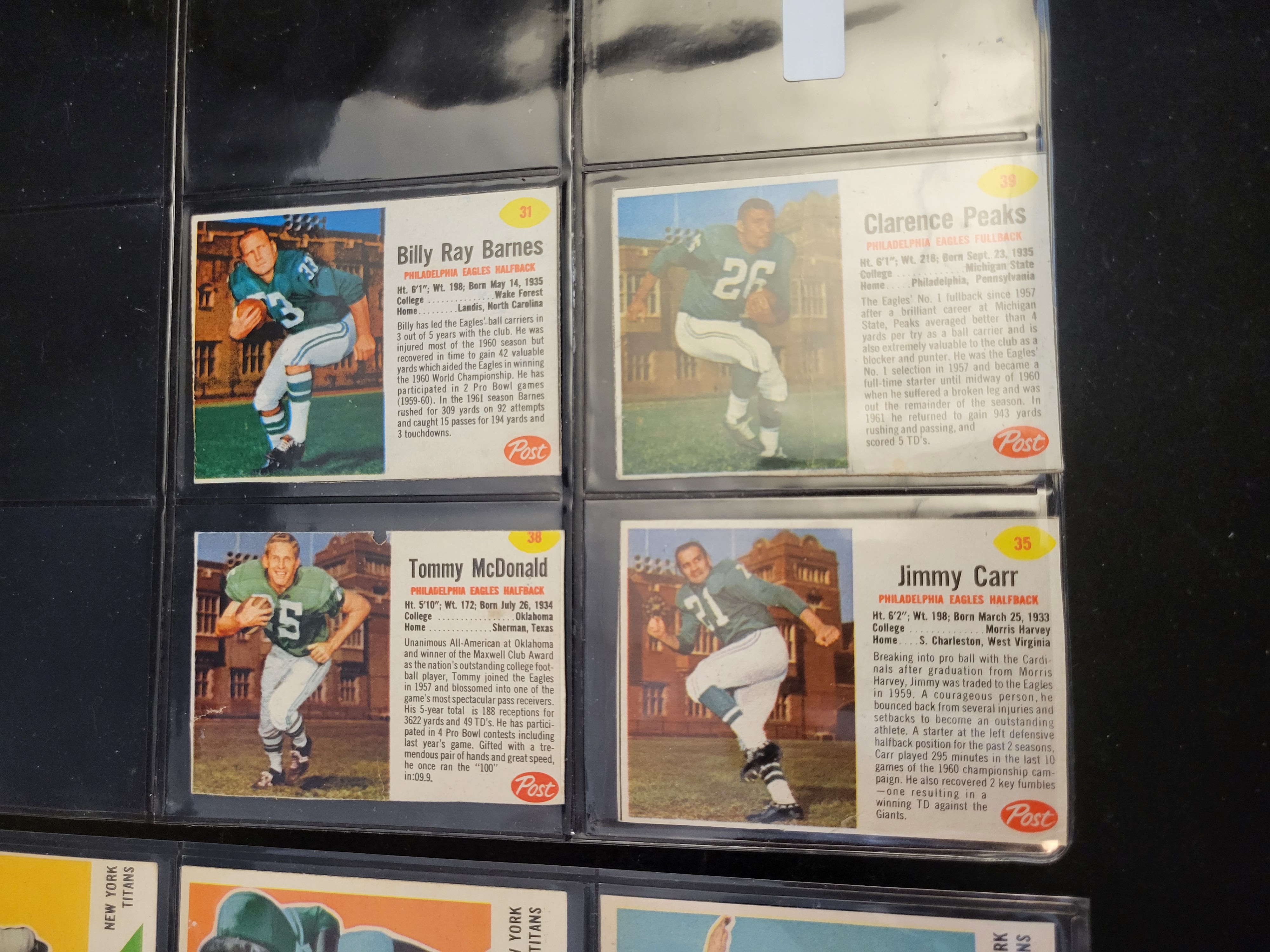A collection of vintage American football cards, primarily consisting of the 1961 Fleer set and the 1962 Post Cereal set. The 1961 Fleer cards represent the New York Titans and include players such as Head Coach Sammy Baugh, Larry Grantham, John McMullan, Tom Saidock, and Mike Simmons. These cards feature color illustrations on the front with detailed player biographies and statistics printed in orange and black on the reverse. The 1962 Post Cereal cards feature Philadelphia Eagles players, including Tommy McDonald, Billy Ray Barnes, Jimmy Carr, and Clarence Peaks. These examples are identifiable by the Post logo and integrated biographical text on the front of the card. The collection is composed of printed cardstock and is housed in clear plastic binder sleeves.