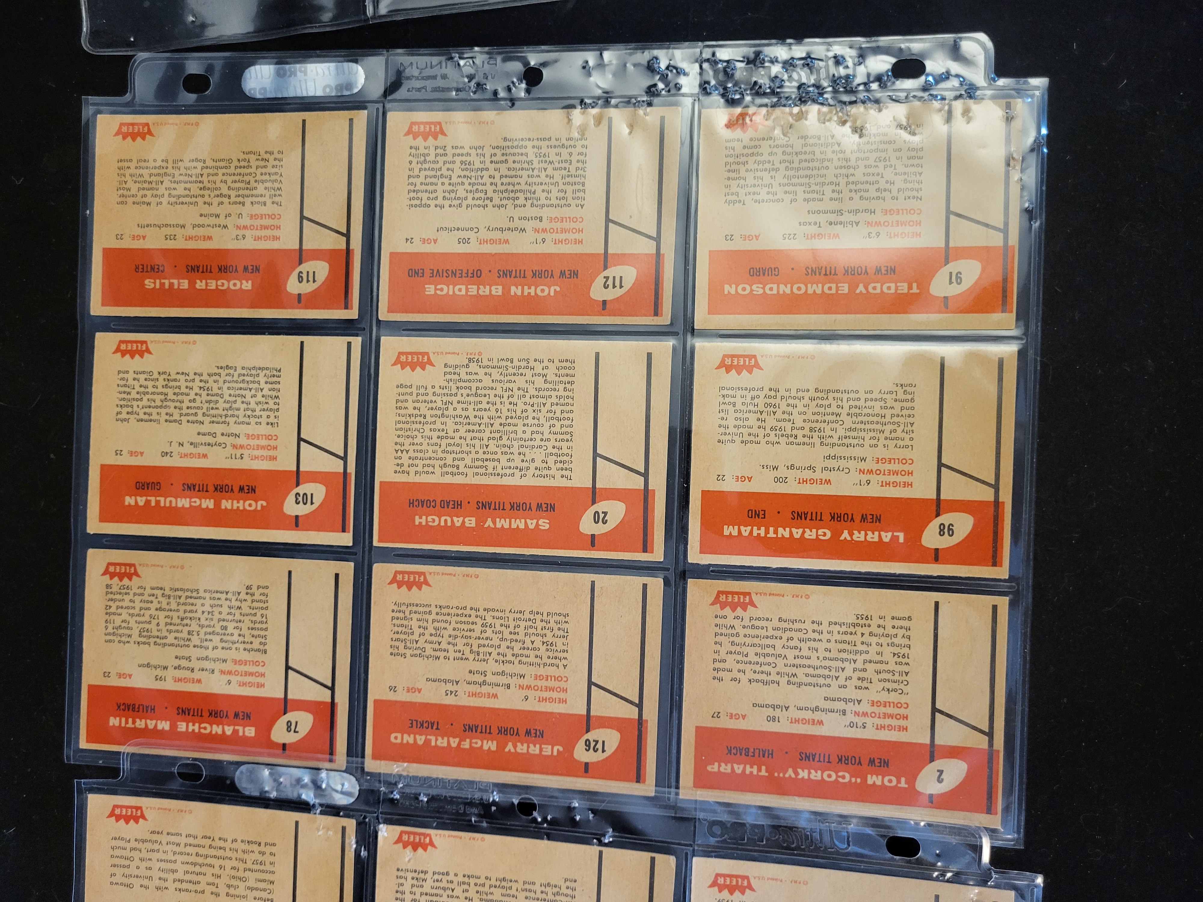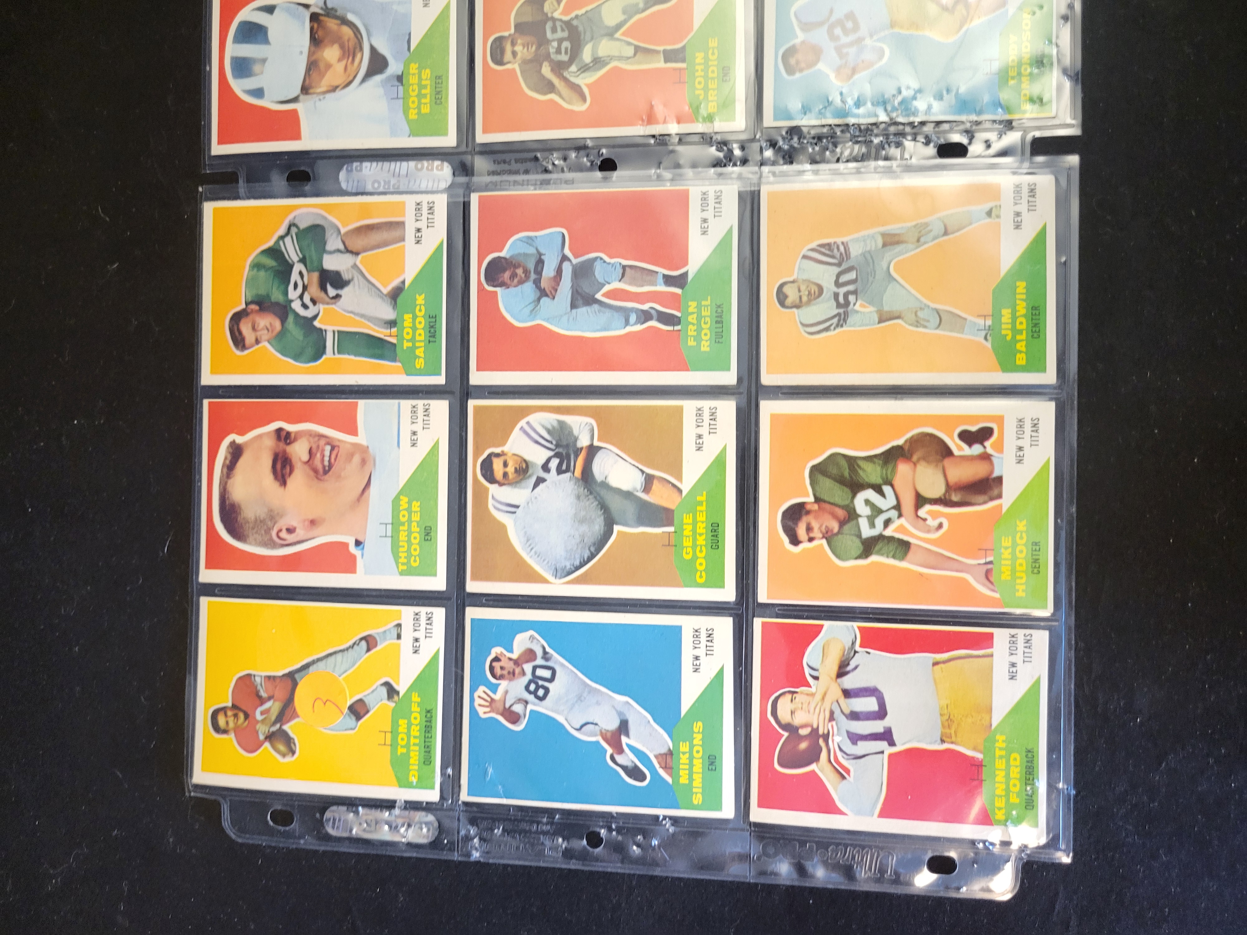 The cards appear to be in generally good condition with minor edge and corner wear consistent with age and handling. One card features a small yellow circular sticker applied to the front surface. The plastic sleeves show some wear and surface scratching.