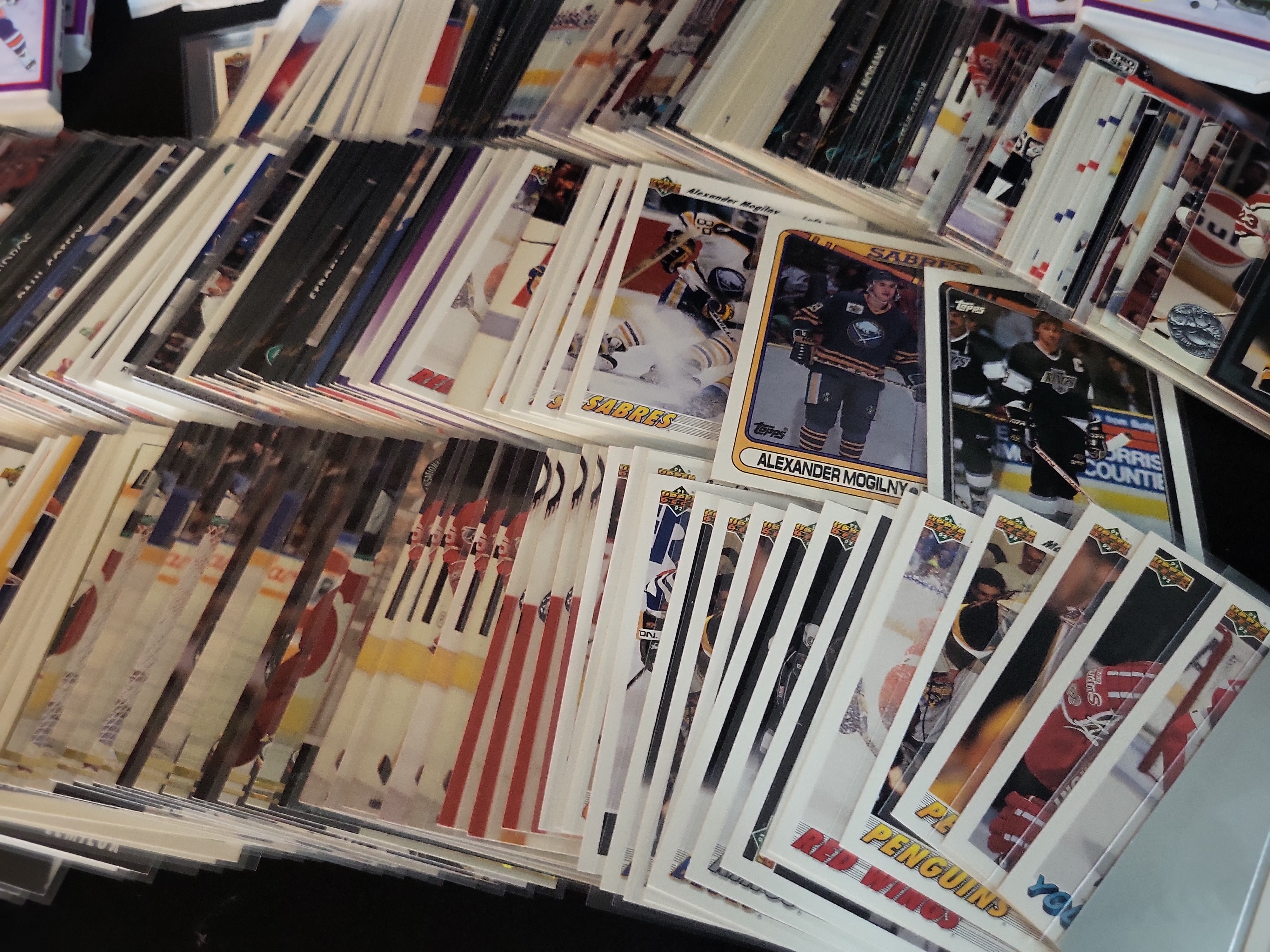 Sealed Product: The 1991 Score booster packs appear to be in excellent factory-sealed condition. The factory crimps are intact across the visible packs with minimal shelf wear and no evidence of tampering or seal failure. Loose Cards: The ungraded cards are generally in Excellent to Near Mint condition. Key cards, including the Mogilny rookie and Gretzky issues, exhibit sharp corners, clean surfaces, and favorable centering. There is no evidence of major creasing, surface scratching, or significant edge whitening on the featured cards. The cards appear to have been well-organized and maintained in a clean, protective environment.