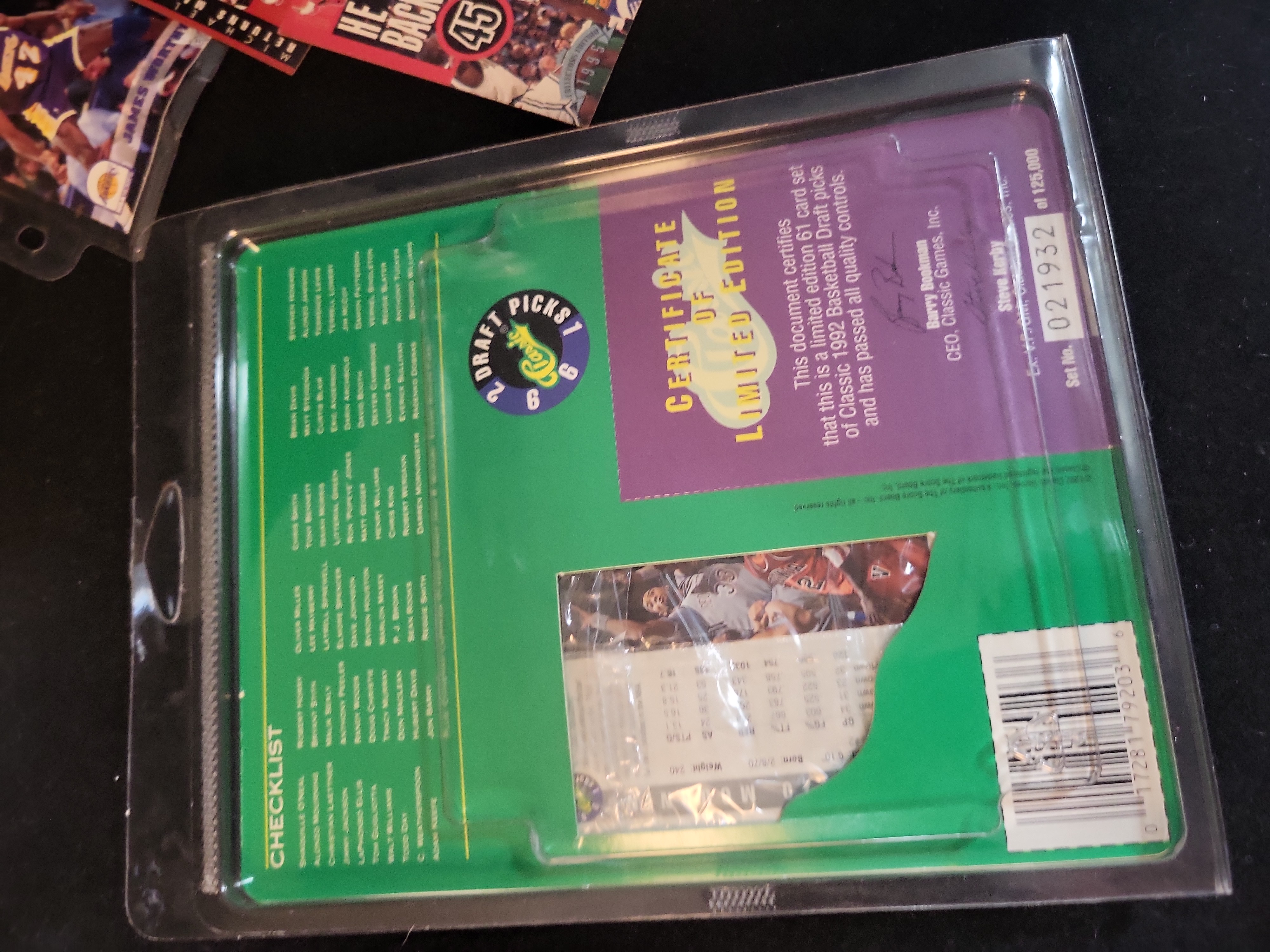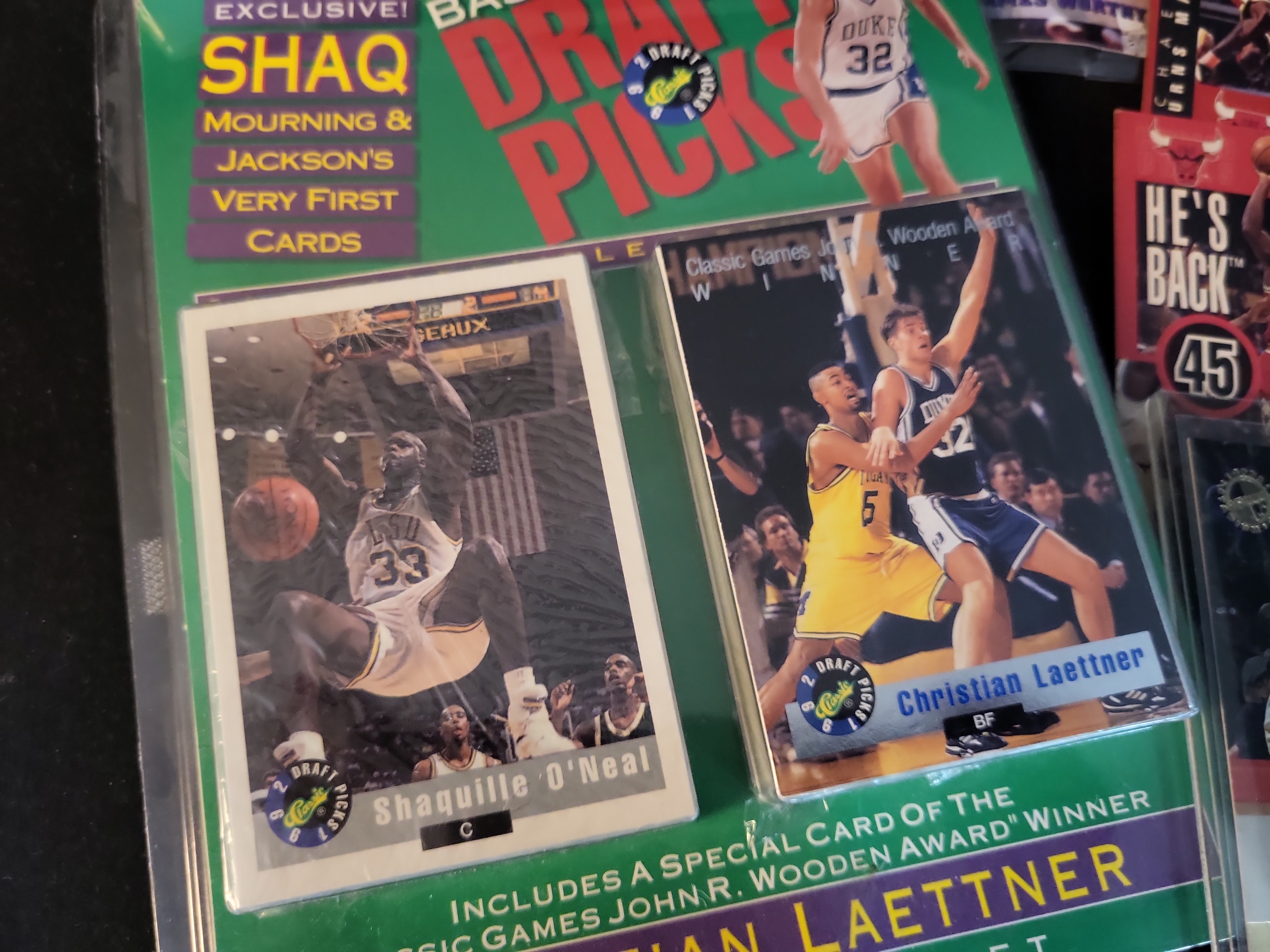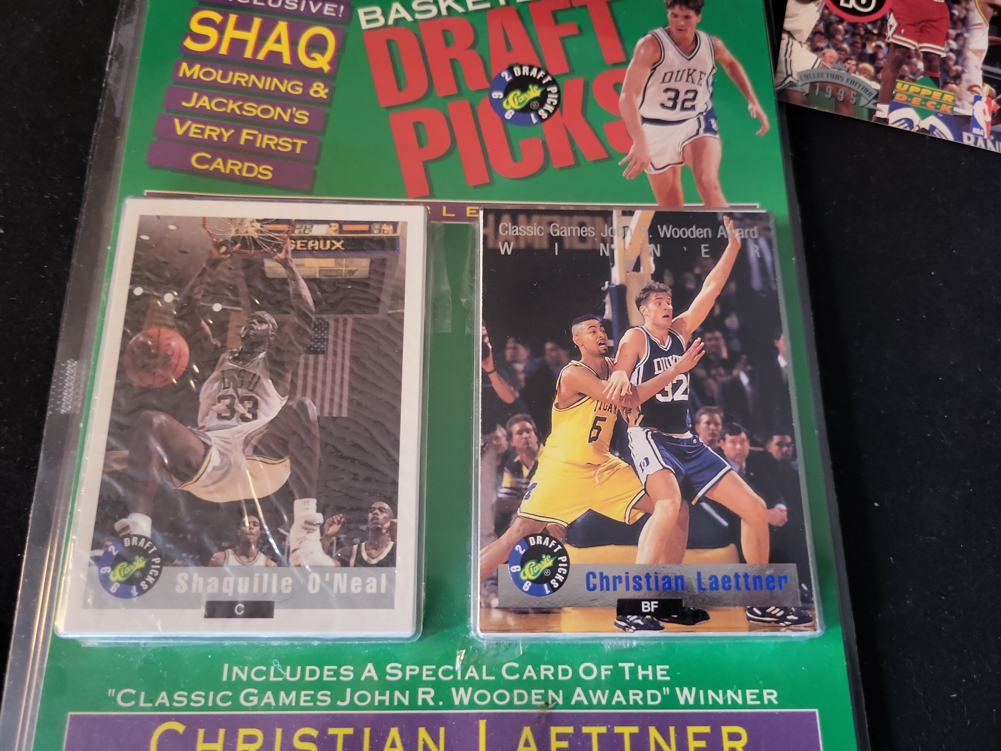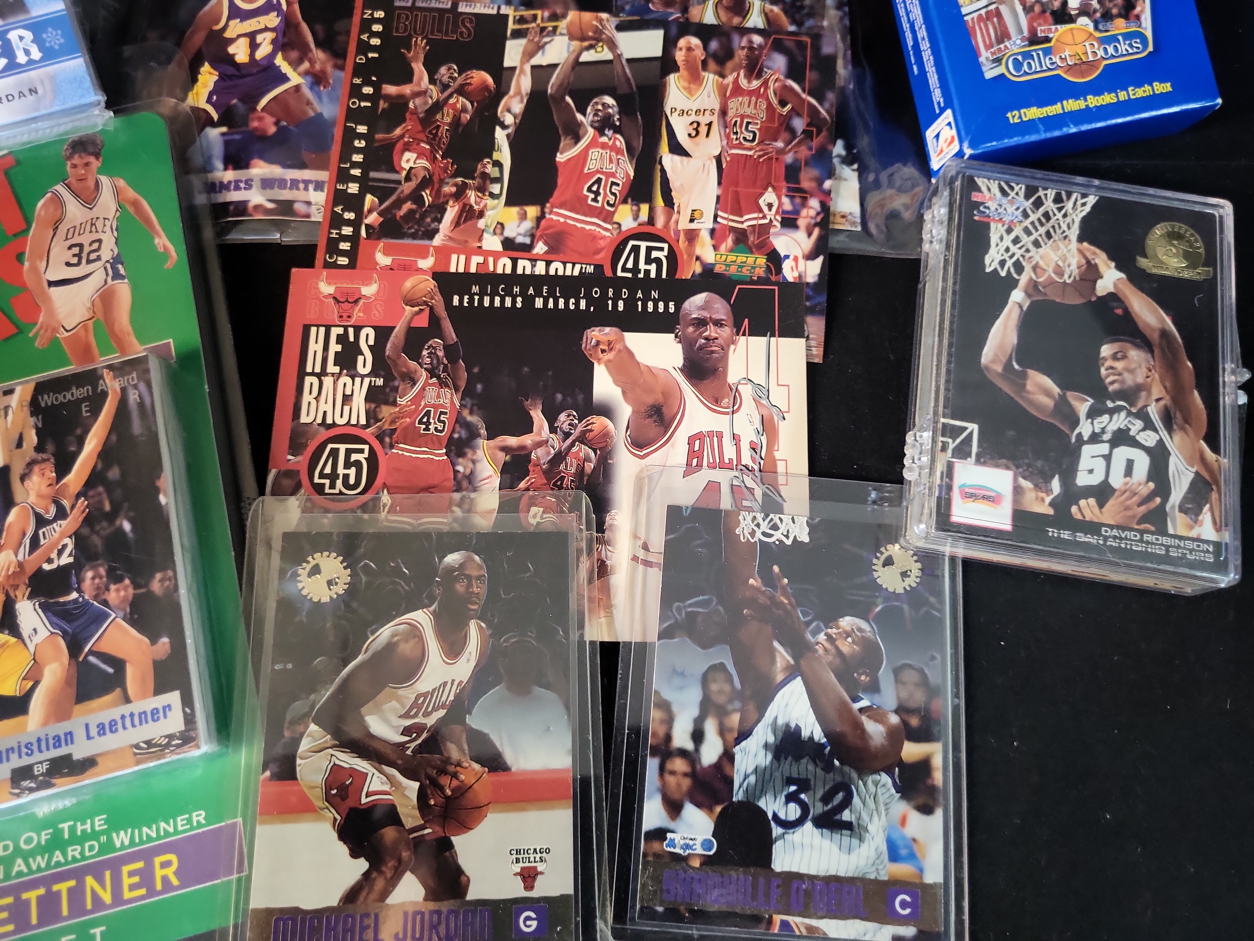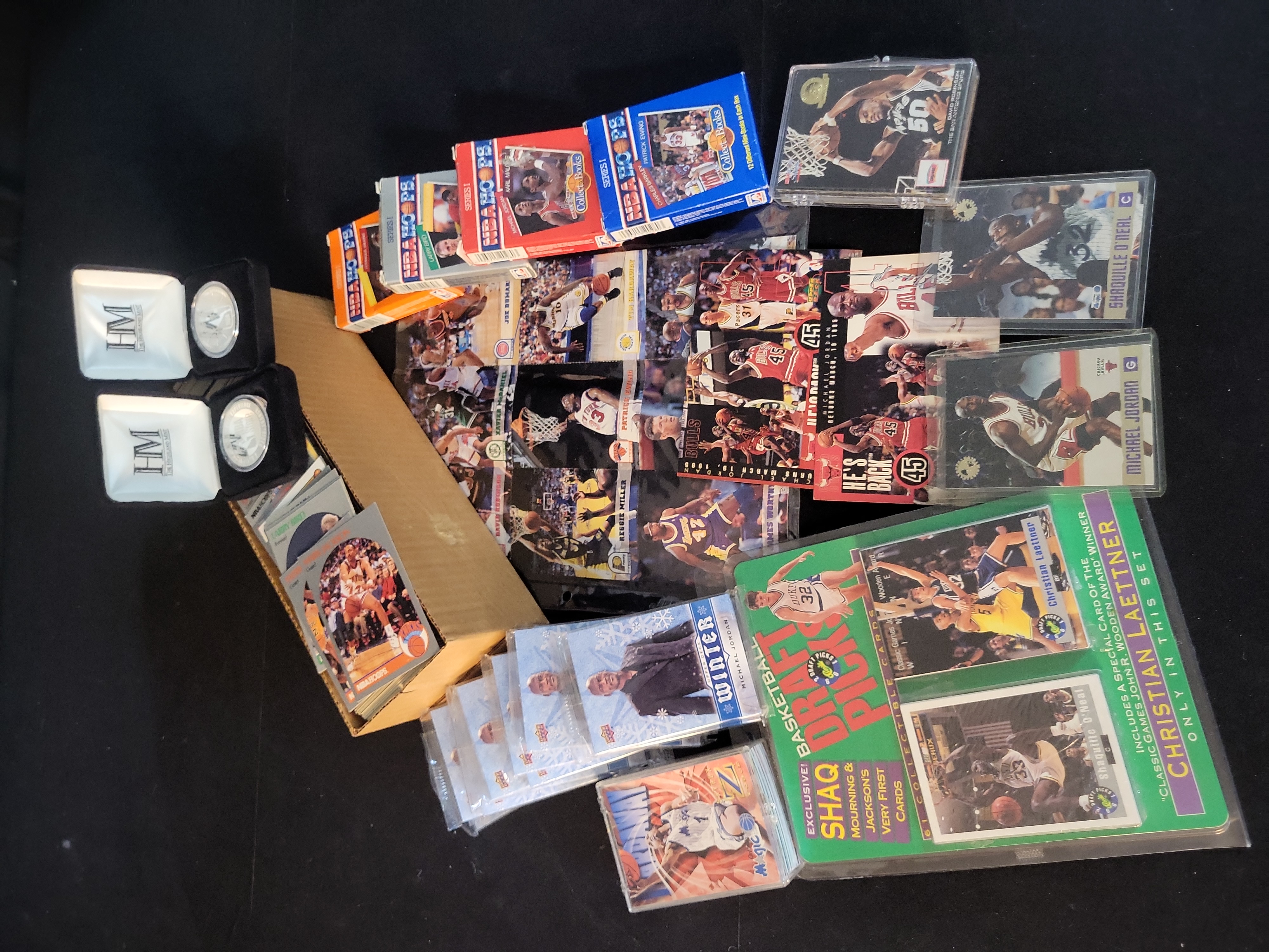 This professional collection of 1990s basketball memorabilia features premier stars Michael Jordan and Shaquille O’Neal across several high-demand sets. The lot includes a 1996 Topps Stadium Club Michael Jordan number 40 and a 1996 Topps Stadium Club Shaquille O’Neal number 30. Also featured are two 1995 Upper Deck Michael Jordan He is Back commemorative inserts, including one design with a blue facsimile signature. A significant sub-lot of approximately 6 to 8 Upper Deck Michael Jordan Winter seasonal inserts is included, all individually protected in plastic sleeves. The collection highlights a 1992 Classic Basketball Draft Picks Limited Edition Set, Certificate Number 021932 of 125,000, which includes the Shaquille O’Neal rookie-year card number 1 and Christian Laettner. Supplemental items consist of NBA Hoops Collect-a-Books Series 1 boxes featuring Jordan, Malone, and Ewing, a bulk storage box containing over 200 1990-91 NBA Hoops cards including Mark Jackson and Larry Bird, a SkyBox Z-Force Penny Hardaway card, two Highland Mint silver-toned commemorative coins in original velvet presentation boxes, and a David Robinson commemorative card in a screw-down protector.
