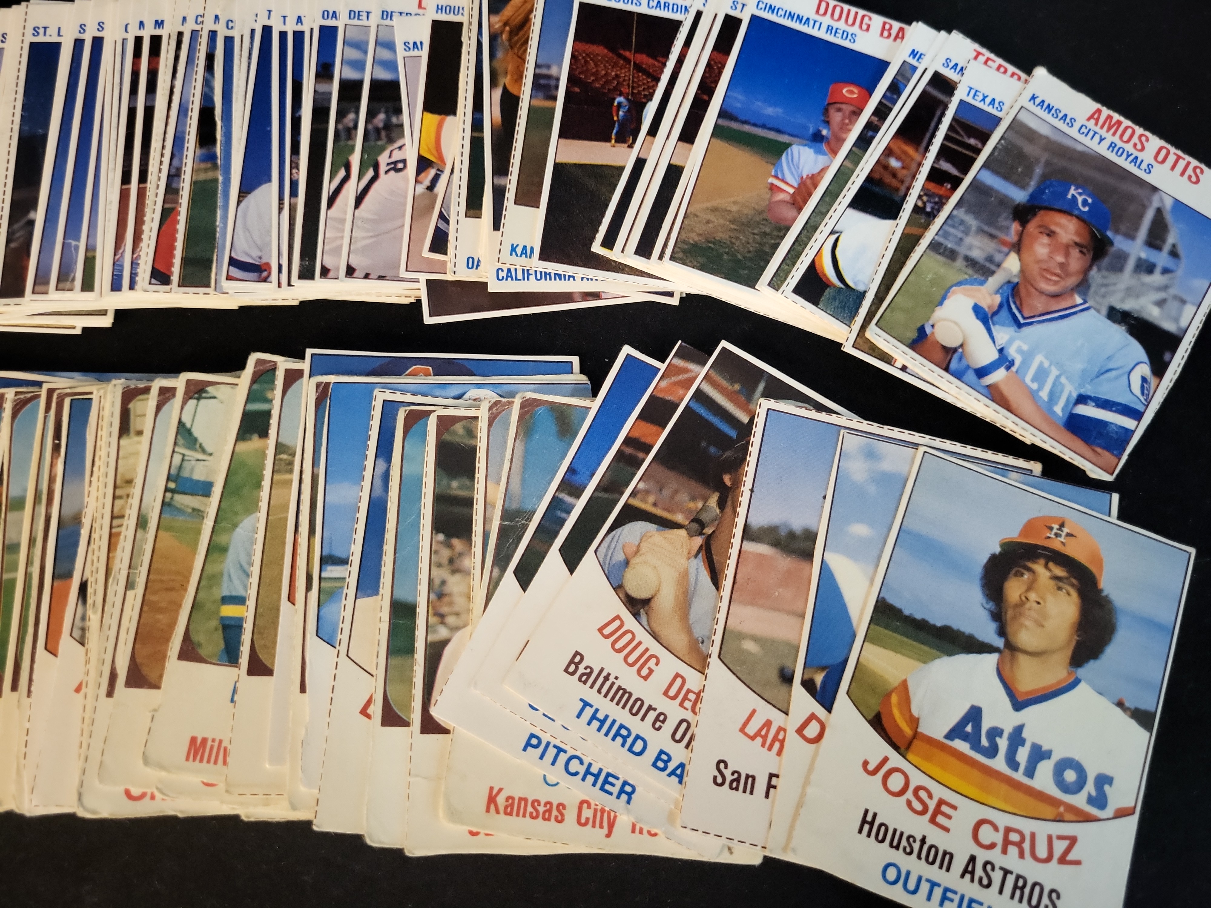 This auction features a substantial collection of approximately 60 to 80 vintage 1977 Topps Cloth Stickers. This set was a specialized test issue released by Topps in the late 1970s, featuring a unique textile surface and a peelable adhesive backing. Each sticker is defined by a characteristic dashed border outline. The lot contains a diverse array of Major League Baseball players from the era, with several notable All-Stars and team leaders identified. Key players visible in the collection include Amos Otis (Kansas City Royals), Jose Cruz (Houston Astros), Dave Concepcion (Cincinnati Reds), Doug DeCinces (Baltimore Orioles), Doug Bair (Cincinnati Reds), John Stearns (New York Mets), and Dave Freisleben (San Diego Padres). These stickers are highly regarded among vintage collectors as a premier oddball set of the decade.