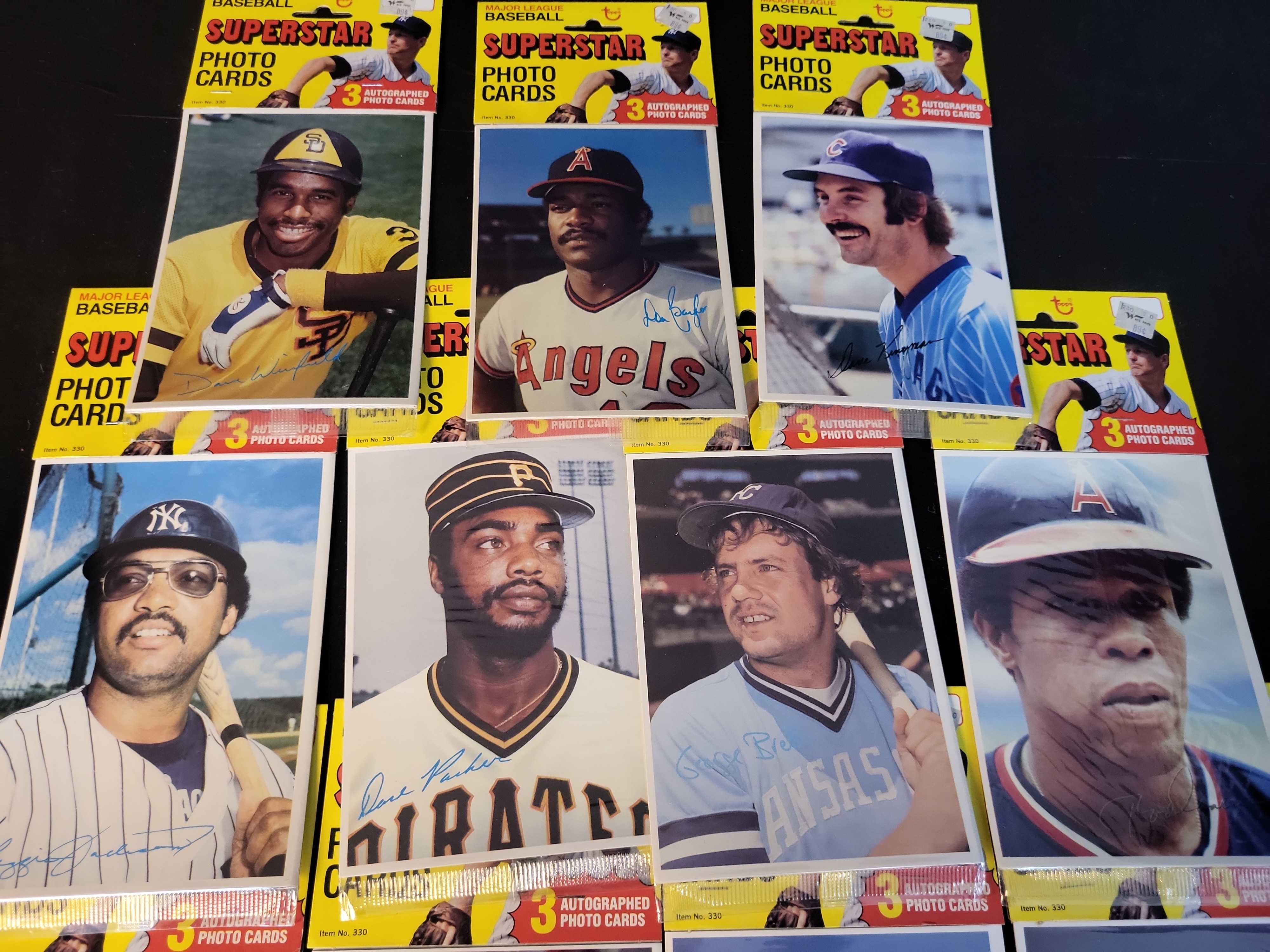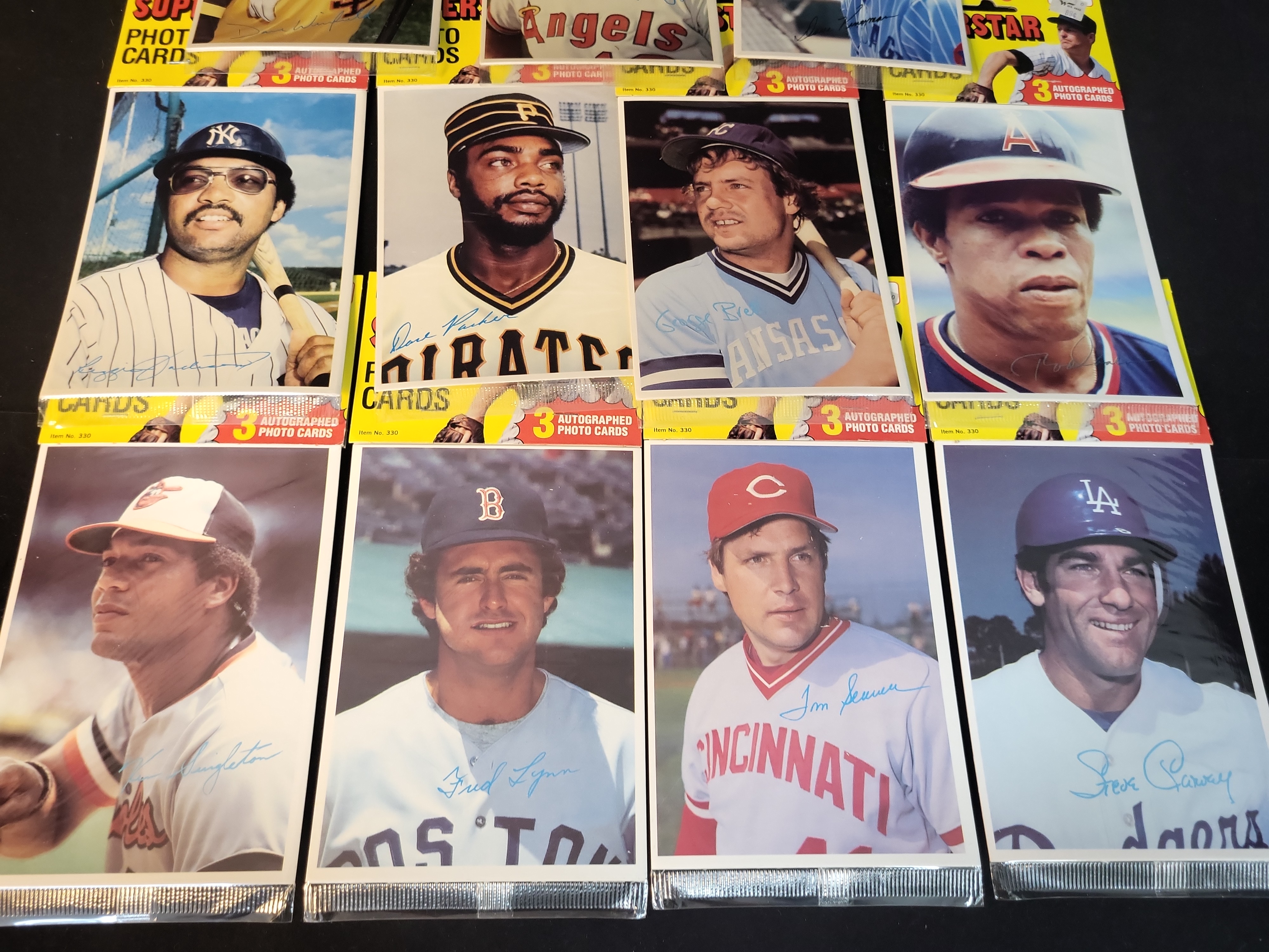 This lot features a collection of 1980 Topps Superstar Photo Cards, an oversized 5" x 7" set. These cards are distinguished by their large-format color photography and blue facsimile signatures. A significant highlight of this collection is that several cards remain attached to their original yellow retail hanging headers (Item No. 330), which originally distributed these as three-card packs. The lot includes the following cards: #2 Dave Winfield (San Diego Padres), #4 Don Baylor (California Angels), #8 George Brett (Kansas City Royals), #12 Rod Carew (California Angels), #14 Dave Kingman (Chicago Cubs), #19 Steve Garvey (Los Angeles Dodgers), #21 Tom Seaver (Cincinnati Reds), #22 Dave Parker (Pittsburgh Pirates), #23 Reggie Jackson (New York Yankees), #26 Fred Lynn (Boston Red Sox), and #27 Ken Singleton (Baltimore Orioles). All players featured are established superstars or Hall of Famers; there are no rookie cards in this set. All items are raw and ungraded.