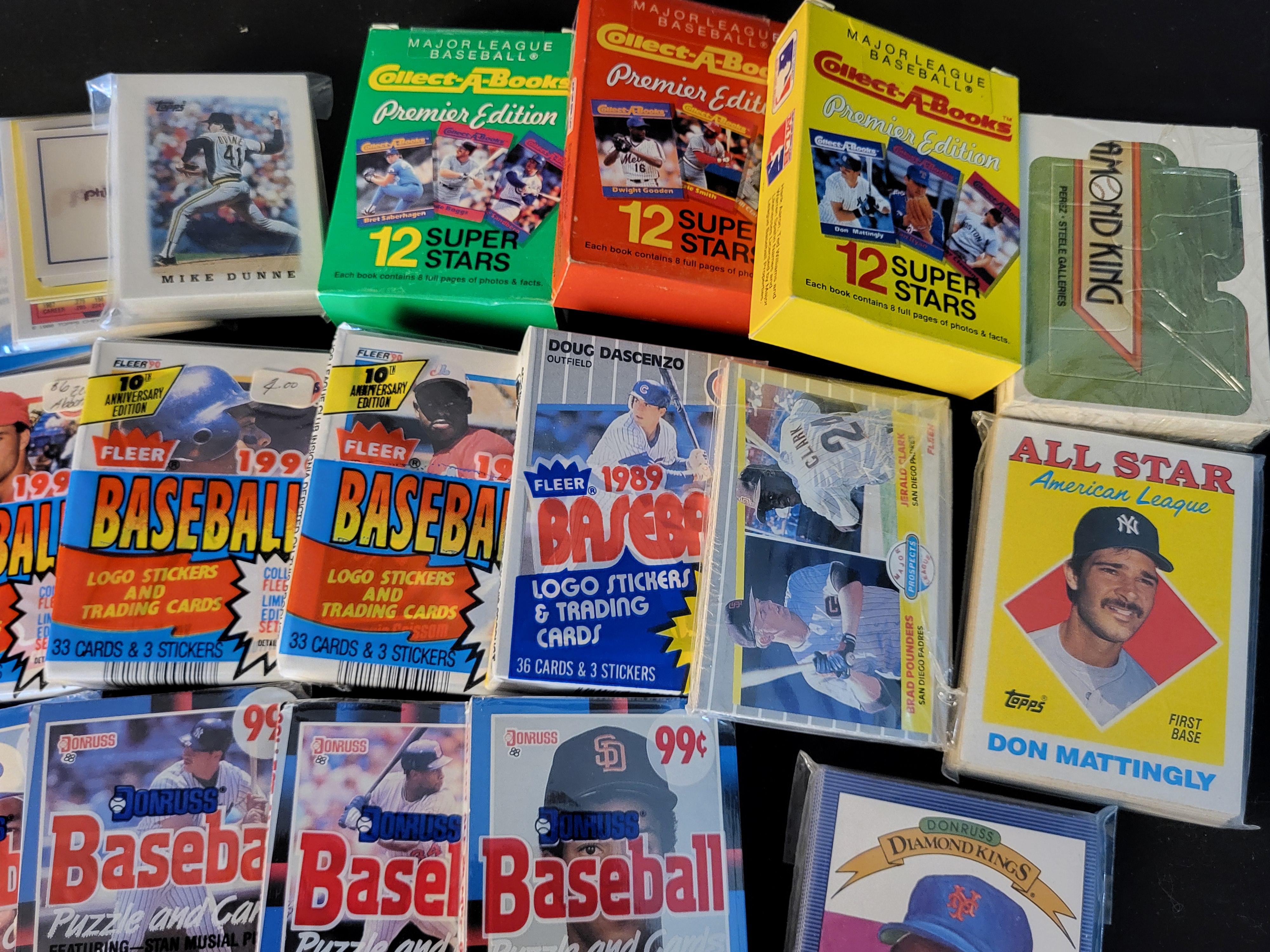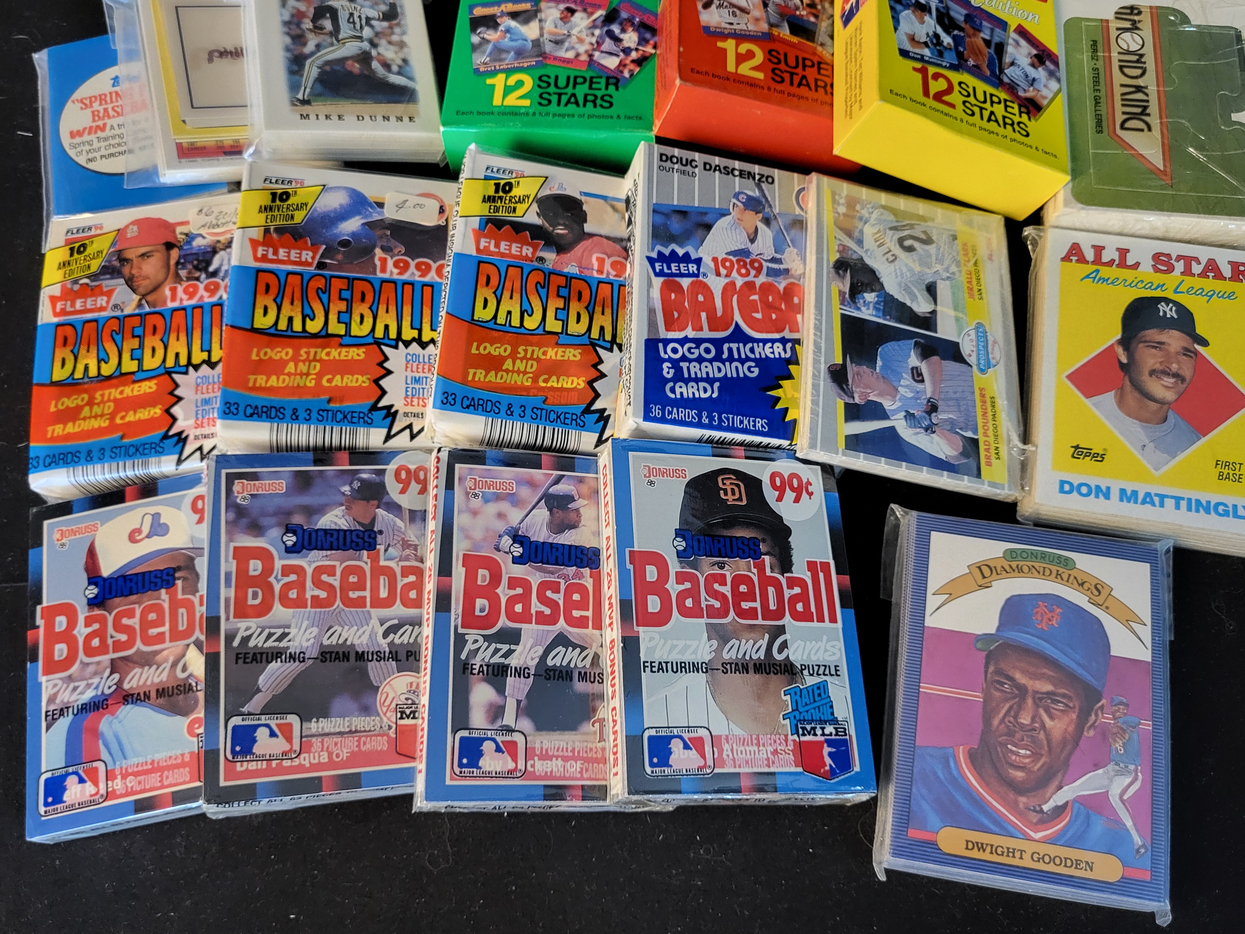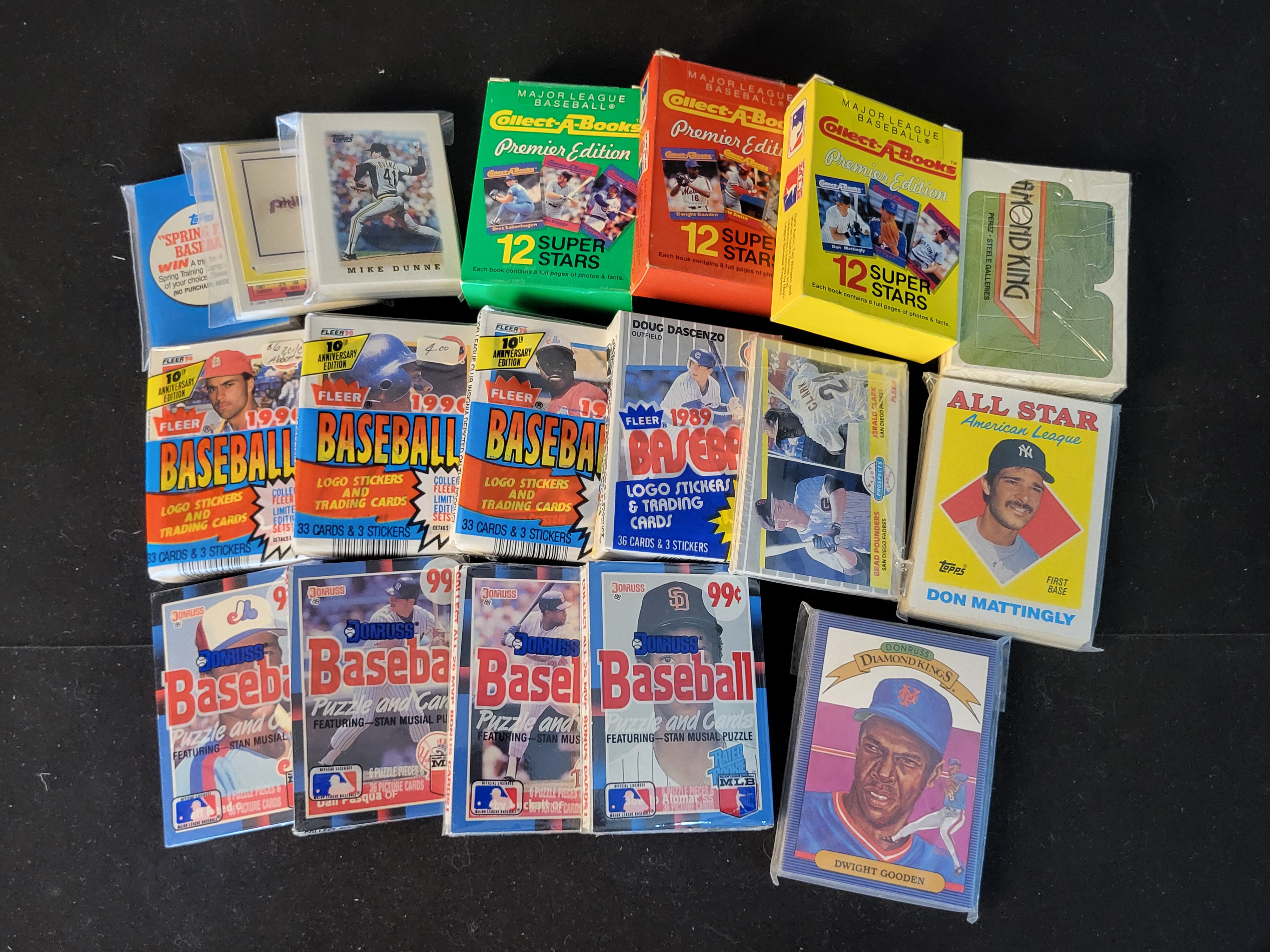 This assortment of baseball trading cards and related memorabilia from the late 1980s and early 1990s comprises various unopened packs, boxed sets, and individual cards. The collection includes 1988 Donruss Puzzle and Cards packs featuring the Stan Musial puzzle, 1989 and 1990 Fleer logo sticker and trading card packs, and several Collect-A-Books Premier Edition boxed sets. Notable players visible on the packaging and cards include Don Mattingly on a Topps All-Star card, Dwight Gooden on a Donruss Diamond Kings card, Mike Dunne, and Doug Dascenzo. The items are constructed of printed cardboard and paper. Several components remain in original factory-sealed cellophane or plastic wrap, while individual cards are housed in aftermarket protective plastic sleeves.