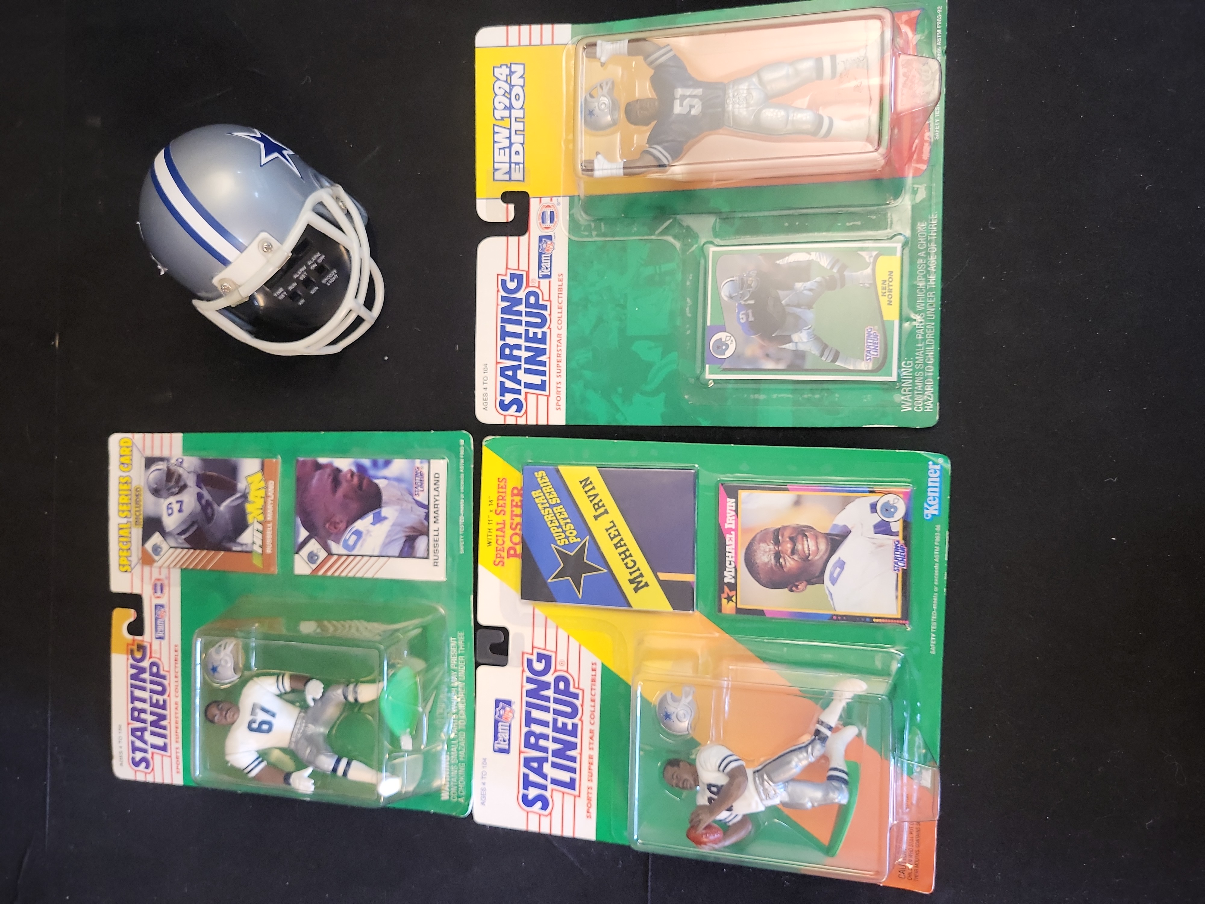 This lot features a collection of vintage Dallas Cowboys memorabilia primarily from the mid-1990s, highlighting key players from the team’s championship era. The collection includes three factory-sealed Kenner Starting Lineup action figures and one novelty desk item. Featured players include Hall of Fame wide receiver Michael Irvin in a white jersey #88 (Superstar Poster Series including an 11" x 14" poster), linebacker Ken Norton in a blue jersey #51 (New 1994 Edition), and defensive tackle Russell Maryland in a white jersey #67 (Special Series including a Hit Man card). Each figure is accompanied by its original Starting Lineup trading card and helmet accessory. Also included is a silver Dallas Cowboys mini helmet alarm clock, featuring the iconic blue star logo and a digital clock display integrated into the face mask area. These items are original retail collectibles and do not contain signatures.