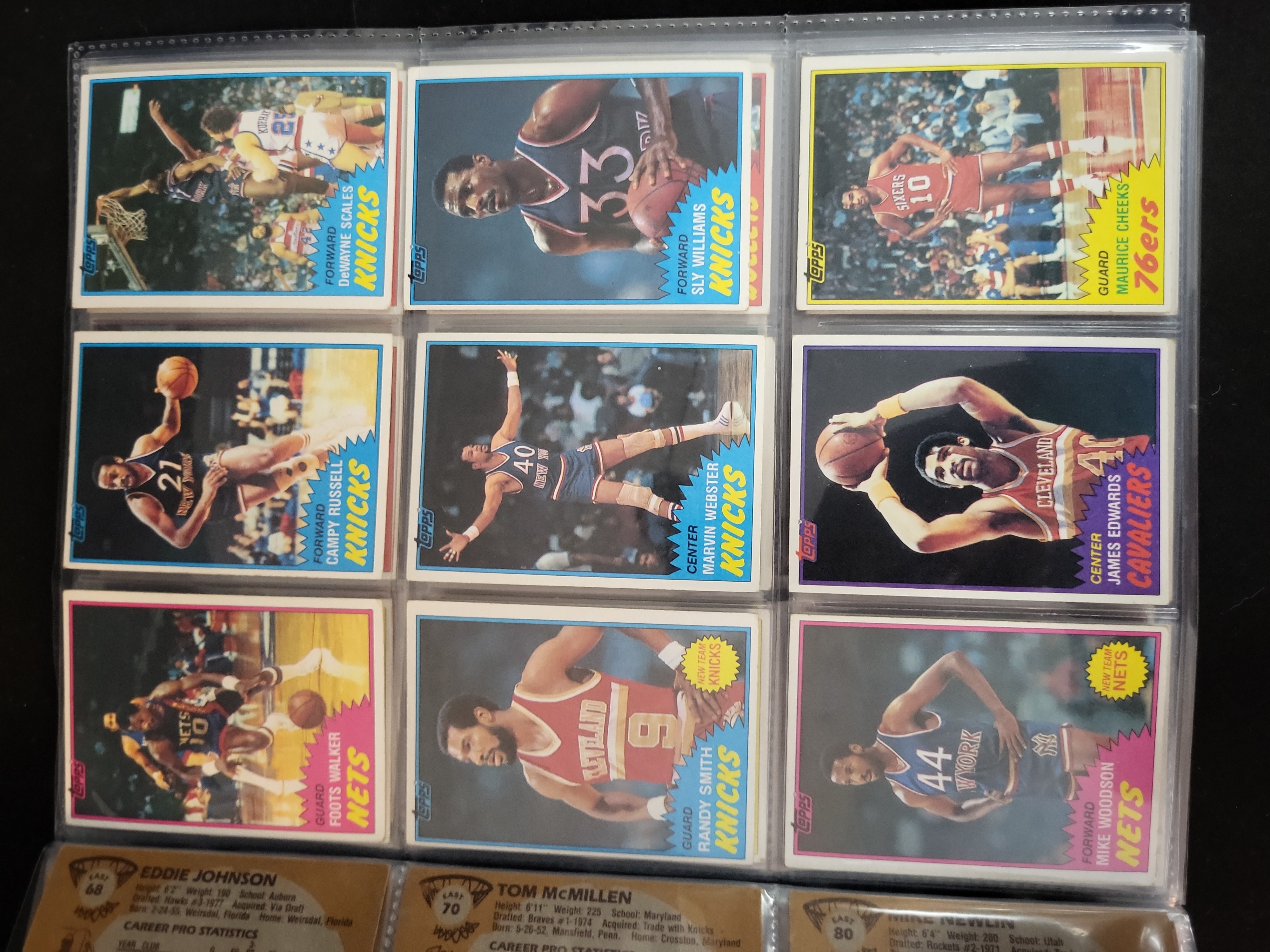 The cards are ungraded (raw) and currently stored in standard plastic binder pages. The majority of the mini-cards have been separated from their original panels; the resulting edges exhibit the characteristic \"fuzzy\" or jagged texture typical of this set. Centering is variable across the collection, with several examples showing significant shifts toward the edges (e.g., Scott Wedman). Corners generally appear square to slightly rounded. Visible edge whitening is present on several cards, particularly those with darker borders like the Knicks and Suns players. Surfaces appear generally well-preserved without major creasing or staining, though minor surface wear consistent with age and handling should be expected.