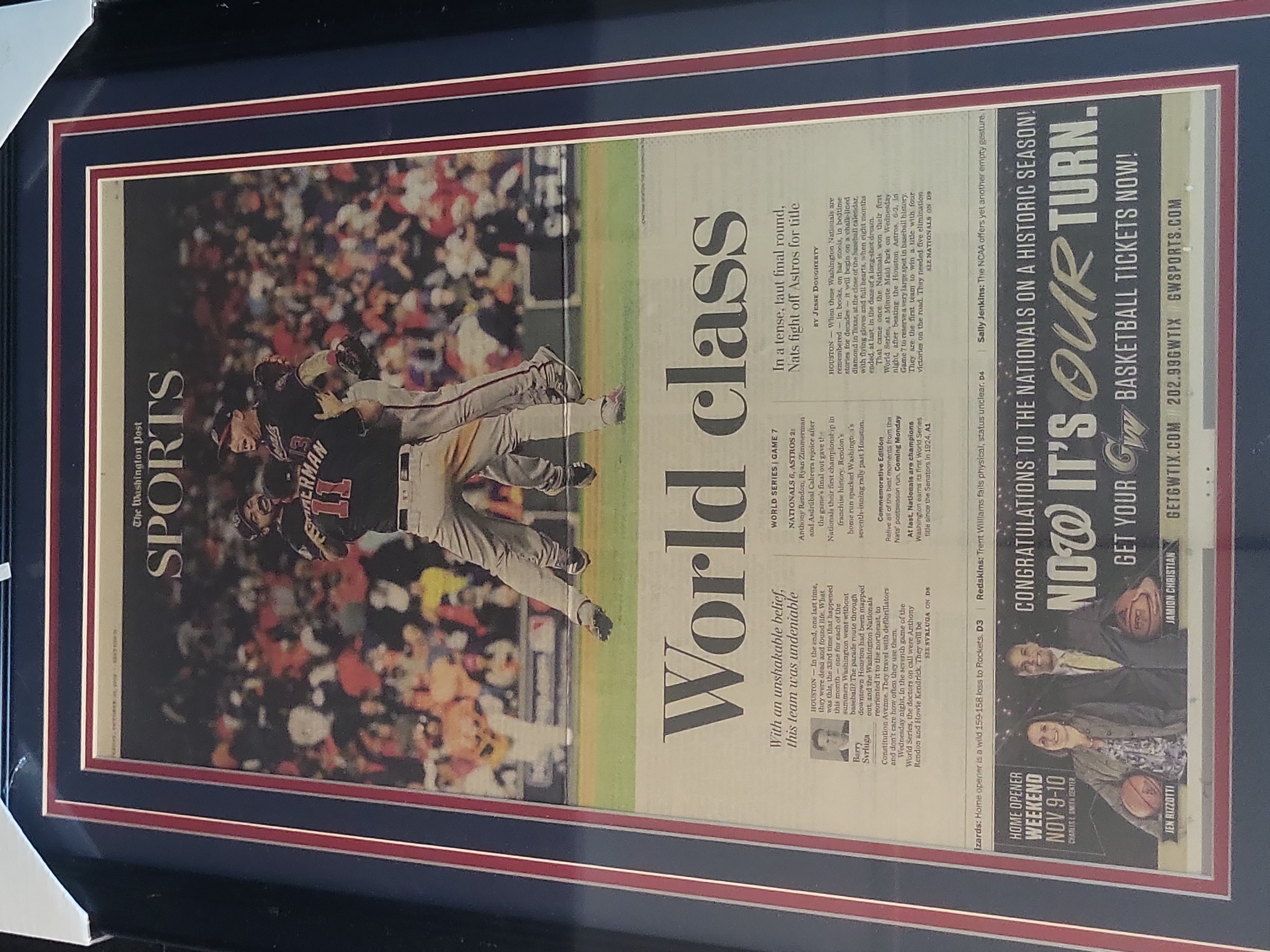 This professionally framed sports memorabilia display commemorates the Washington Nationals 2019 World Series Championship victory. The piece features a reproduction of the front page of The Washington Post Sports section from October 31, 2019, following the team’s decisive Game 7 win over the Houston Astros. The bold headline reads World class above a central image of Ryan Zimmerman and his teammates celebrating on the field. Mounted in the bottom right corner of the matting is a circular commemorative Washington Nationals W logo medallion. The display is double-matted in the team colors of navy blue and red and is housed in a contemporary black frame. As a commemorative retail item, this piece does not feature signatures or game-used components and does not require third-party authentication.