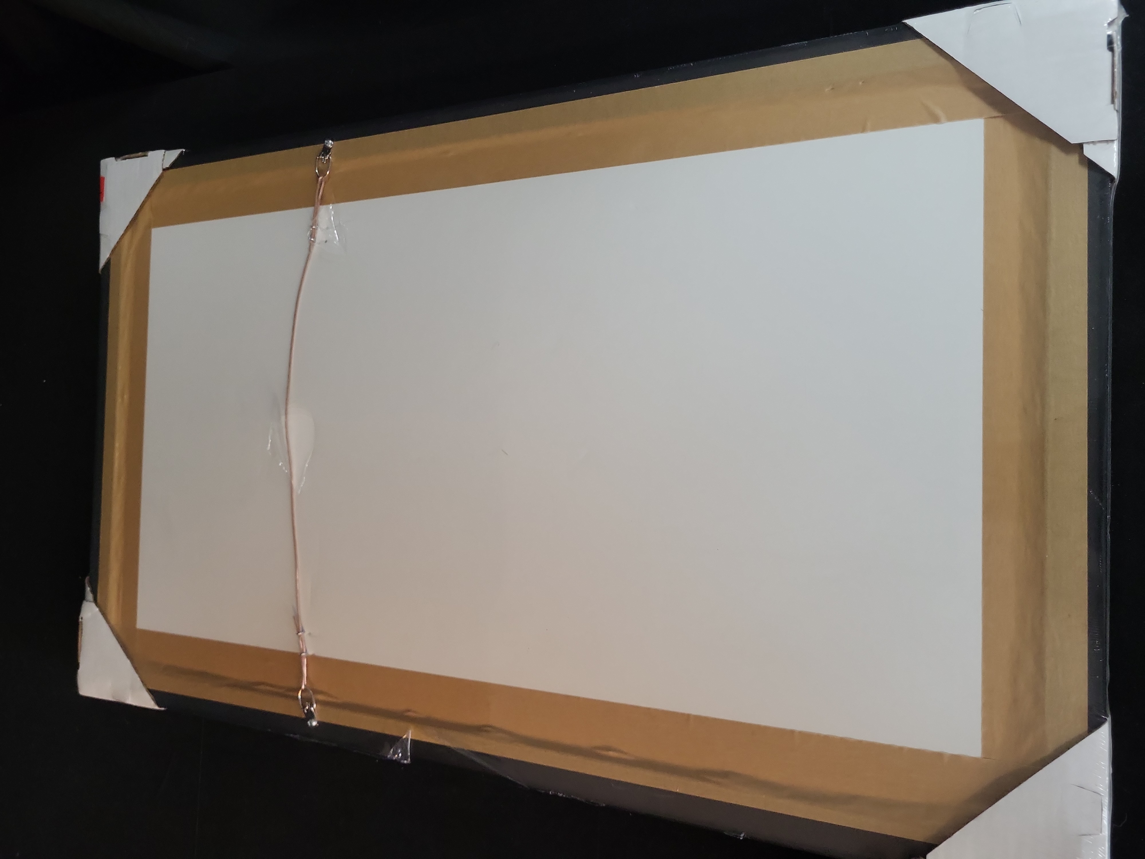 The item is in excellent, new condition and remains in its original protective plastic shrink wrap with cardboard corner guards intact. The frame, glass, and matting show no signs of wear, damage, or scratching. The newspaper reproduction and medallion are well-preserved with no evidence of fading or discoloration. A hanging wire is attached to the reverse for immediate display.