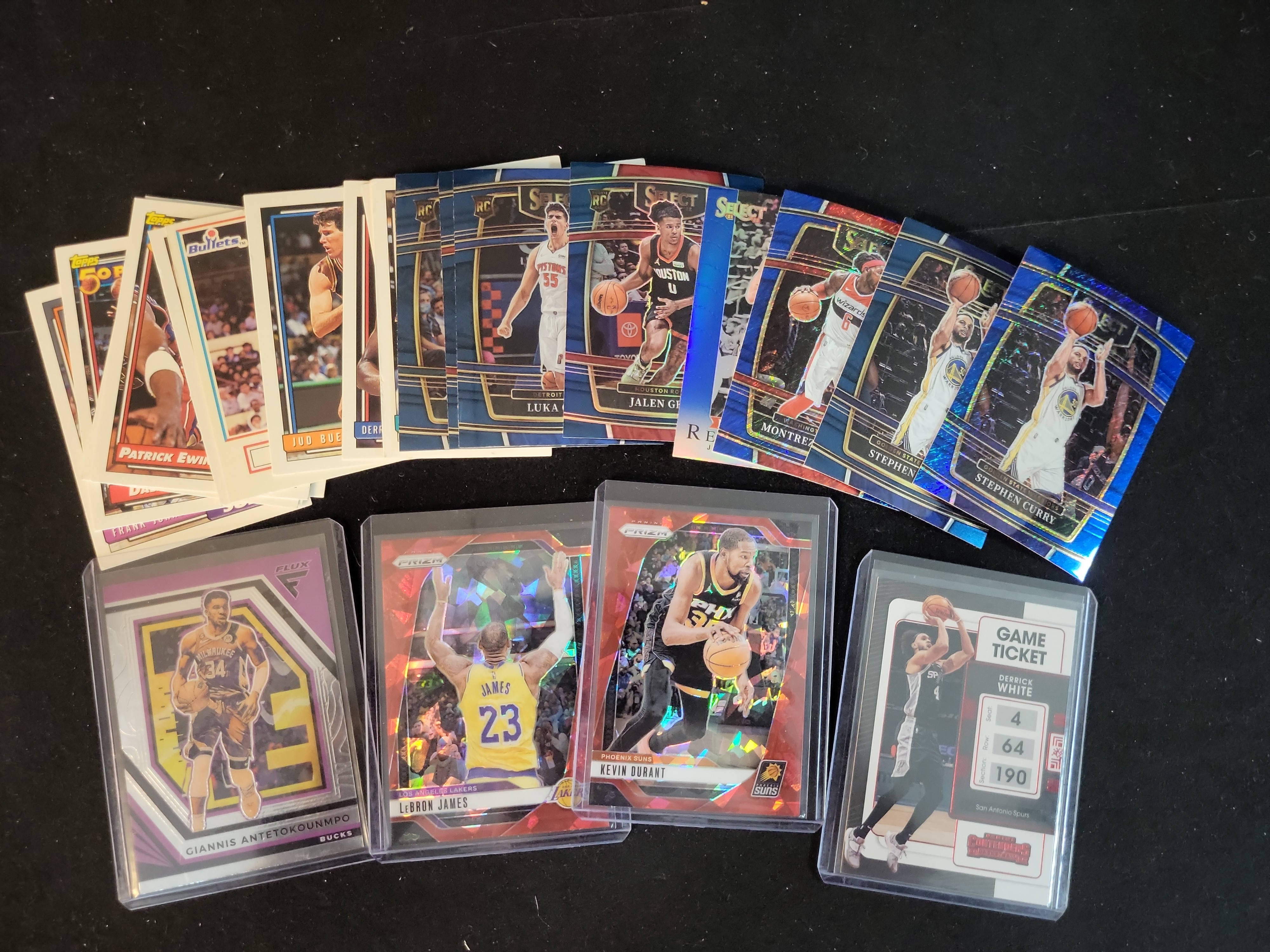 This professional basketball trading card lot features a mix of modern parallels and vintage base cards. Key highlights include a 2023-24 Panini Prizm #101 LeBron James Red Ice Prizm in a Los Angeles Lakers uniform and a 2023-24 Panini Prizm #130 Kevin Durant Red Ice Prizm in a Phoenix Suns uniform. The lot also includes a 2021-22 Panini Flux Giannis Antetokounmpo and a 2021-22 Panini Contenders #53 Derrick White Game Ticket. A selection of 2021-22 Panini Select Blue Prizm parallels is present, featuring two Stephen Curry variations (including a blue cracked ice/shimmer parallel), a Jalen Green Rookie Card (RC), a Luka Garza Rookie Card (RC), and Montrezl Harrell. Vintage cards include 1989-90 Topps Basketball #115 Patrick Ewing and various early 1990s SkyBox and Topps cards including Jud Buechler and Frank Johnson. All cards are raw and uncertified.