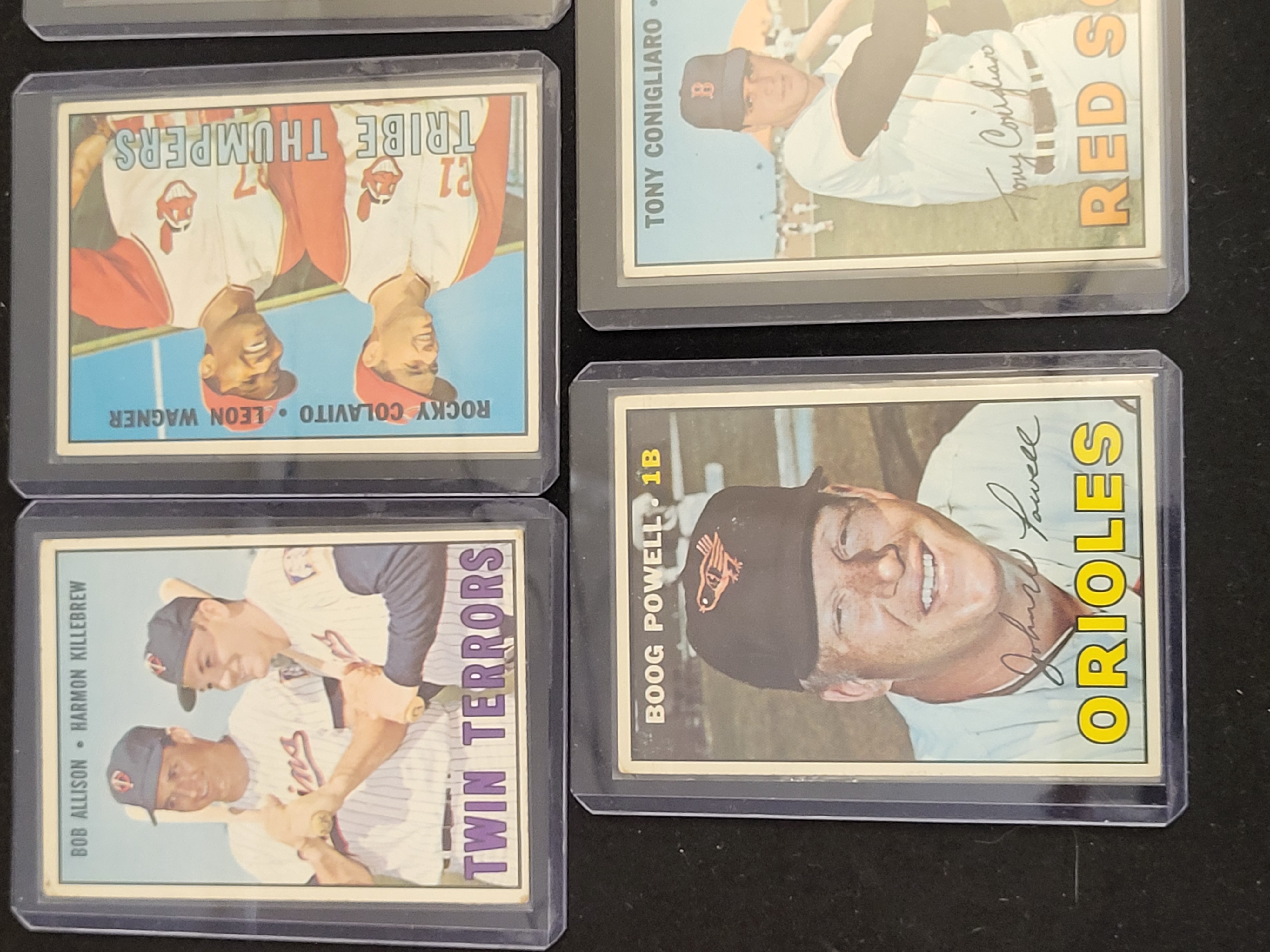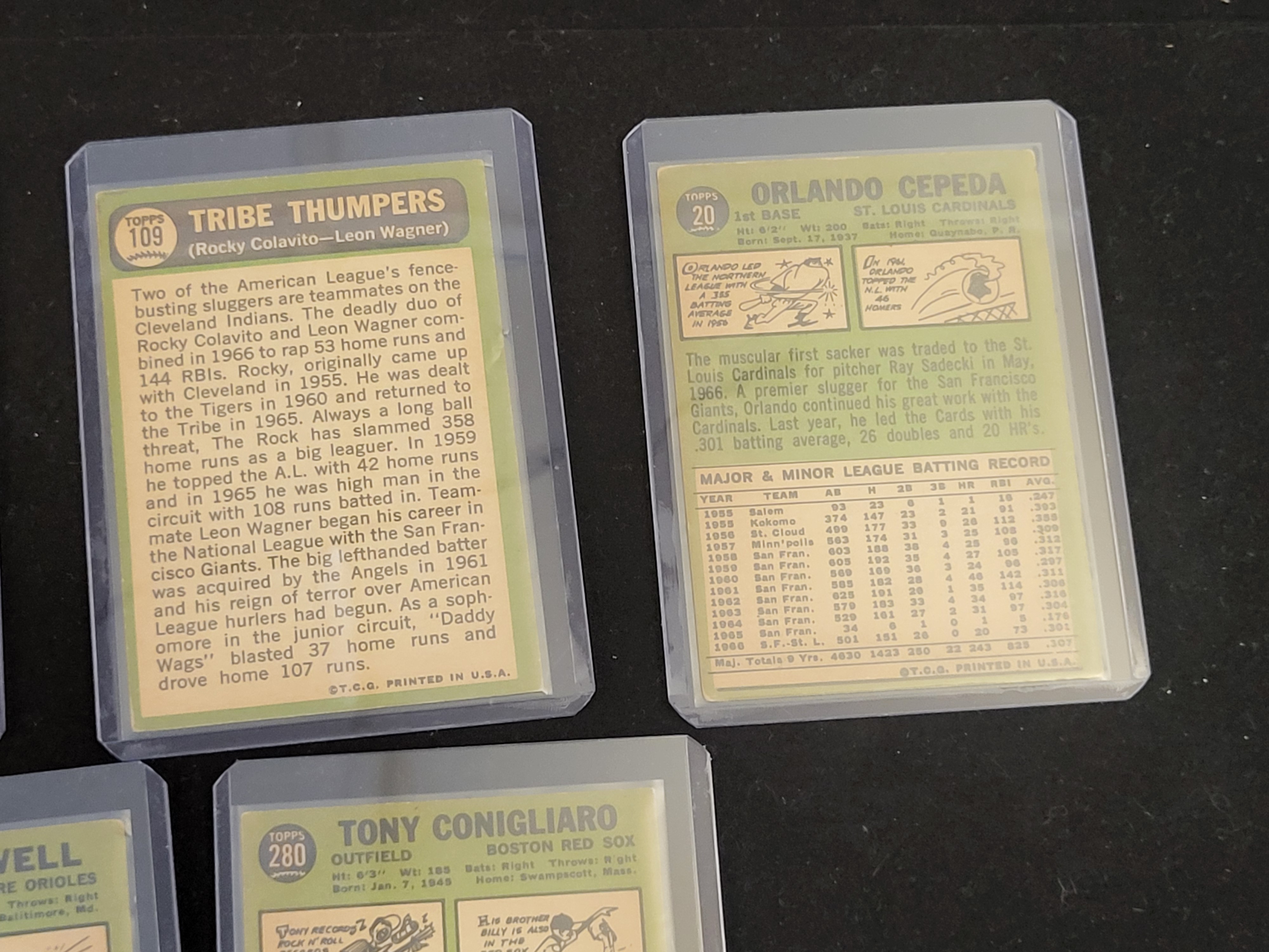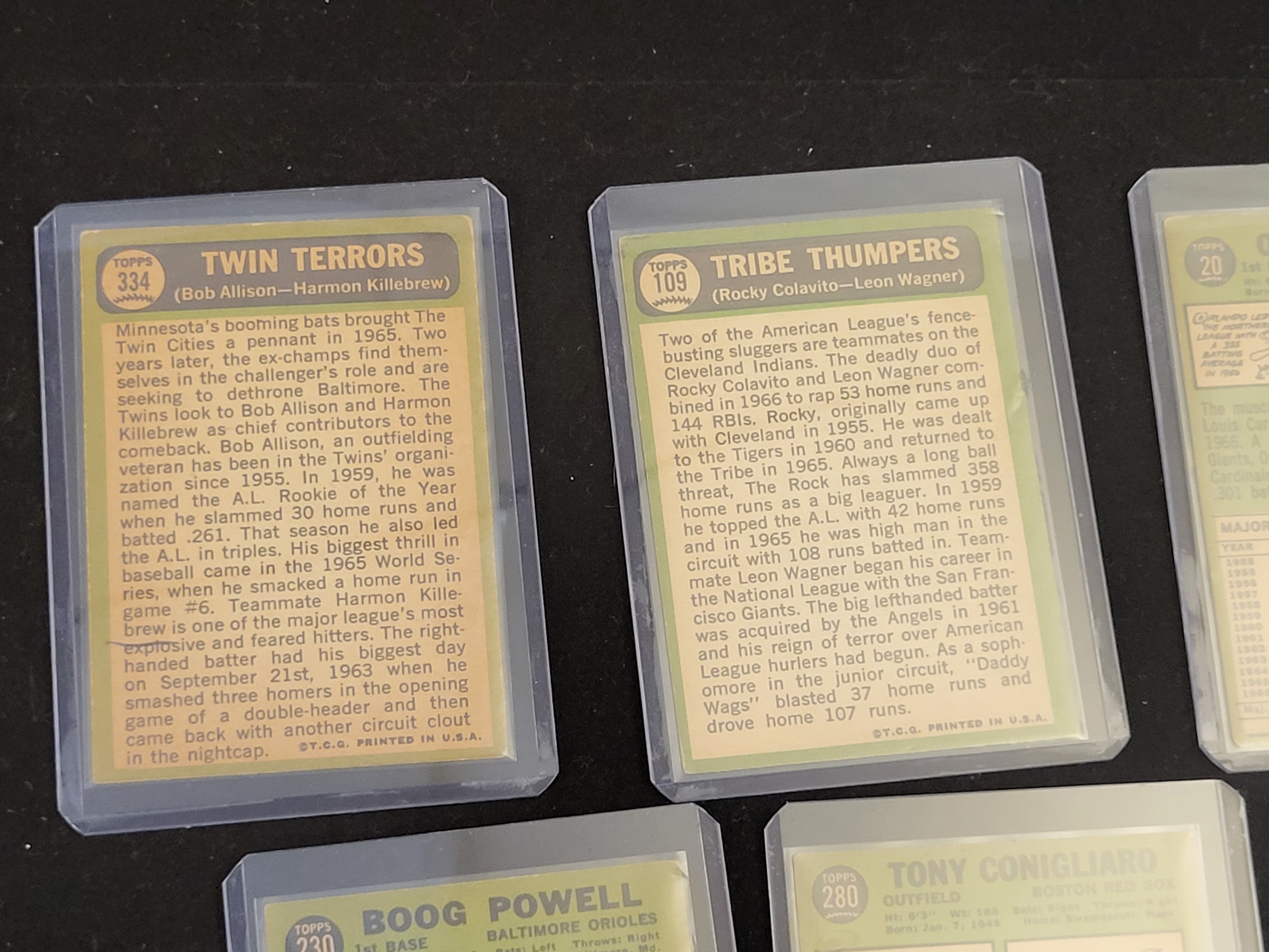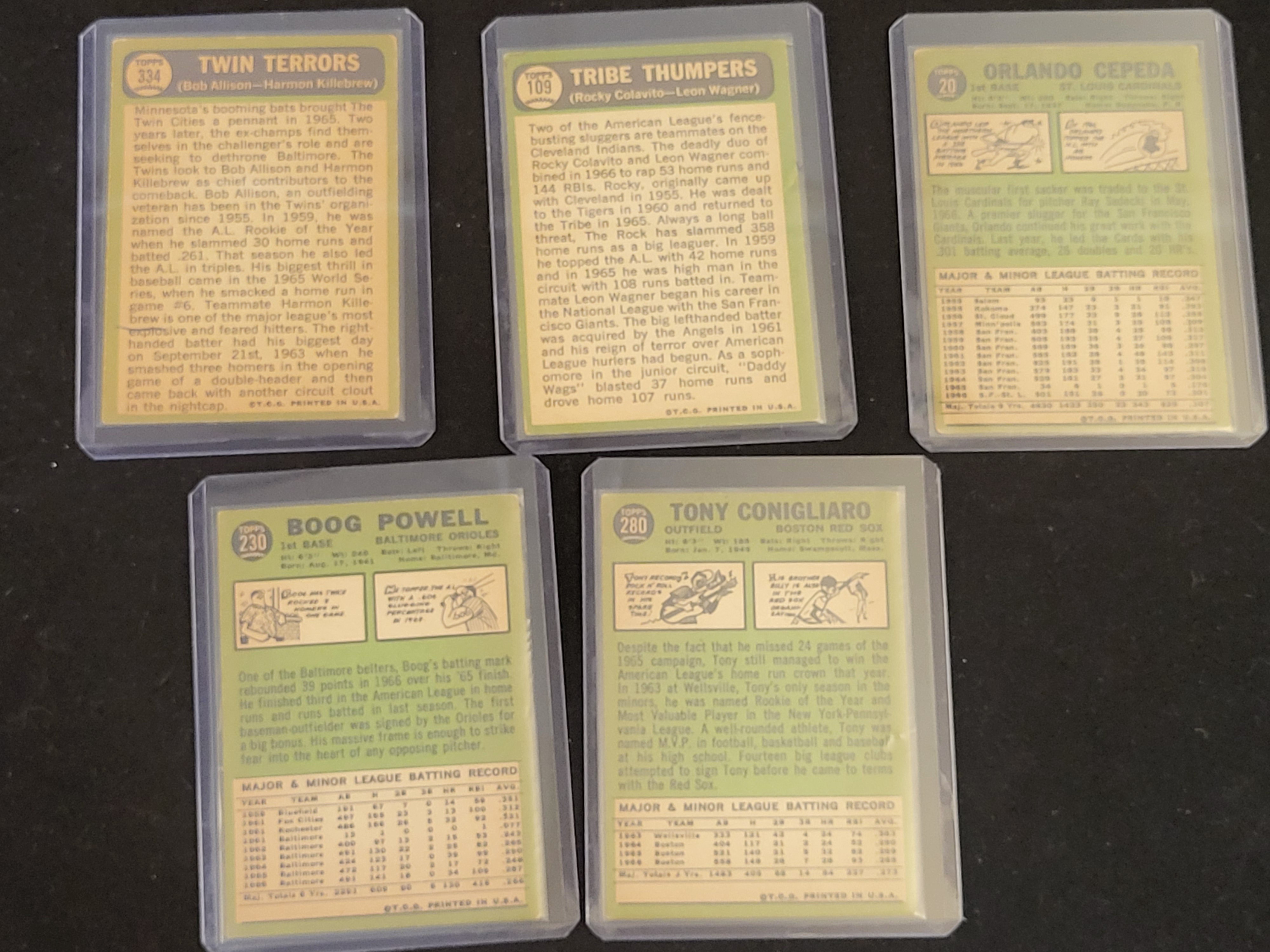 A collection of vintage 1967 Topps baseball cards printed on cardstock. The assortment includes individual player cards and multi-player feature cards. Featured individual cards include Hall of Fame first baseman Orlando Cepeda (No. 20) for the St. Louis Cardinals, Boog Powell (No. 230) for the Baltimore Orioles, and Tony Conigliaro (No. 280) for the Boston Red Sox. The multi-player cards consist of No. 334 Twin Terrors featuring Bob Allison and Harmon Killebrew of the Minnesota Twins, and No. 109 Tribe Thumpers featuring Rocky Colavito and Leon Wagner of the Cleveland Indians. The card fronts utilize color photography in both action and portrait styles. The reverse sides feature a light green color scheme with player biographies and major and minor league batting records updated through the 1966 season. All cards are housed in clear plastic top-loader protective sleeves.