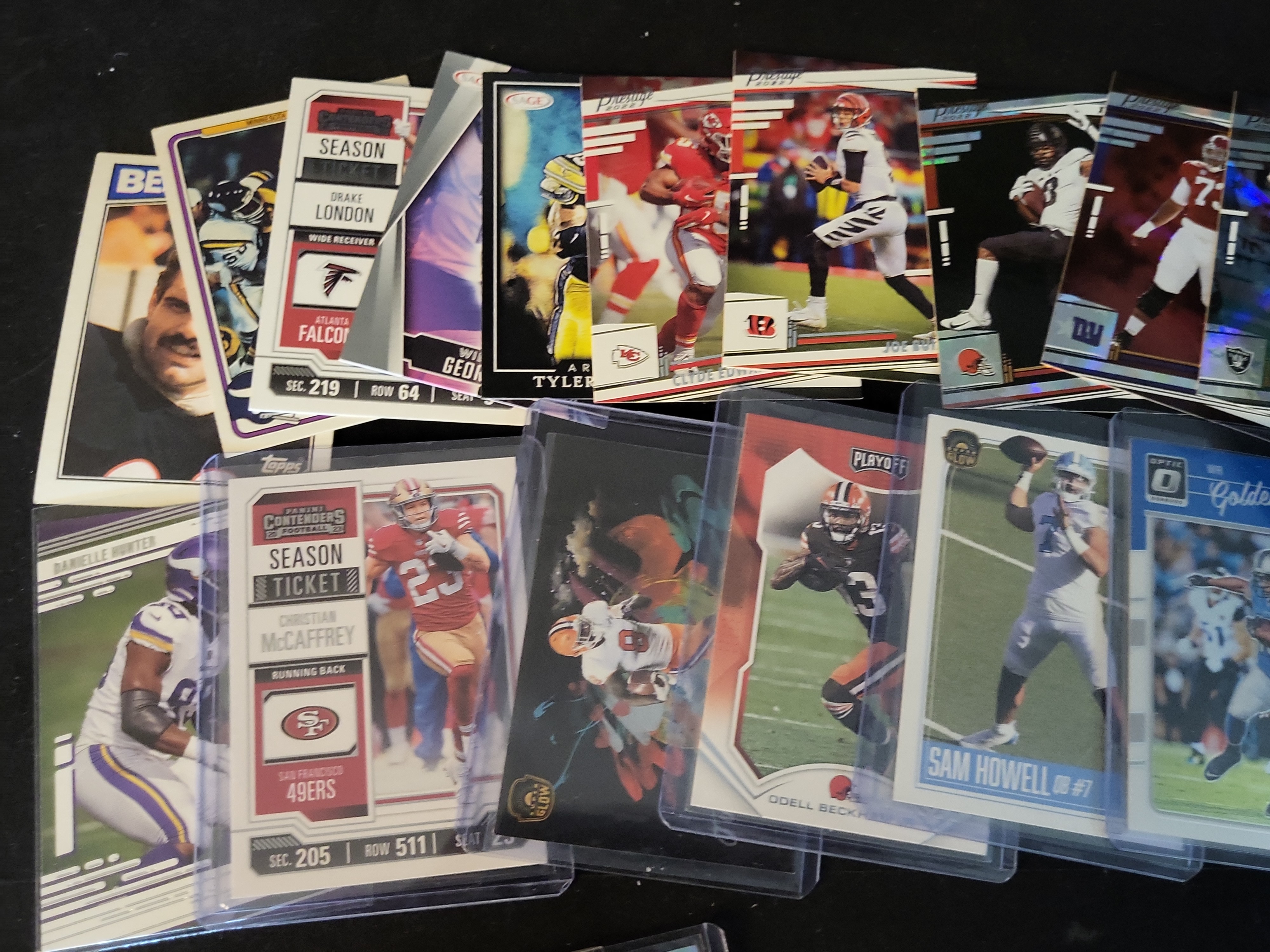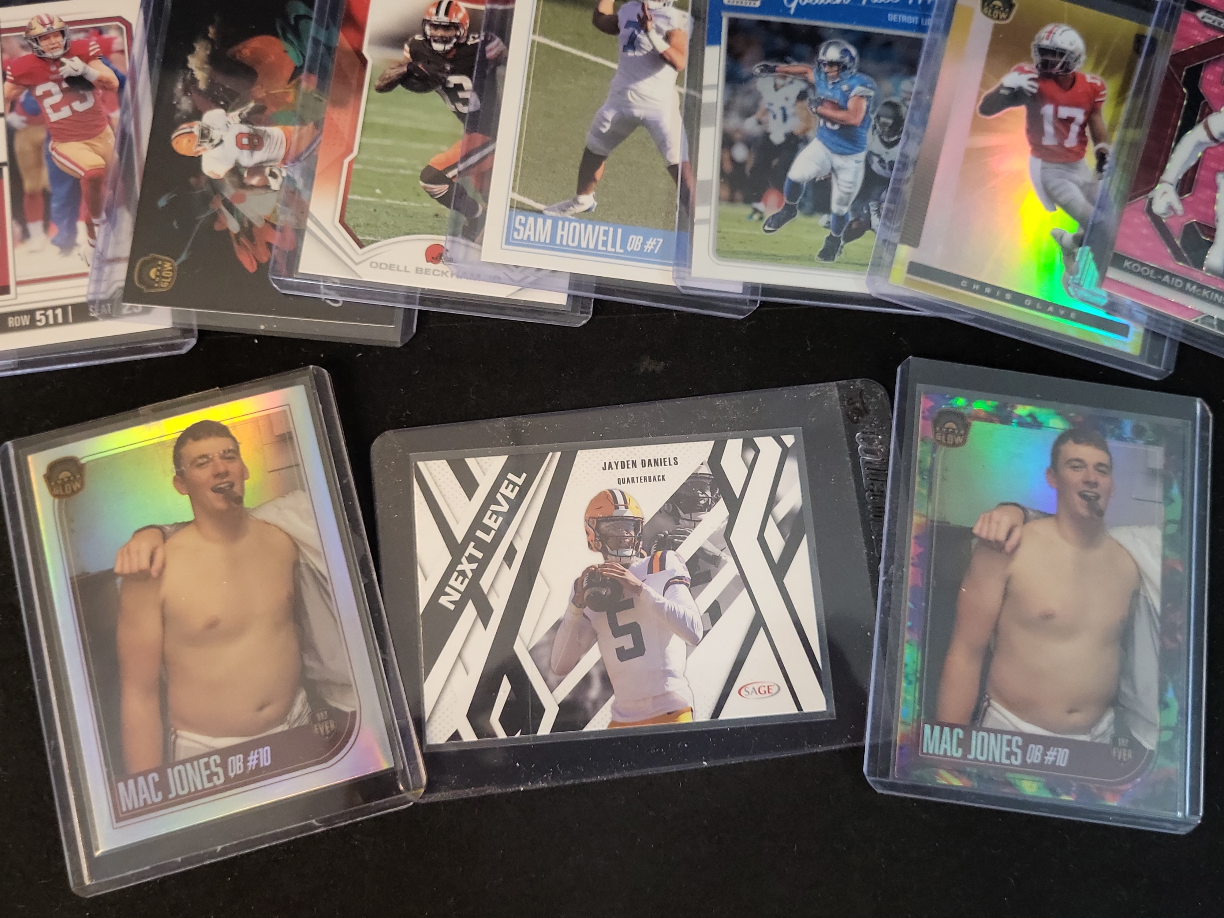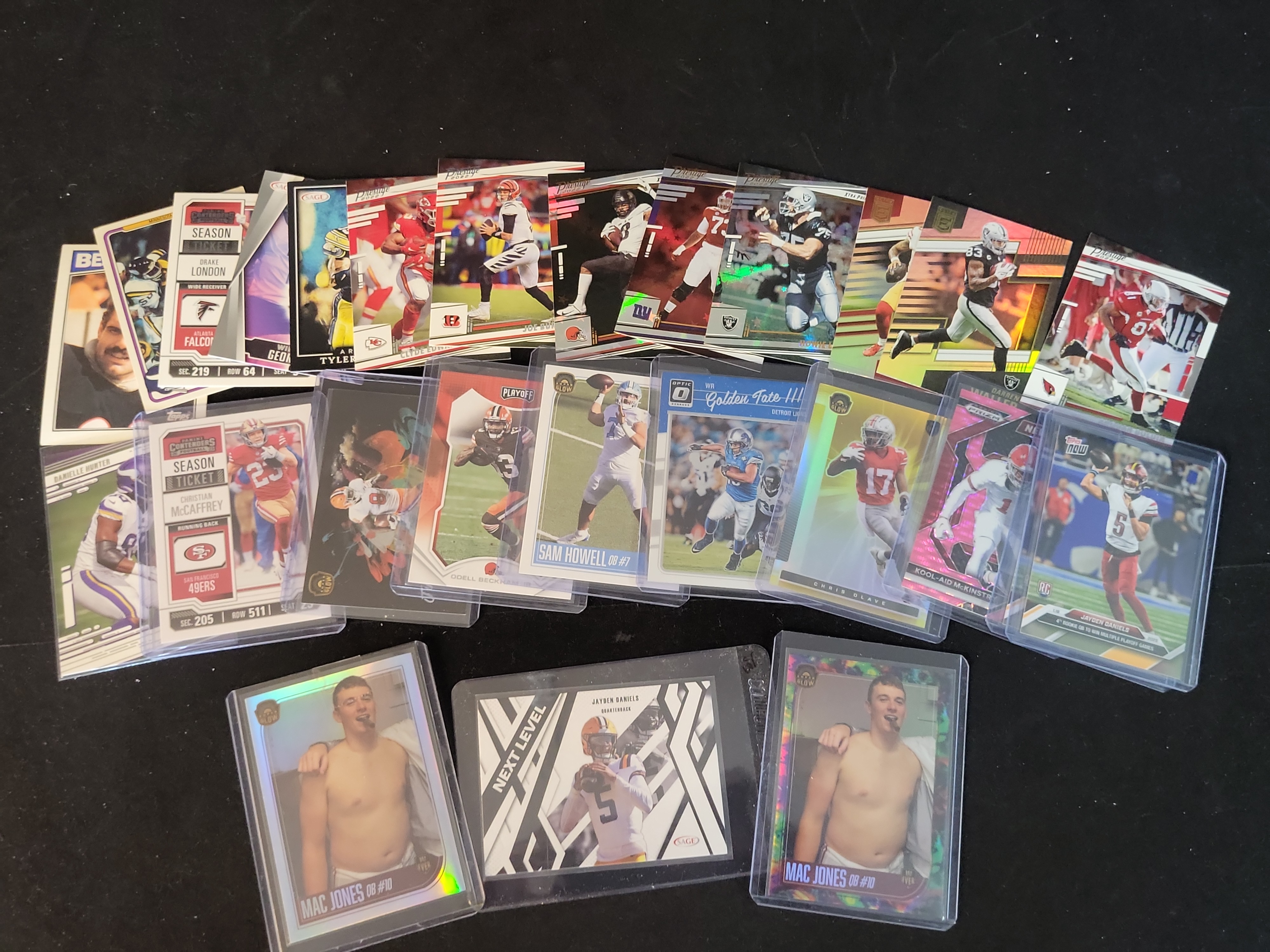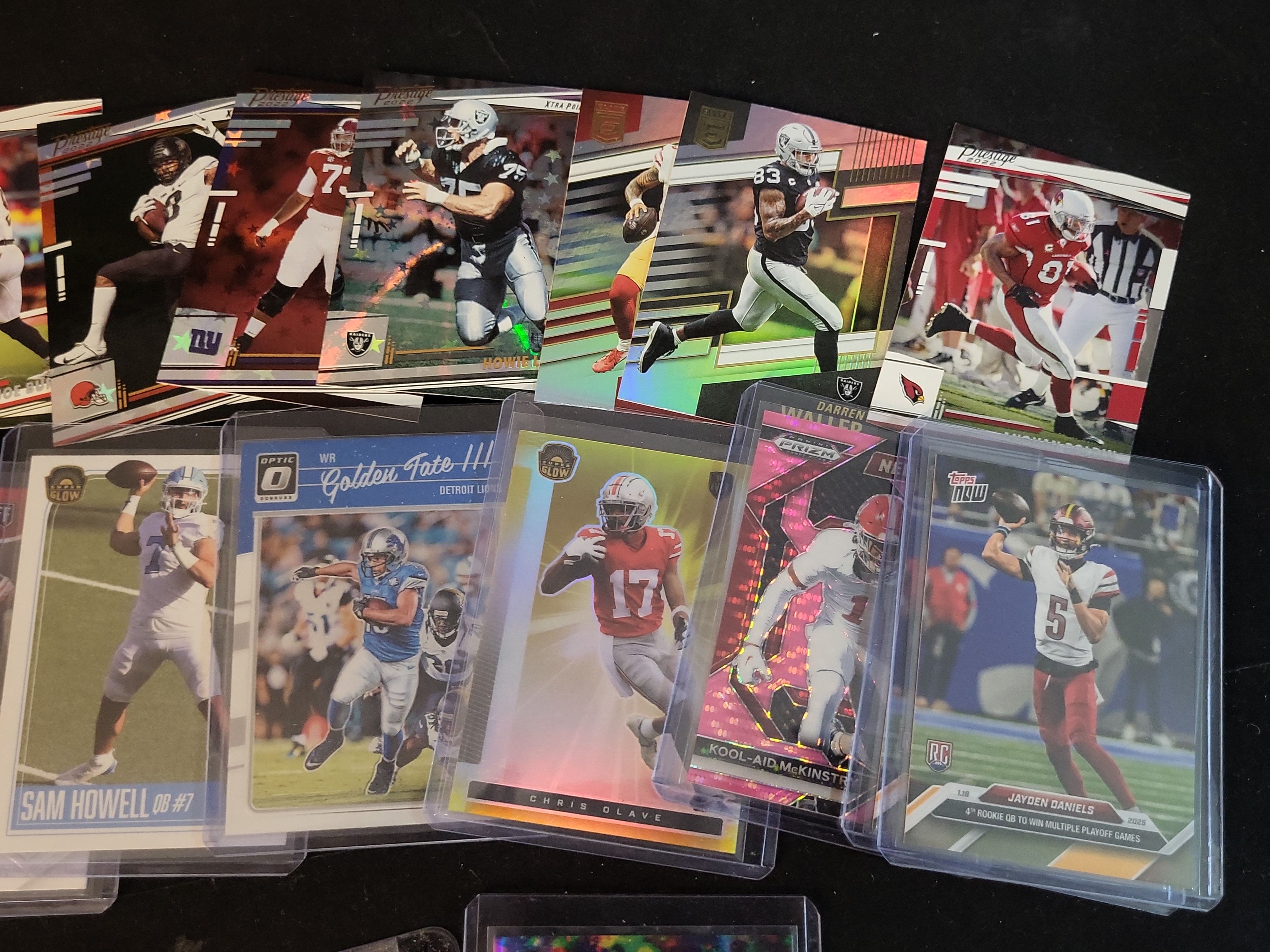 BID PER WHAT YOU SEE IN THE PHOTO, NOT THE AI GENERATED TITLES AND DESCRIPTIONS! Football Trading Card Collection 25+ Cards Jayden Daniels RC Mac Jones Super Glow Panini Prizm
