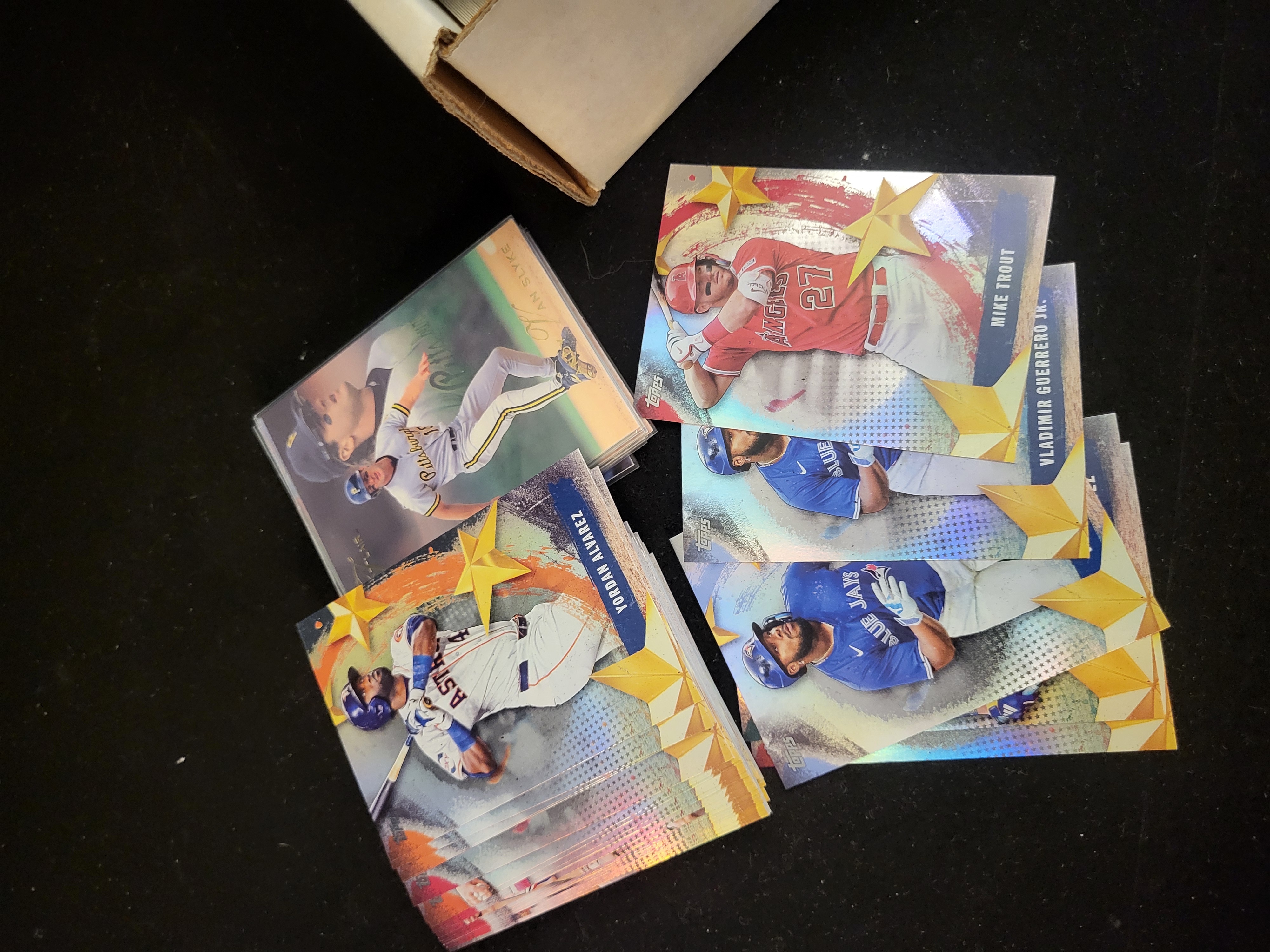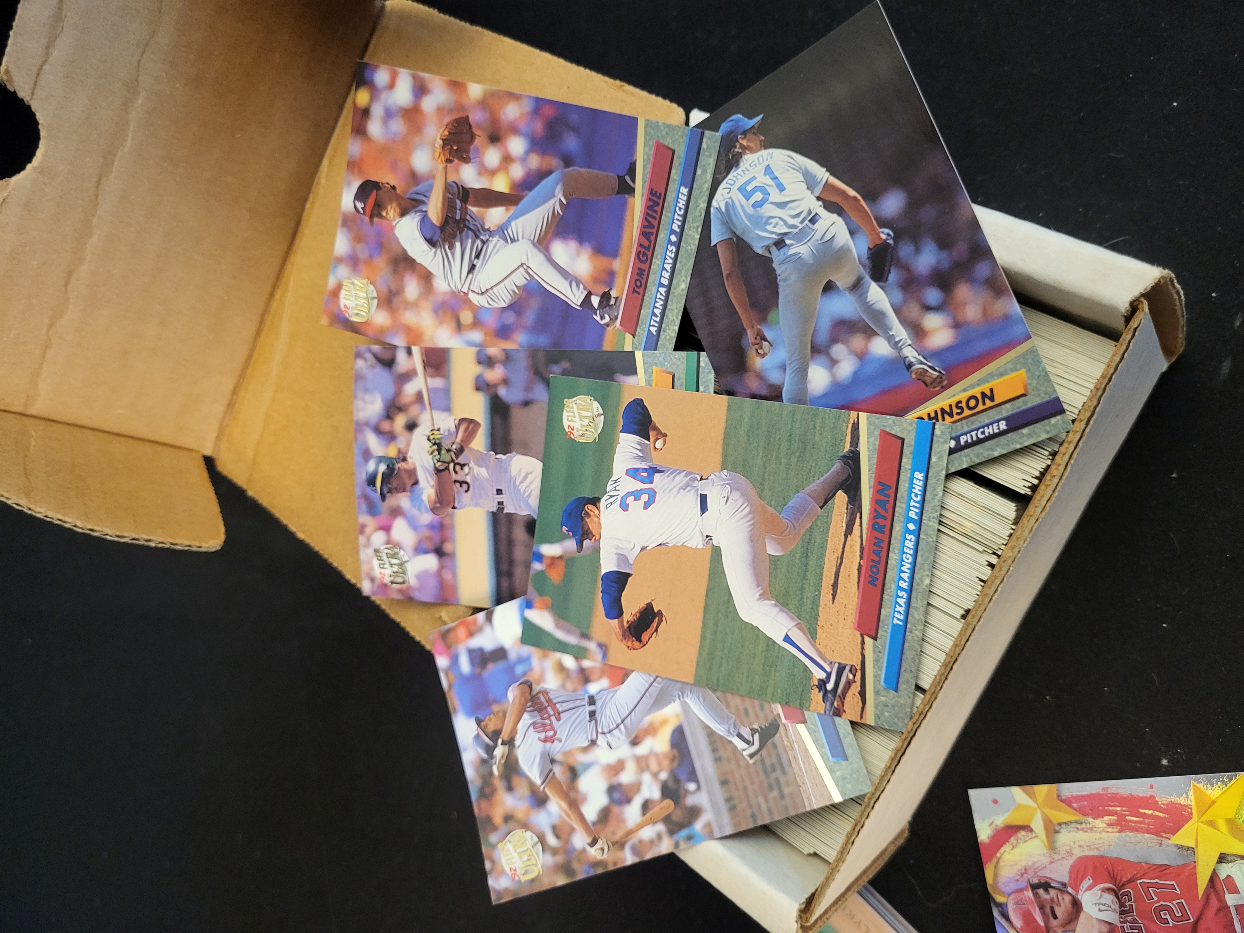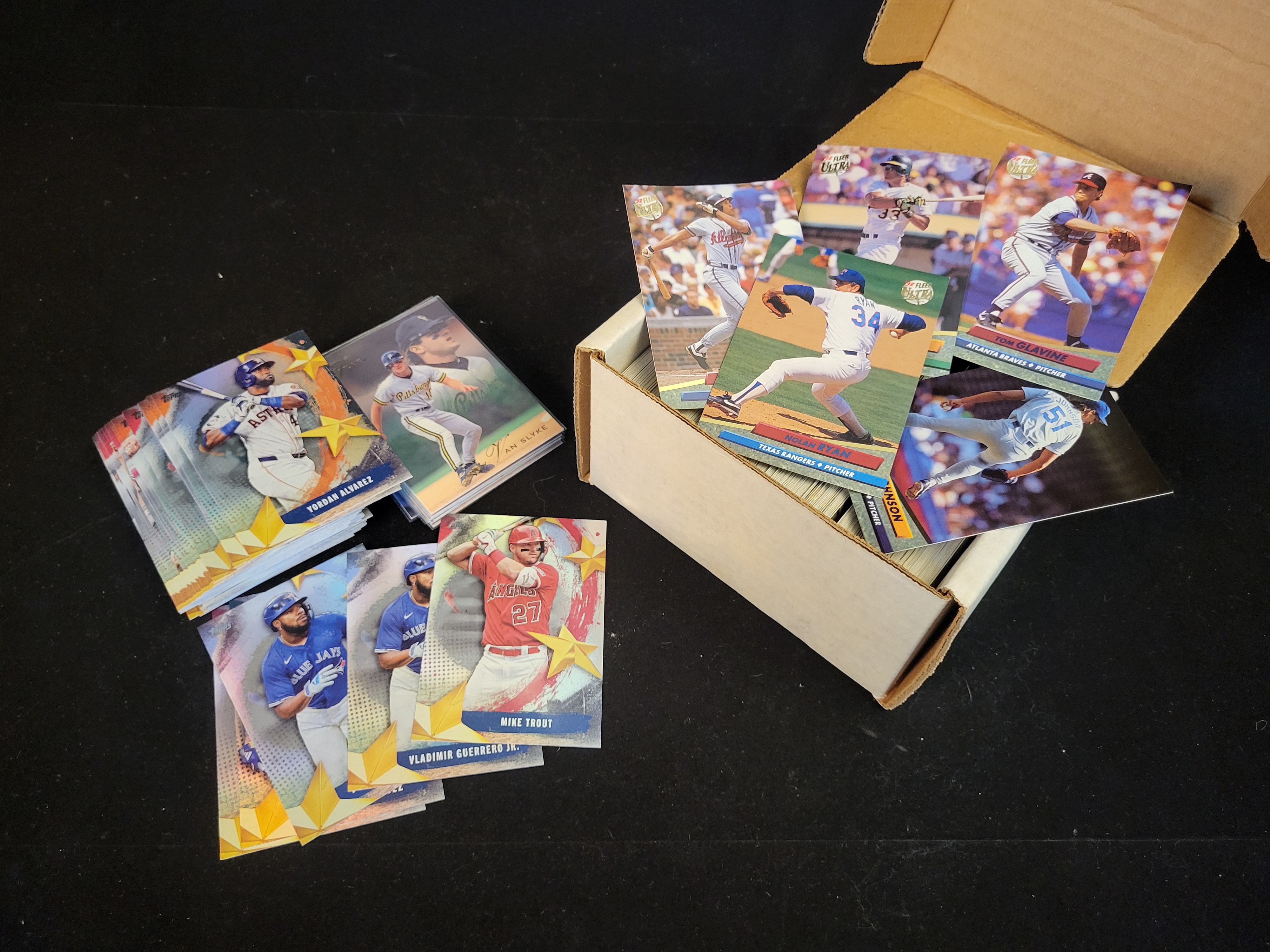 A collection of baseball trading cards featuring various manufacturers and eras. The group includes early 1990s Fleer Ultra cards and modern Topps holographic and foil-finish cards. Notable players identified within the collection include Nolan Ryan, Tom Glavine, Randy Johnson, Mike Trout, Yordan Alvarez, and Vladimir Guerrero Jr. The modern Topps cards include examples from the Stars of MLB insert series. The cards are presented in several stacks and within a standard white cardboard storage box, with some individual cards protected in clear plastic sleeves.