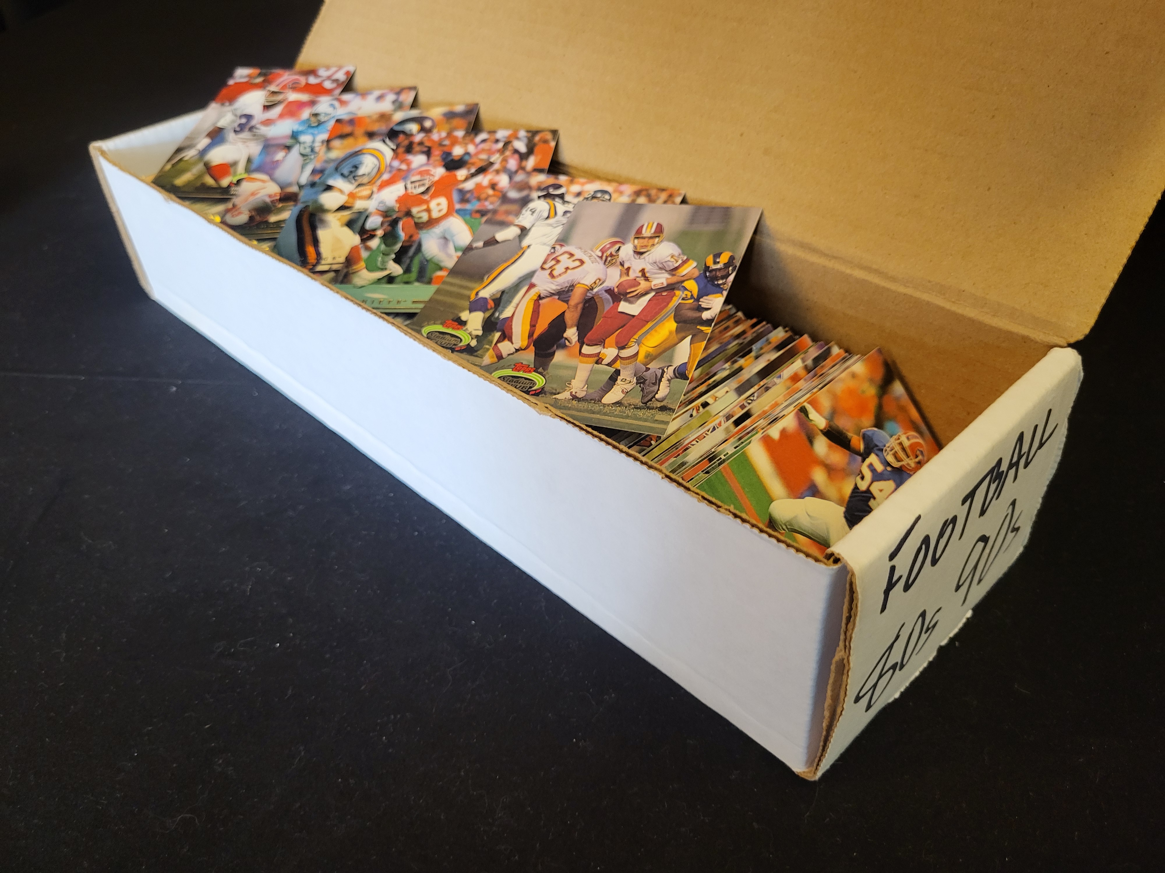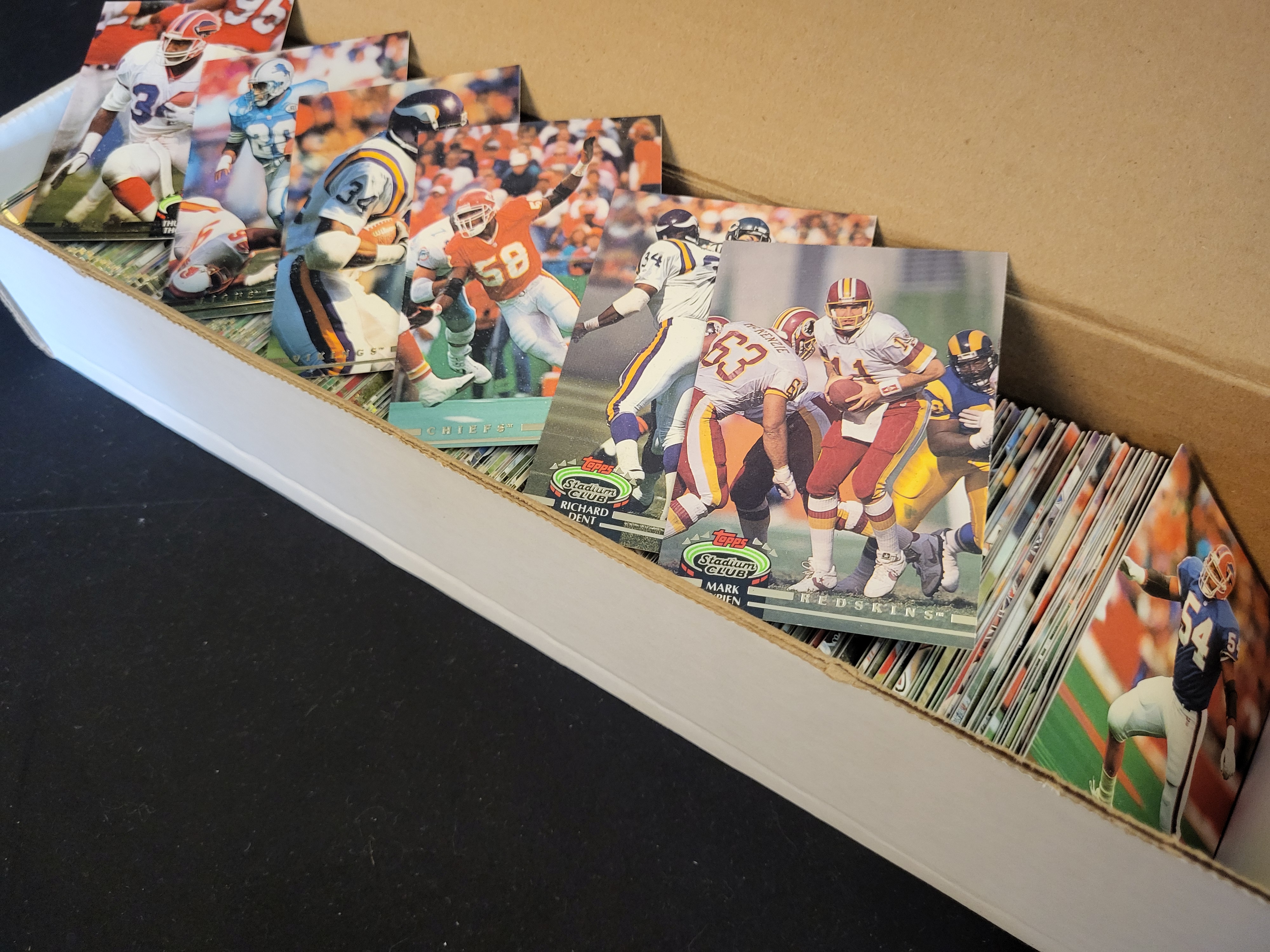 1992 Topps Stadium Club Complete Set NFL Football. The collection includes National Football League players and teams, from the Topps Stadium Club series. Specific cards observed include Mark Rypien of the Washington Redskins and Richard Dent of the Minnesota Vikings. The cards are printed on standard cardstock and are housed in a white cardboard storage box featuring hand-labeled ink markings on one end. This lot is a complete set.