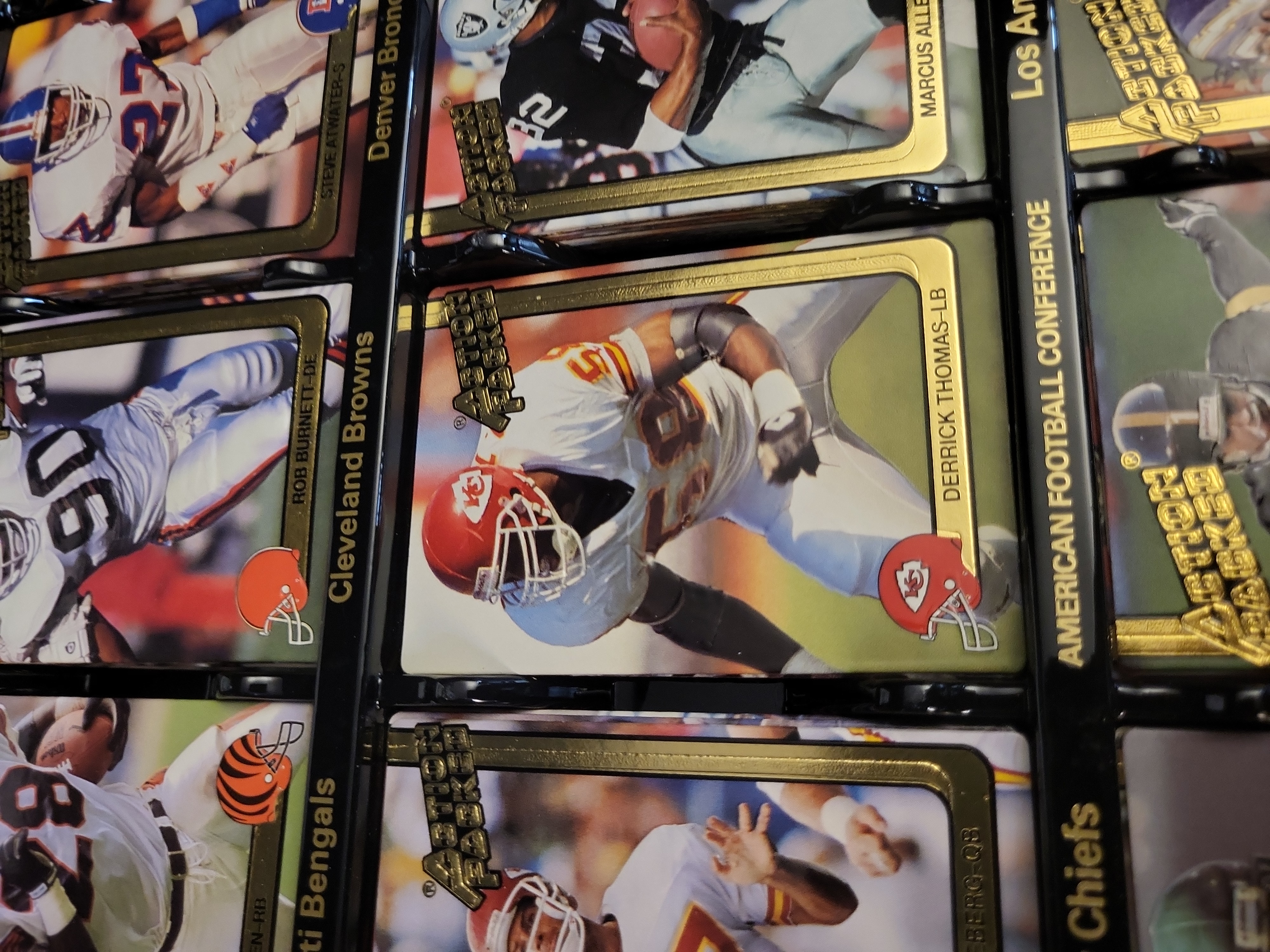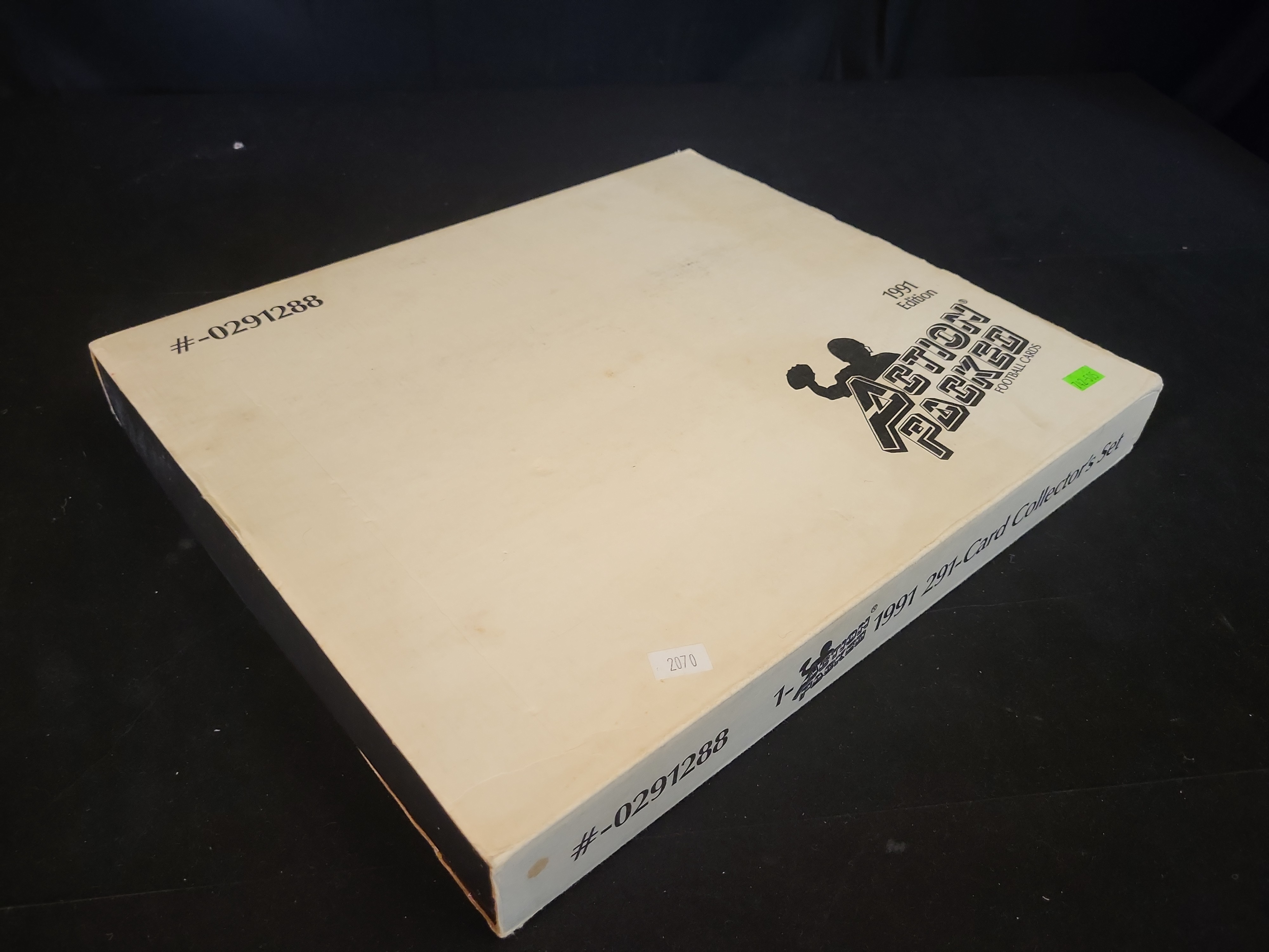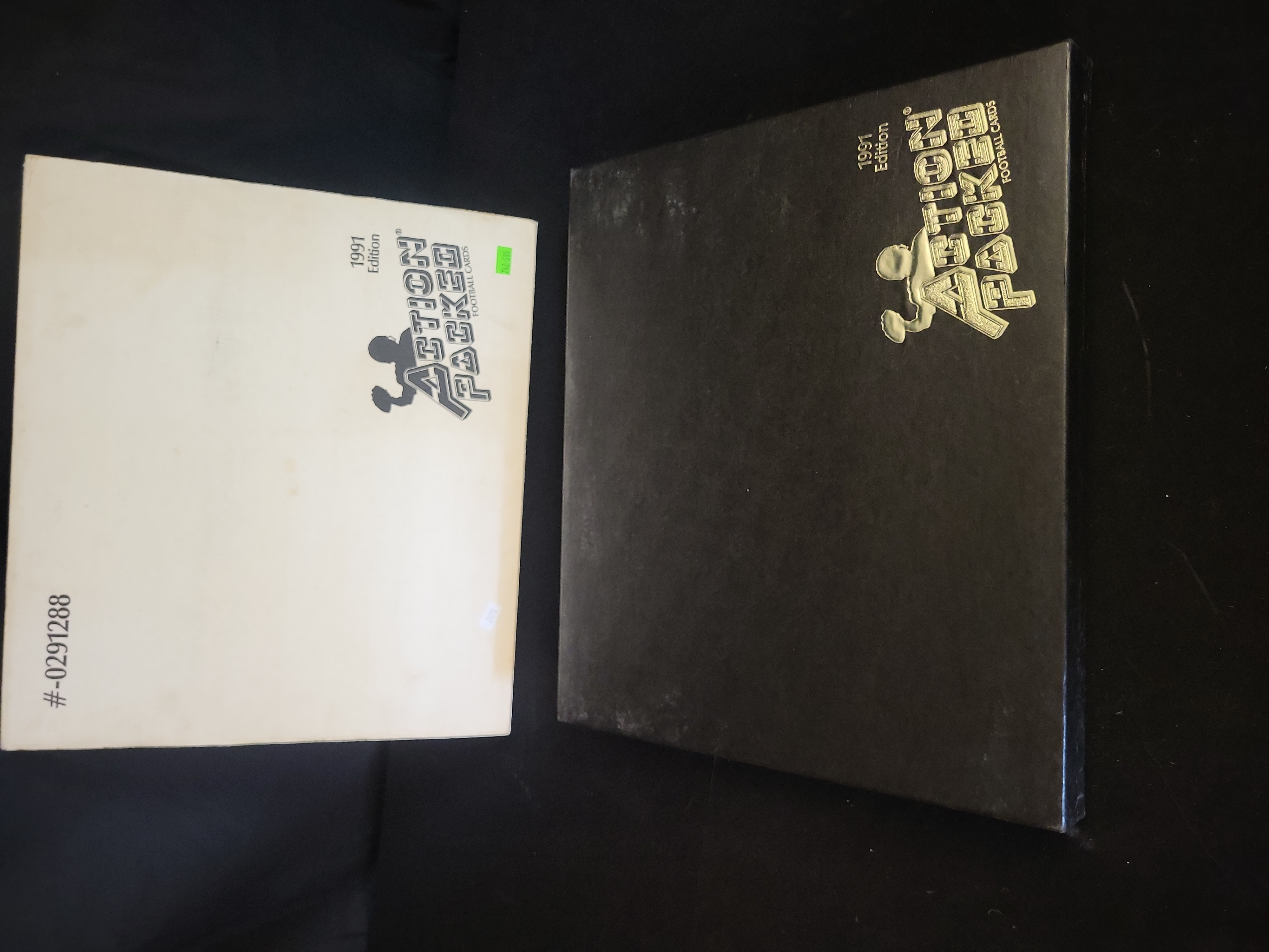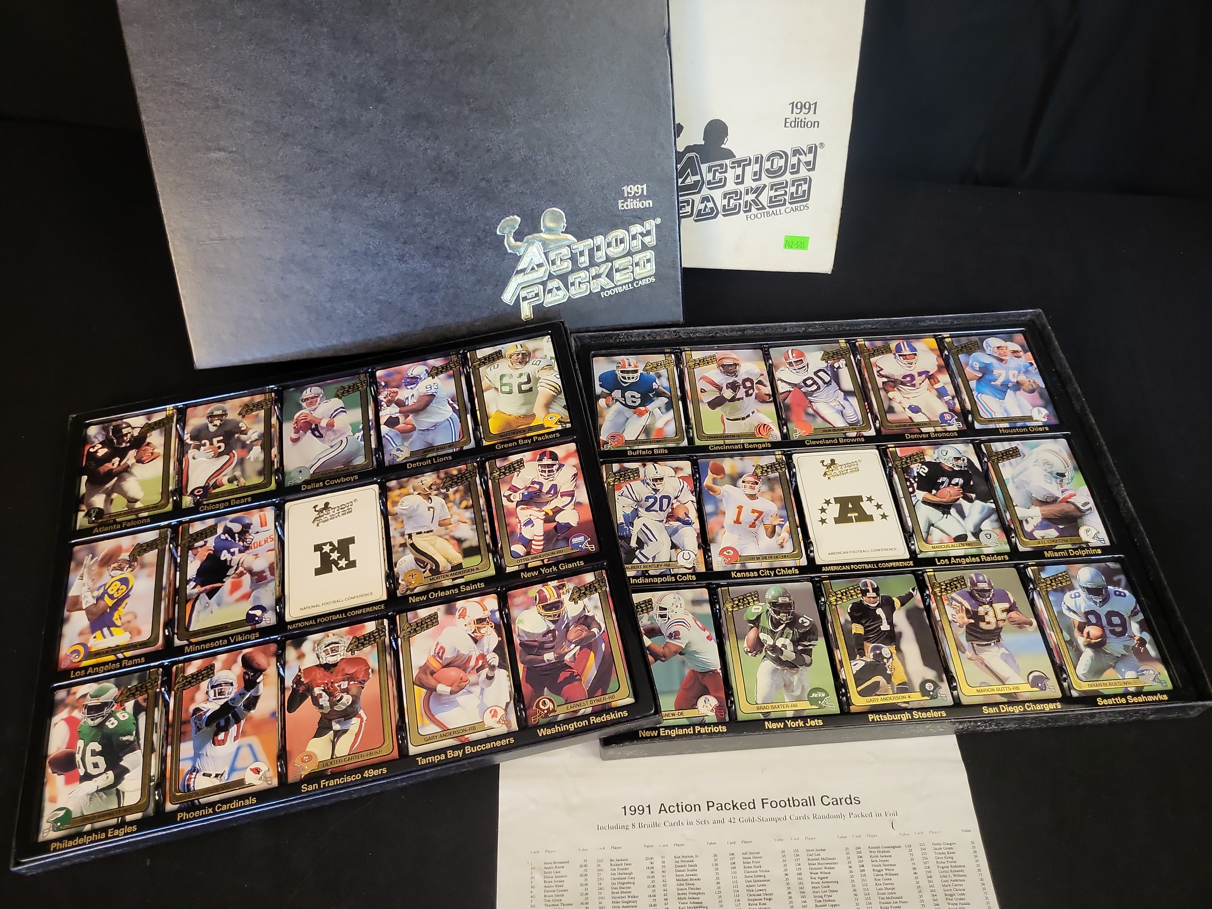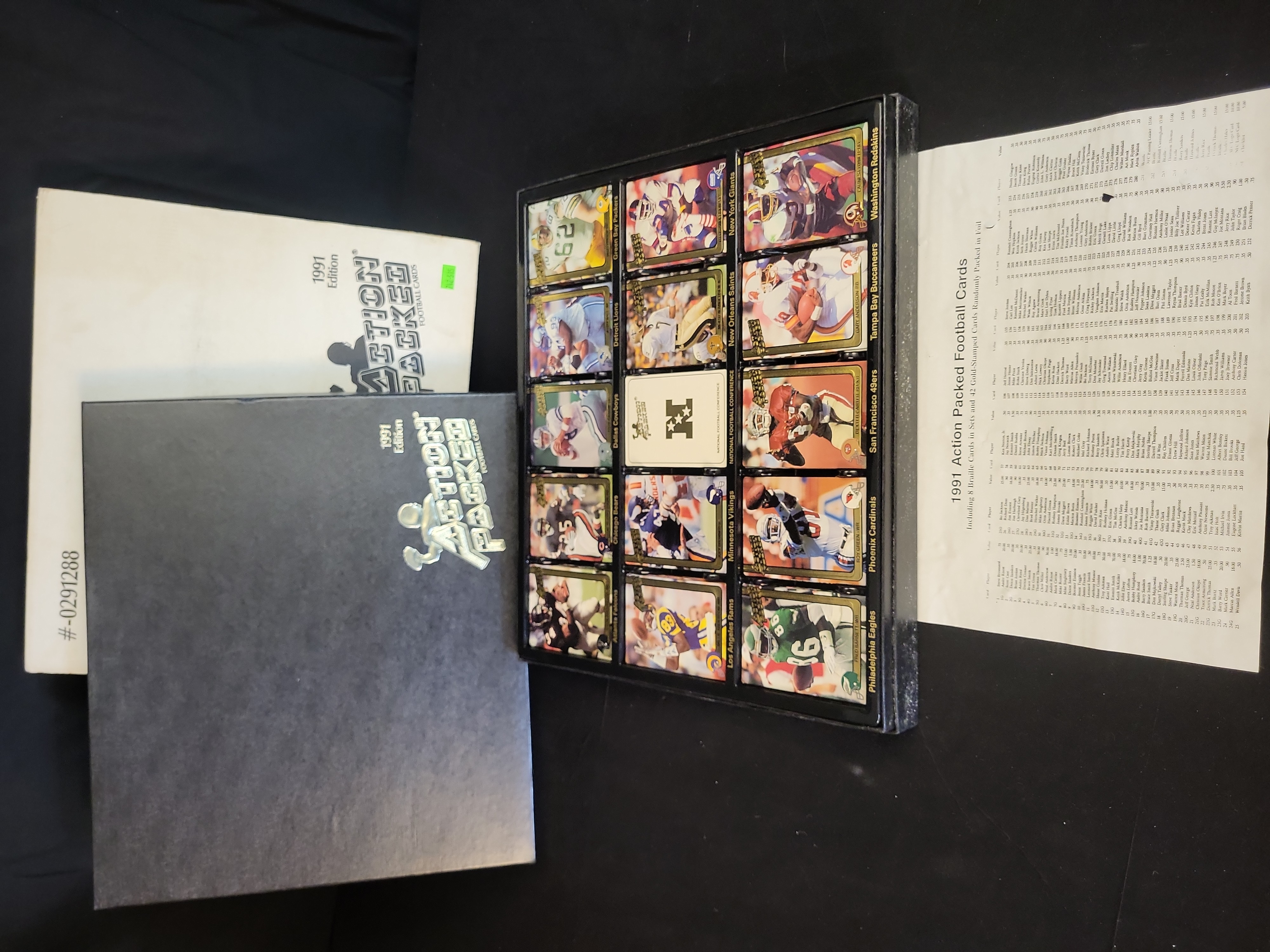 This is a complete 1991 Action Packed Football Factory Collector’s Set, featuring the full 281-card base series. This premium release is housed in its original presentation packaging, consisting of a black textured outer slipcase with gold foil branding and a serial-numbered white inner box. The set is uniquely presented in two black plastic molded display trays where the cards are arranged in a shingled, overlapping layout by team and conference. These cards feature the brand’s signature embossed 3D surface where the player images are raised from the background. Key stars and Hall of Famers visible in the display include Marcus Allen and Derrick Thomas. The set is accompanied by the original National Football Conference (NFC) and American Football Conference (AFC) divider cards and the factory-issued checklist and price guide. The inner box and outer sleeve are both marked with serial number #-0291288.