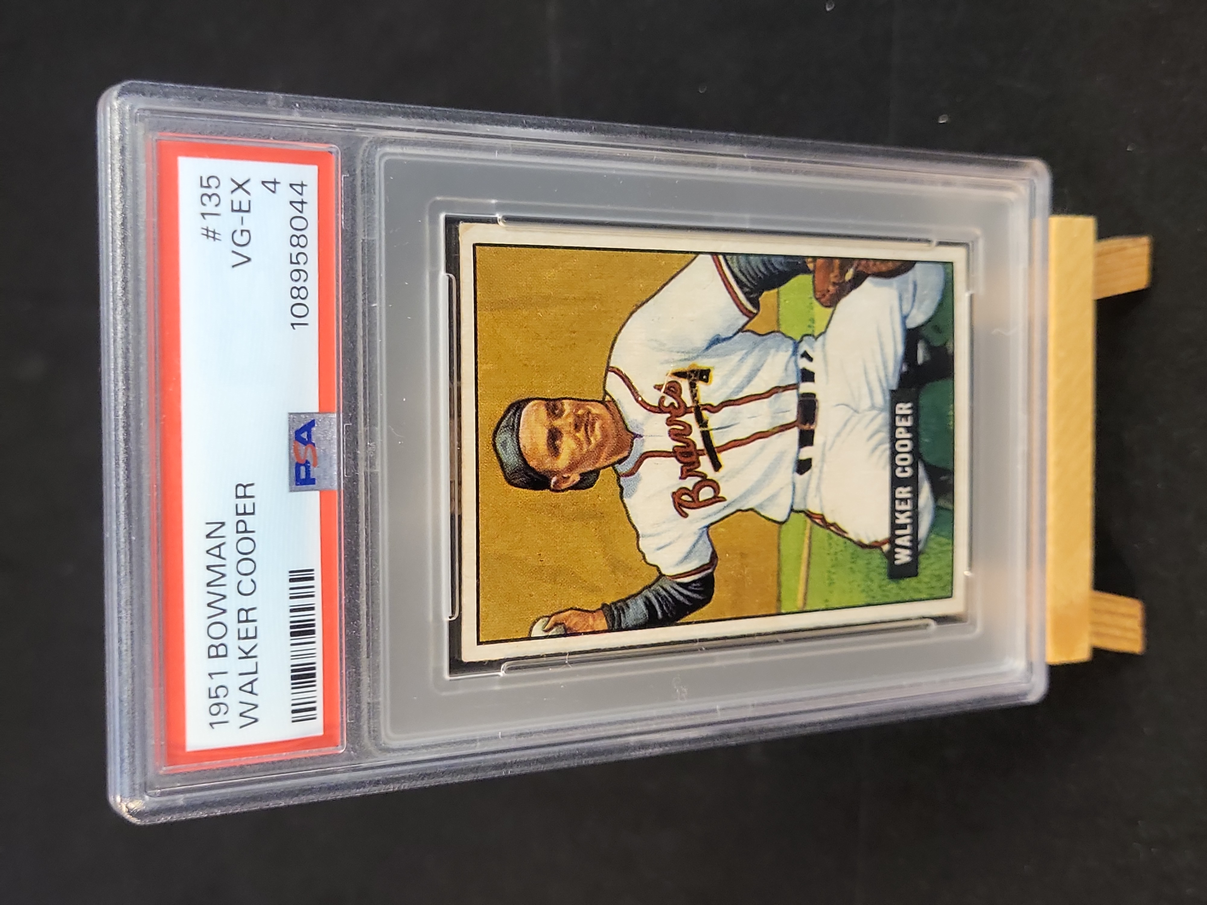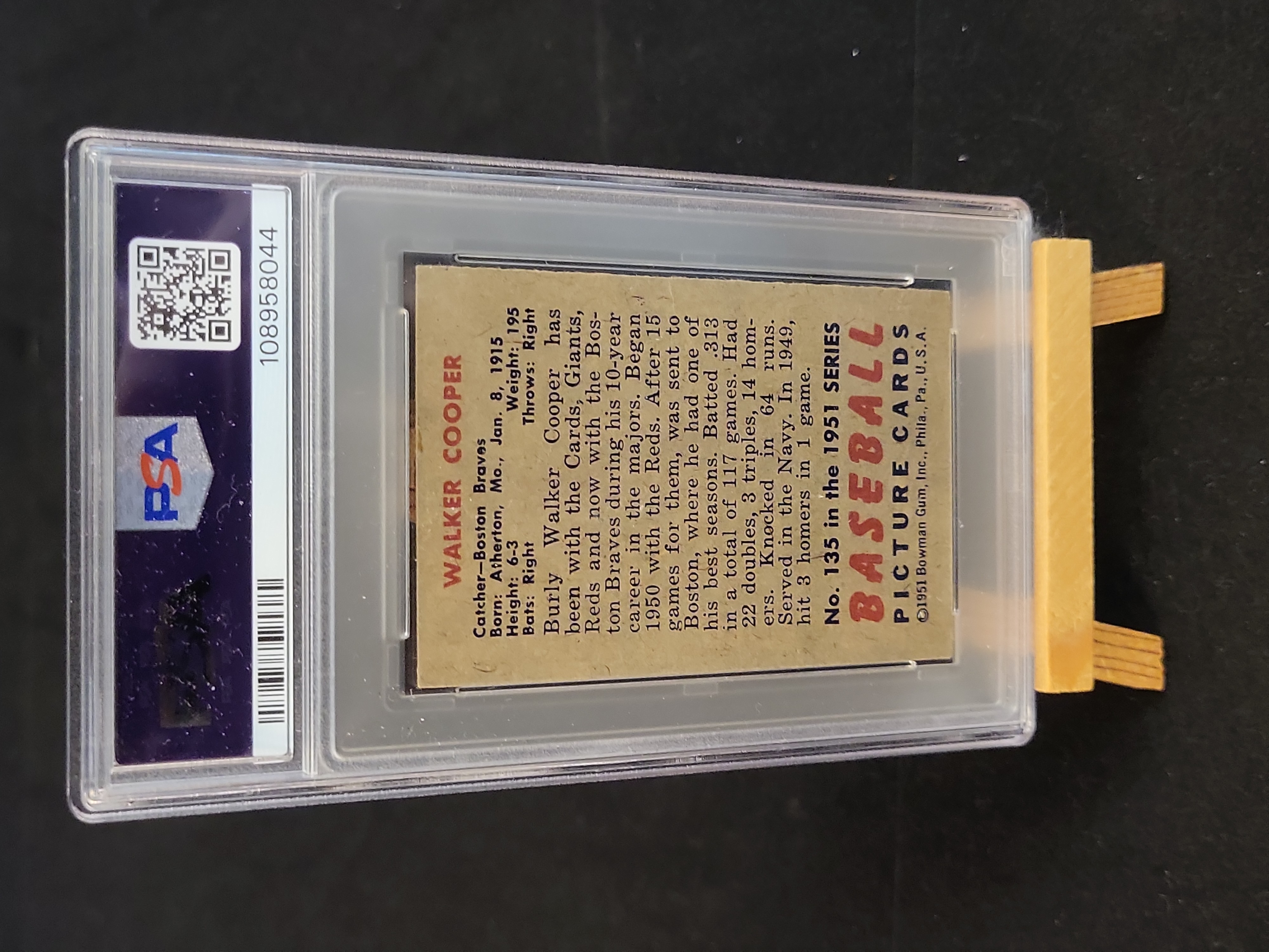 Brand: Bowman. Year: 1951. Set: 1951 Bowman Baseball. Card Number: 135. Player: Walker Cooper. Team: Boston Braves. Rookie Status: No. Parallel Type: Base. Certification: PSA 108958044.