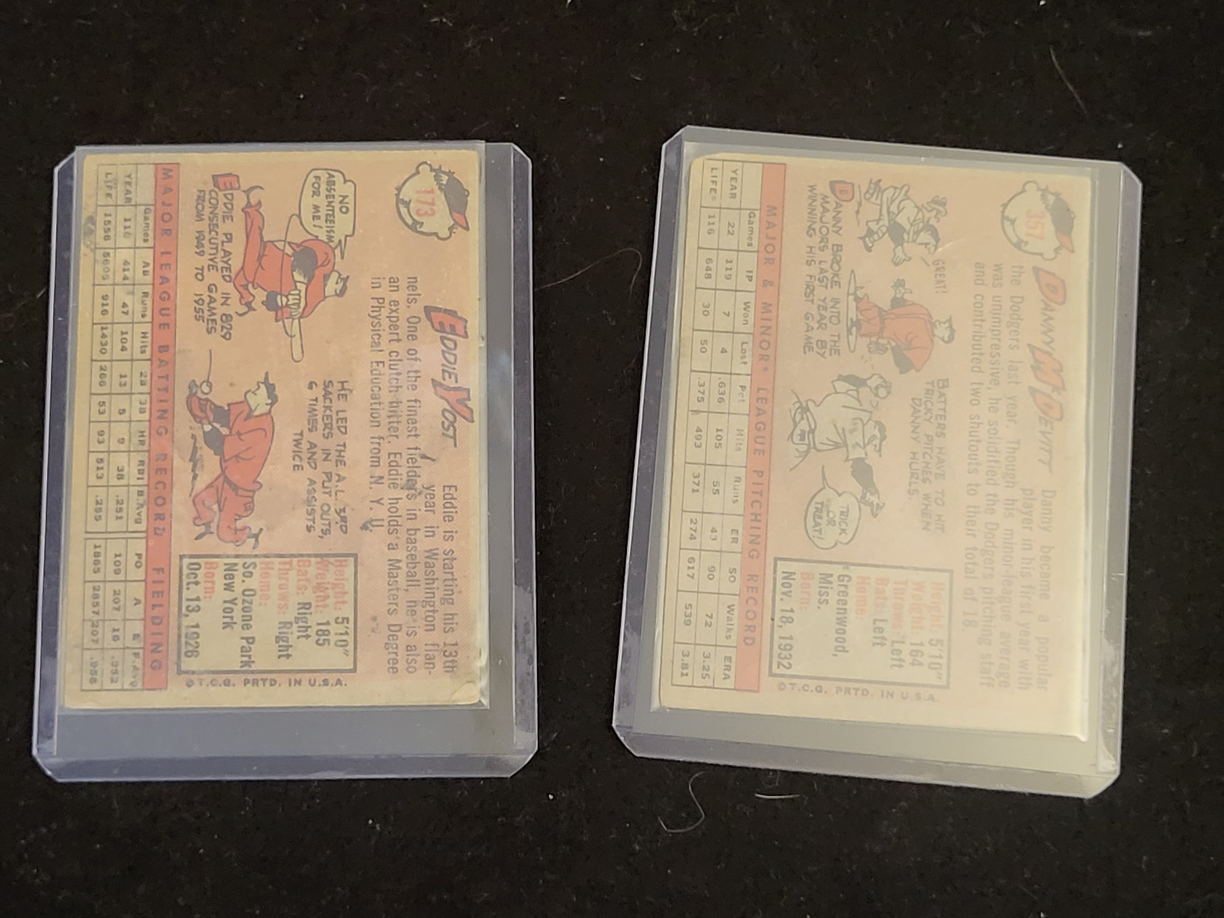 This lot comprises two vintage baseball cards from the 1959 Topps series. The first card features Eddie Yost of the Washington Senators, designated as card number 173, shown in a batting pose. The second card features Danny McDevitt of the Los Angeles Dodgers, designated as card number 357, shown in a portrait view. Both cards utilize the characteristic 1959 design with a bright yellow background and player names printed in red and pink. The reverse of each card is printed in a salmon and white color scheme and contains player biographies, career statistics, and illustrative cartoons. Each card is marked with the copyright notice T.C.G. PRTD. IN U.S.A. on the reverse side. The cards are presented in individual protective plastic top-loaders.