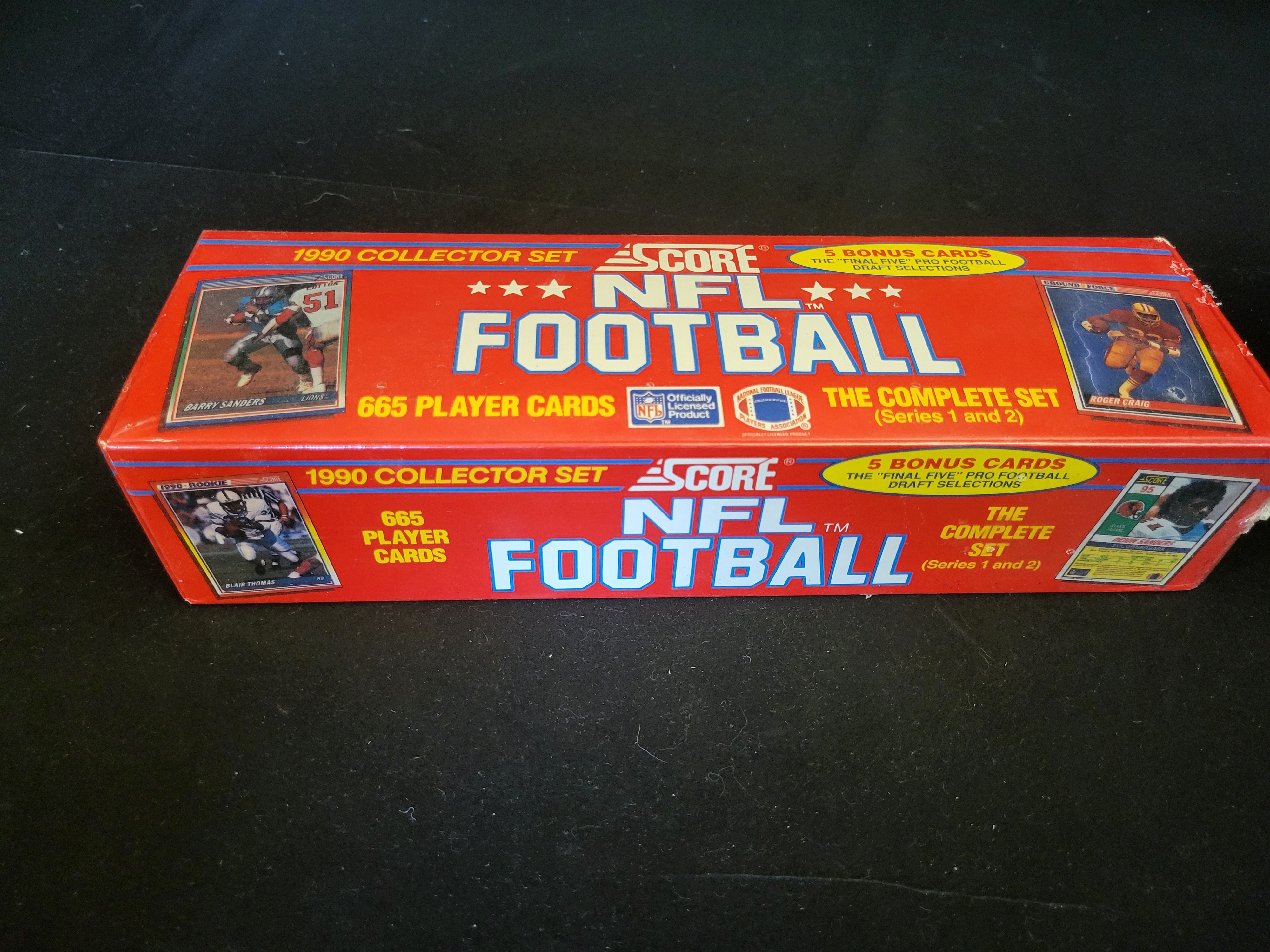 This 1990 Score NFL Football Collector Set is a factory-sealed box containing the complete Series 1 and 2. The set comprises 665 player cards plus five bonus "Final Five" pro football draft selection cards. The red cardboard packaging features graphics of prominent players of the era, including Barry Sanders, Roger Craig, Blair Thomas, and Deion Sanders. The box displays official licensing logos for the NFL and the NFL Players Association. It is identified as product number 99600 and lists a manufacturer address in Grand Prairie, Texas.