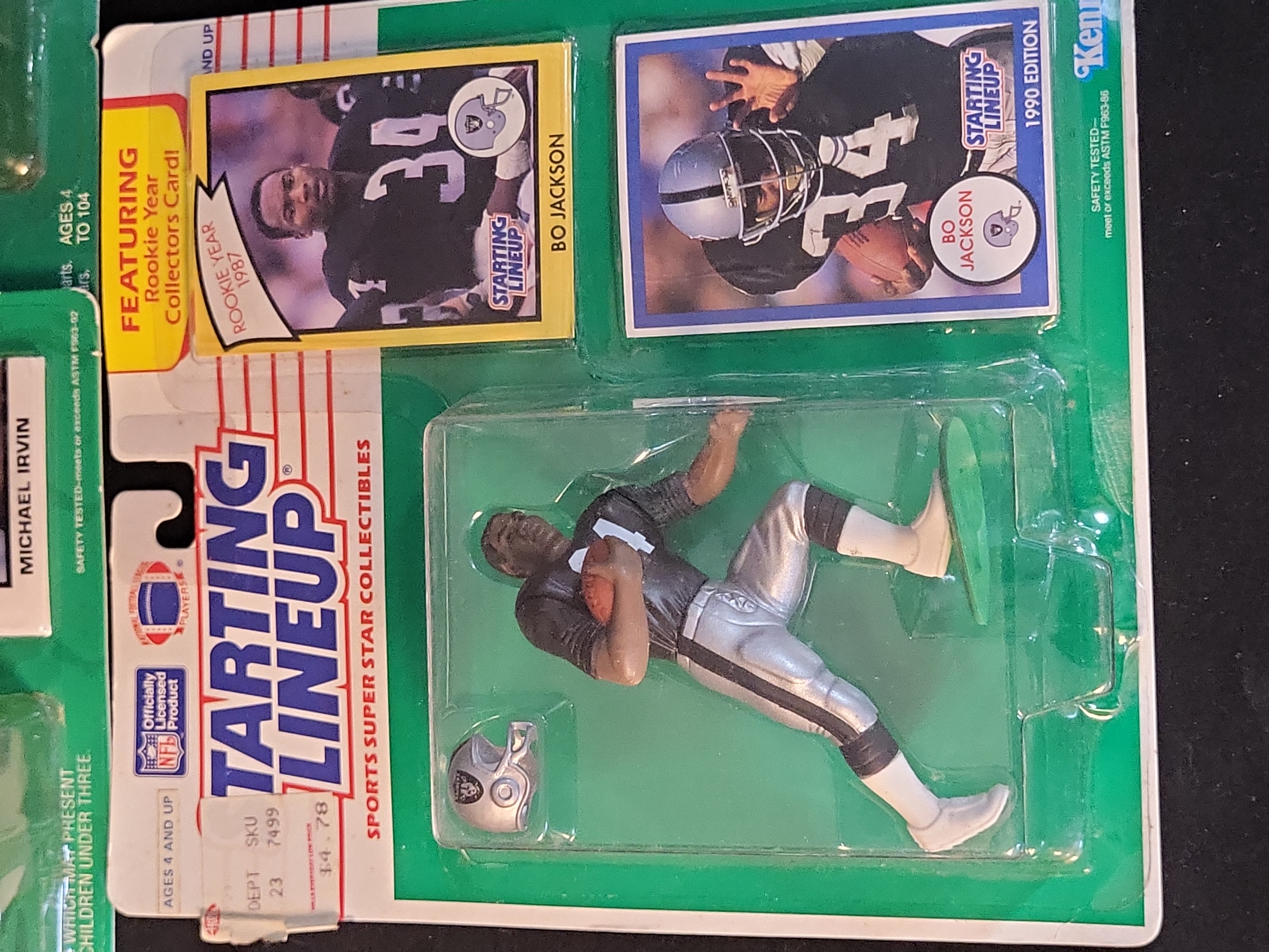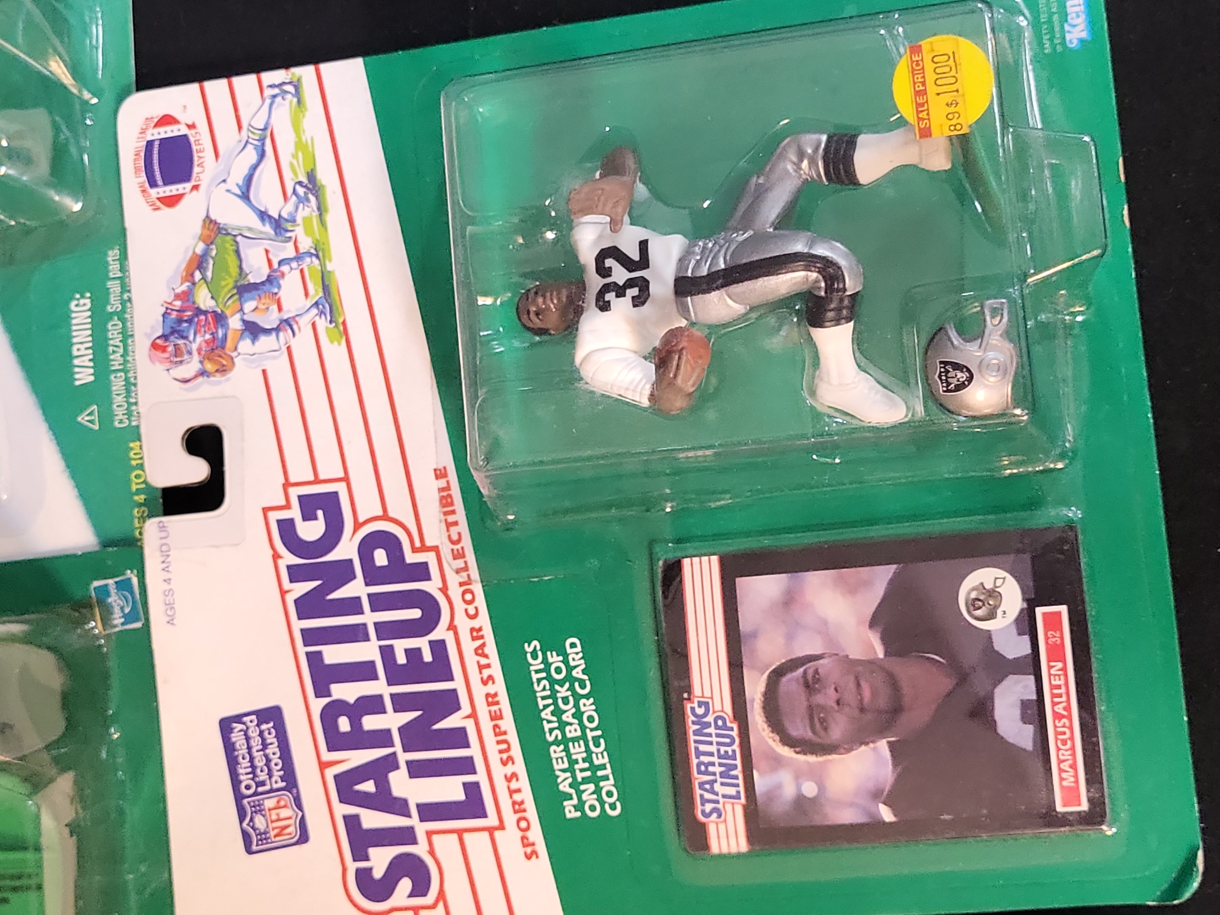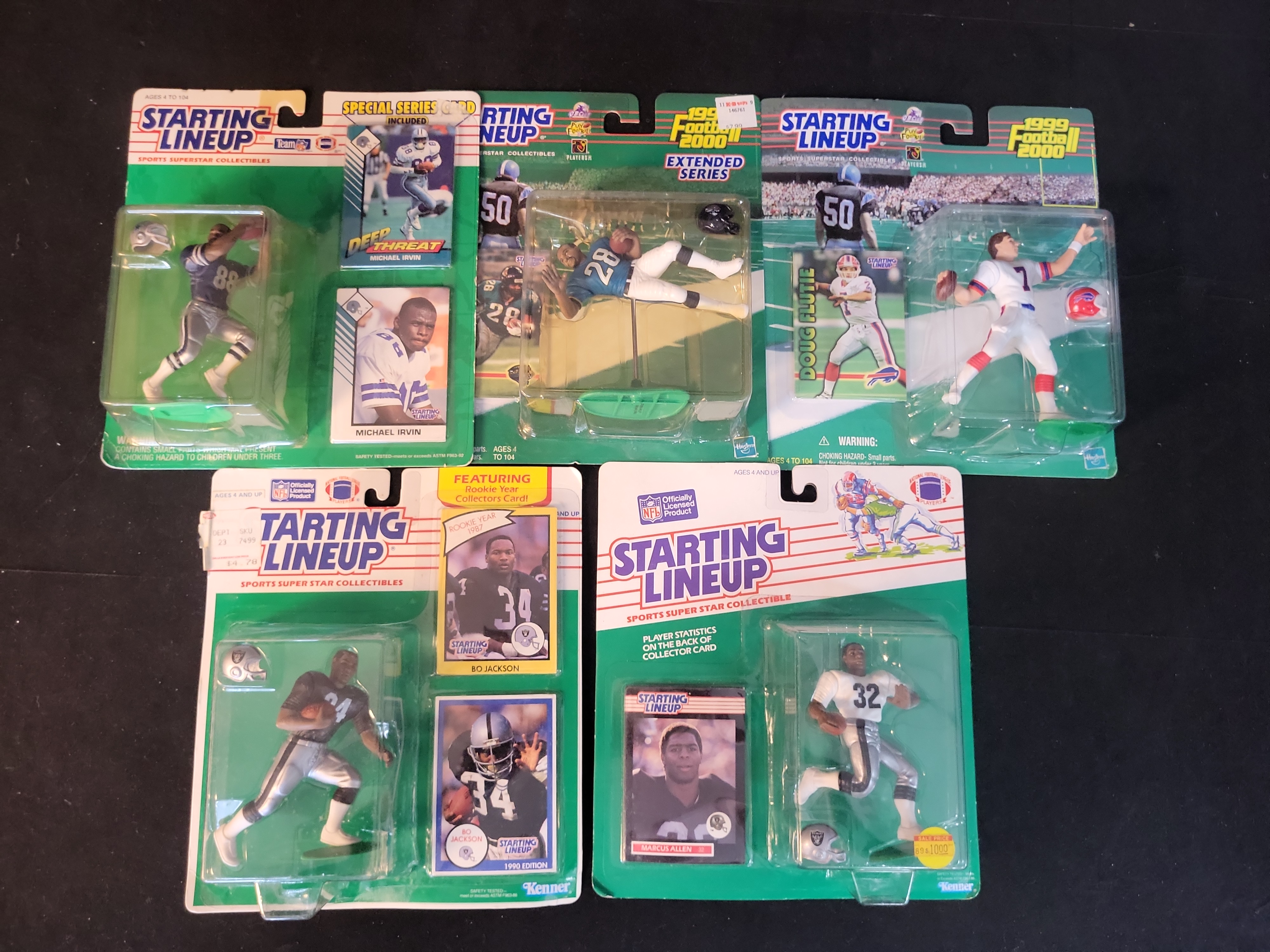 Kenner and Hasbro are the manufacturers of this collection of five NFL Starting Lineup action figures, spanning the late 1980s through the late 1990s. The lot features prominent players including Bo Jackson (Los Angeles Raiders, 1990 Edition), Marcus Allen (Los Angeles Raiders), Michael Irvin (Dallas Cowboys), Fred Taylor (Jacksonville Jaguars, 1999 Football 2000 Extended Series), and Doug Flutie (Buffalo Bills, 1999 Football 2000 Series). These figures are constructed from molded plastic and are presented in their original cardstock and plastic blister packaging. Each figure is designed in a signature athletic pose and includes a removable team helmet and original collector cards. Notable inclusions are the Bo Jackson 1987 Rookie Year card and the Michael Irvin Deep Threat special series card. The earlier figures (Jackson, Allen, Irvin) carry the Kenner brand, while the 1999 series figures (Taylor, Flutie) were produced under the Hasbro brand.