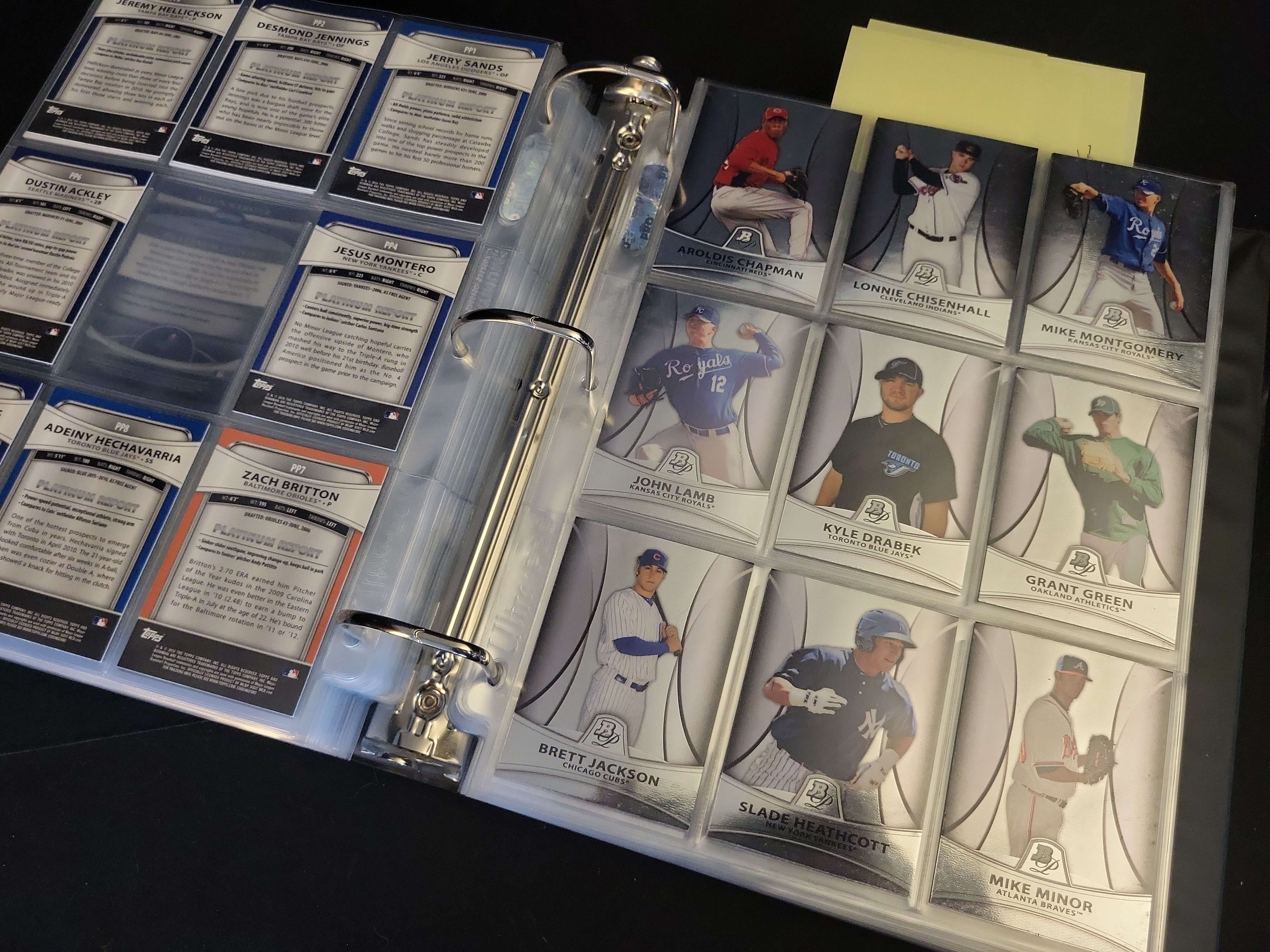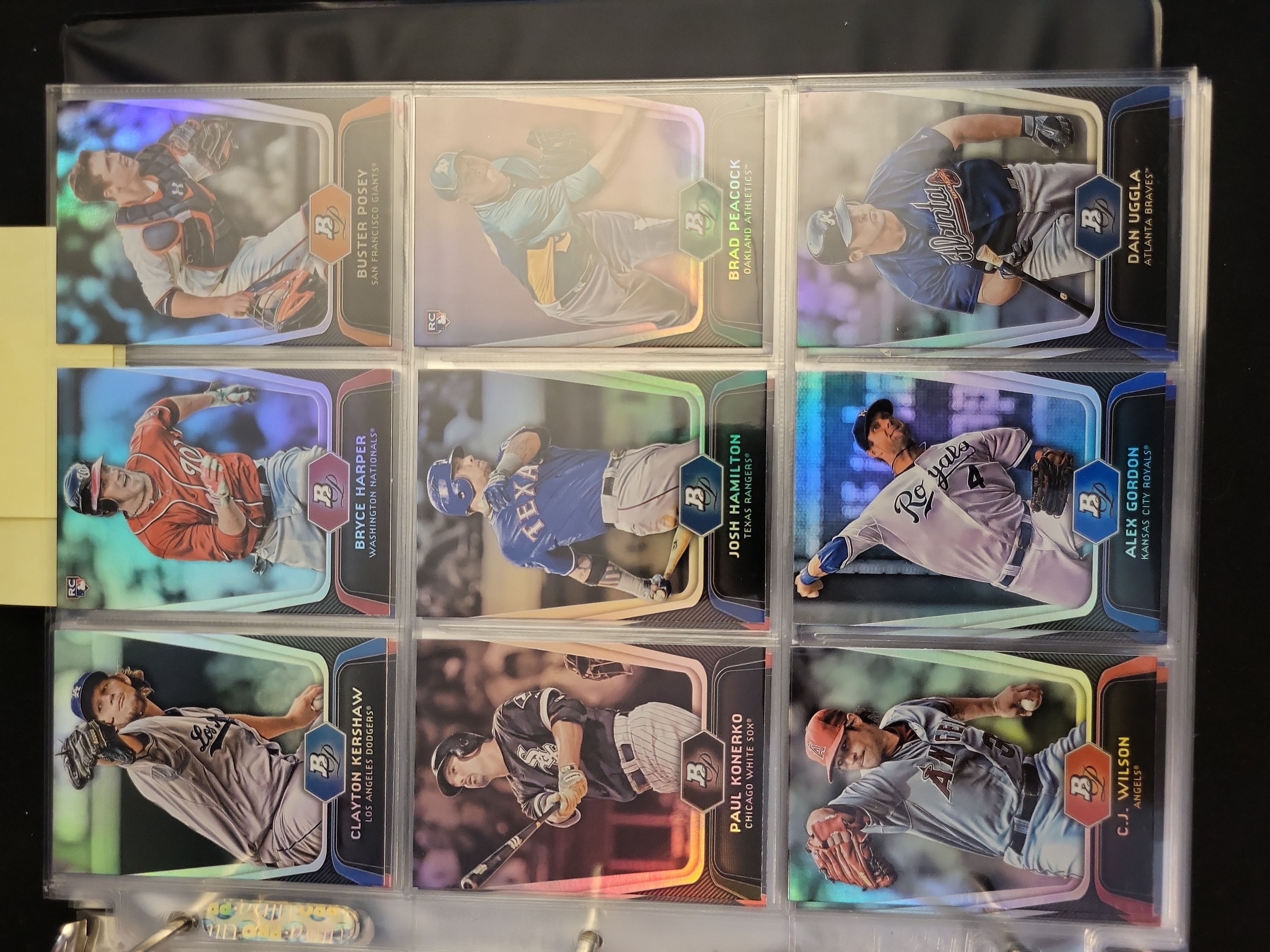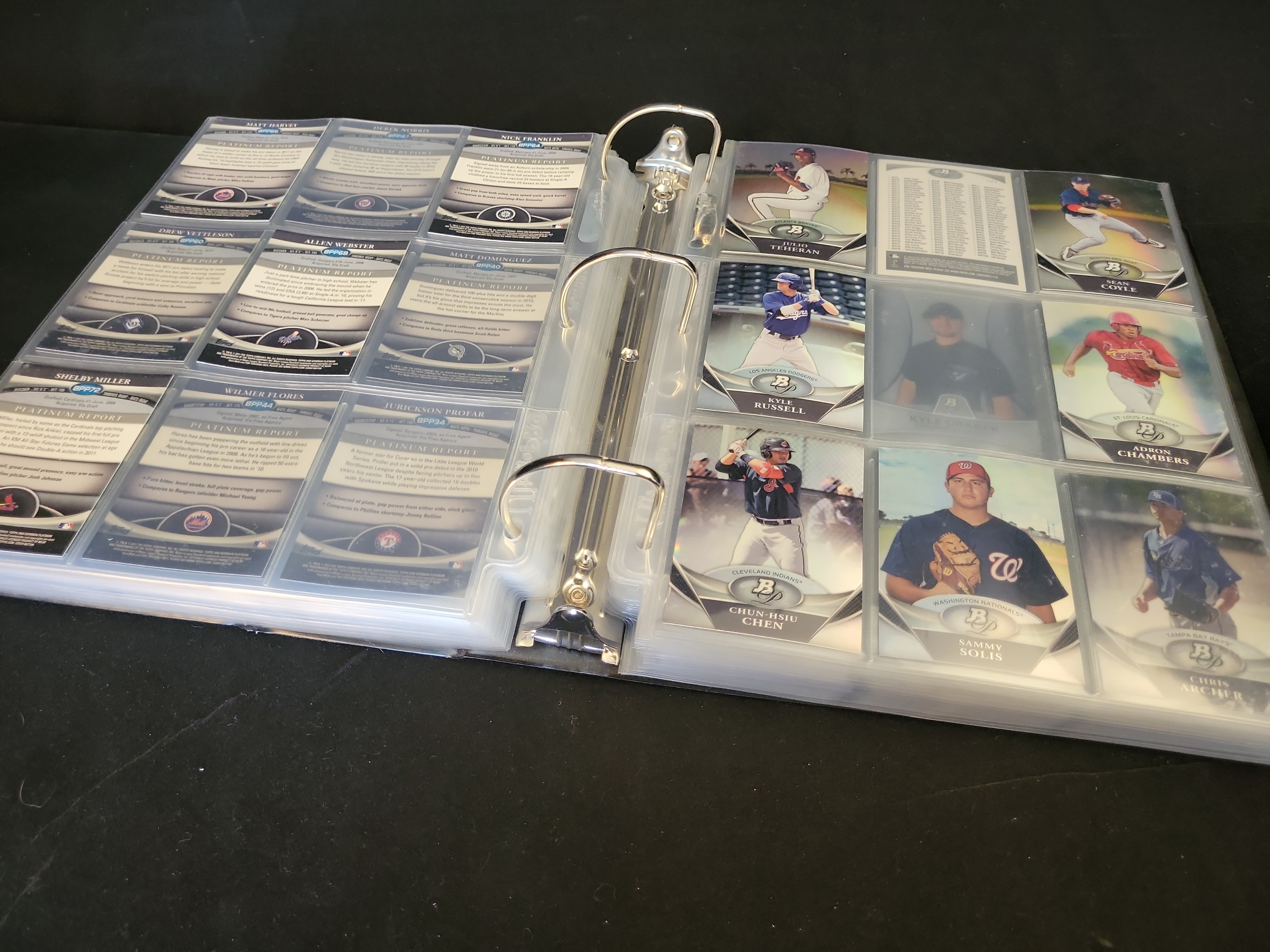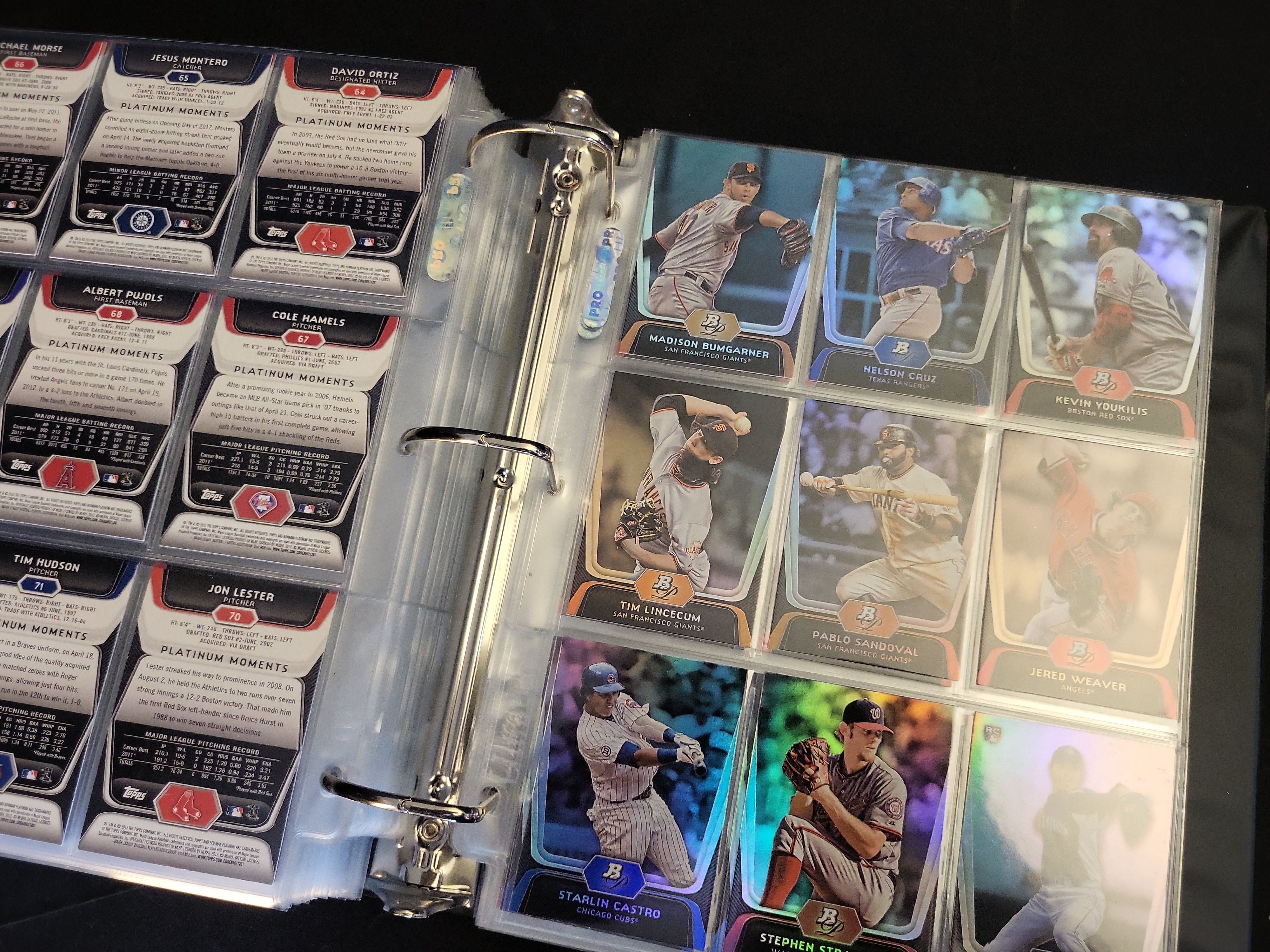 Brand: Bowman Platinum by Topps. Years: 2010, 2011, 2012. Set: Base and Prospects. Notable cards: 2012 Bryce Harper #BVP-BH (RC), 2012 Mike Trout #80, 2011 Albert Pujols #68, 2011 Derek Jeter #25. Rookie status: Bryce Harper, Yoenis Cespedes, Drew Pomeranz, Jesus Montero. Parallel types: Refractor and Platinum Foil. Certification: None.