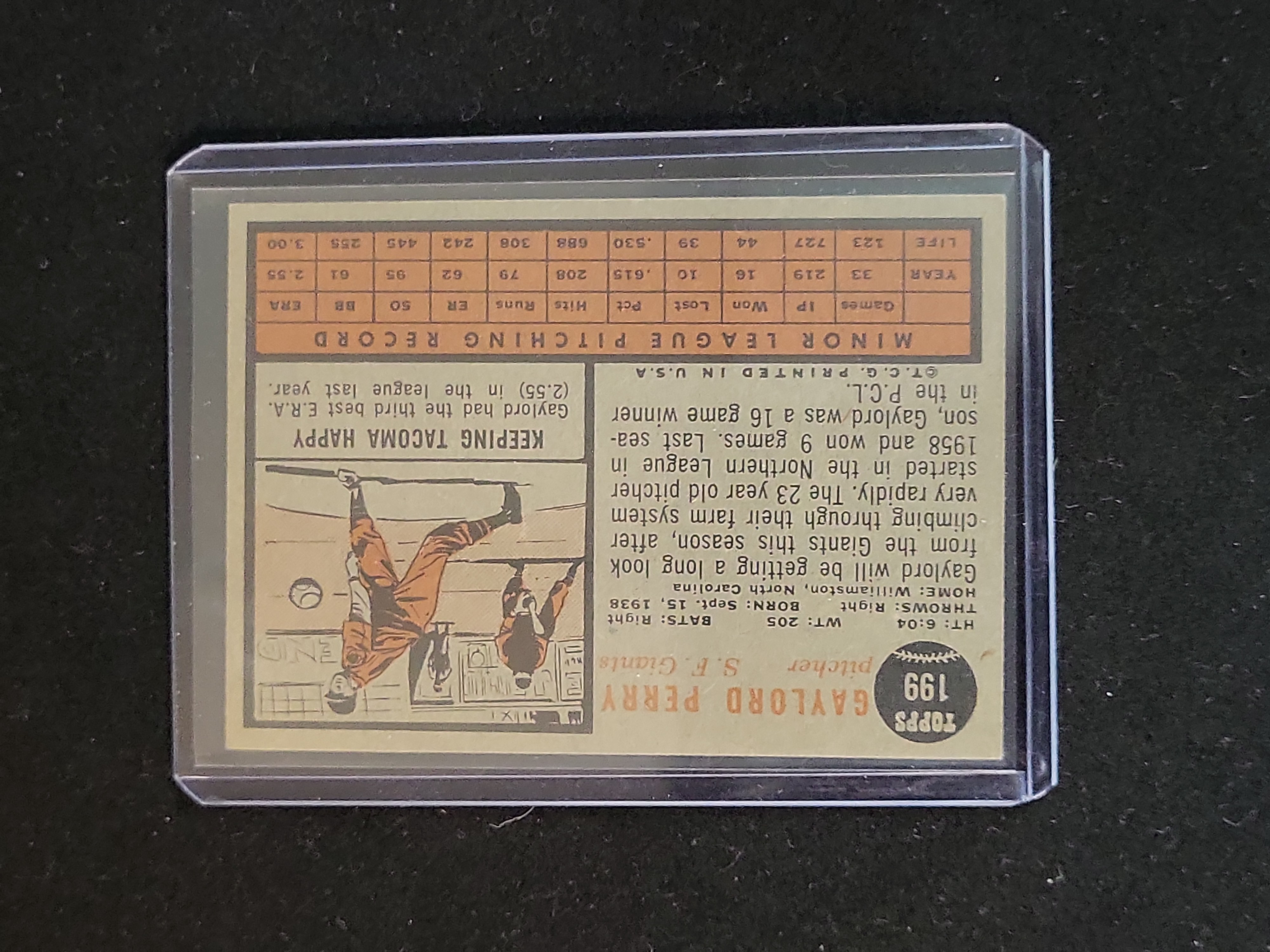This is a 1962 Topps #199 rookie card featuring Hall of Fame pitcher Gaylord Perry of the San Francisco Giants. A cornerstone of the 1962 set, this card is famous for its distinctive wood-grain border design. The front of the card features a portrait of Perry with a yellow "1962 ROOKIE" star in the upper-left and the classic "peeled back" corner graphic in the lower-right displaying his name, team, and position. The reverse side contains his "Minor League Pitching Record, " a biographical section titled "Keeping Tacoma Happy, " and a cartoon illustration. The card was manufactured in the U.S.A. by T.C.G. (Topps Chewing Gum). This is an original, vintage English-language printing and is presented in an ungraded state.