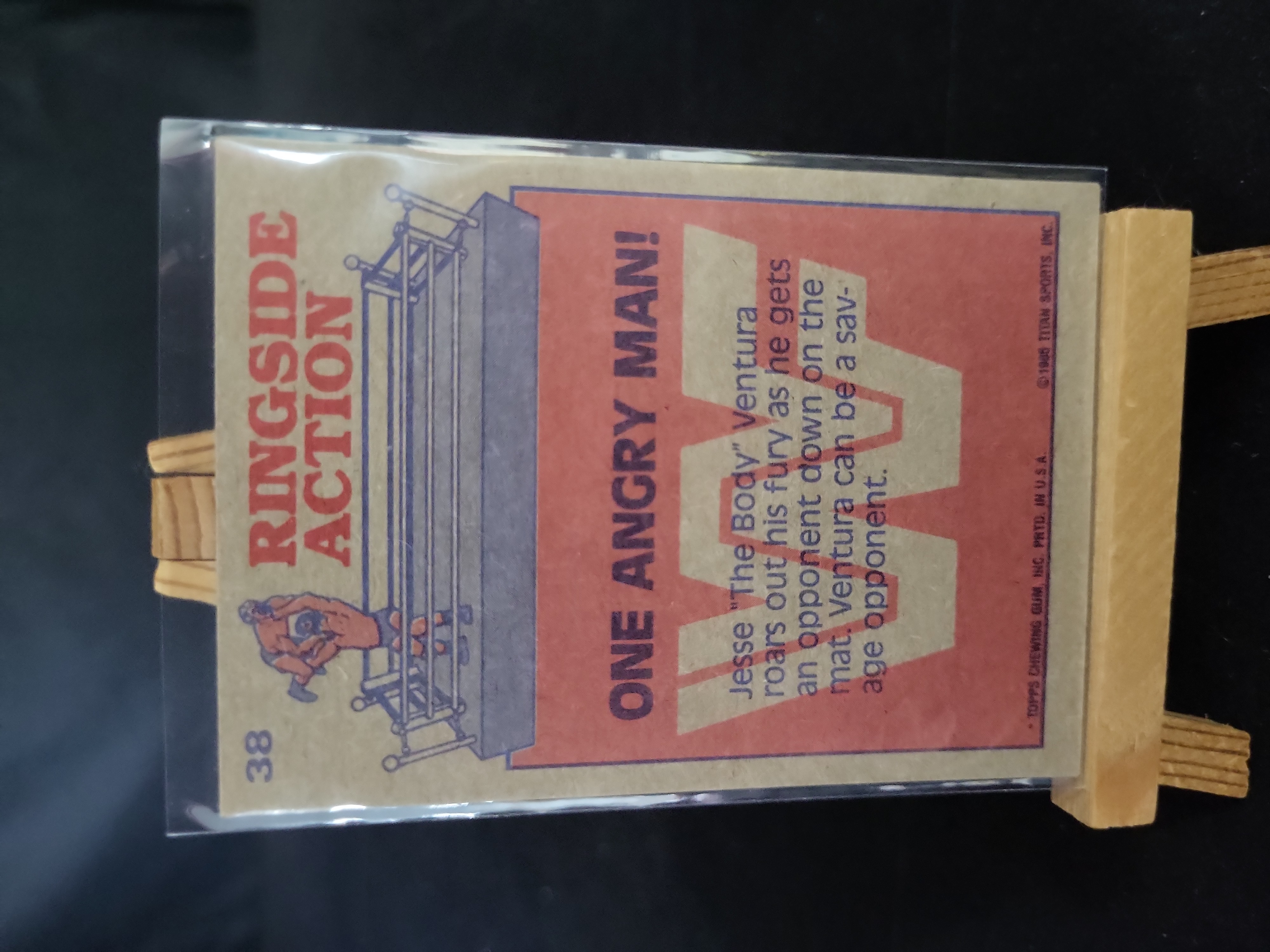 Brand: Topps. Year: 1985. Set: WWF (World Wrestling Federation). Card Number: 38. Player: Jesse "The Body" Ventura. Subset: Ringside Action. Title: One Angry Man!. Rookie Status: Part of the inaugural 1985 Topps WWF release, which includes Jesse Ventura’s rookie year cards. Parallel: Base. Certification: Ungraded (Raw).