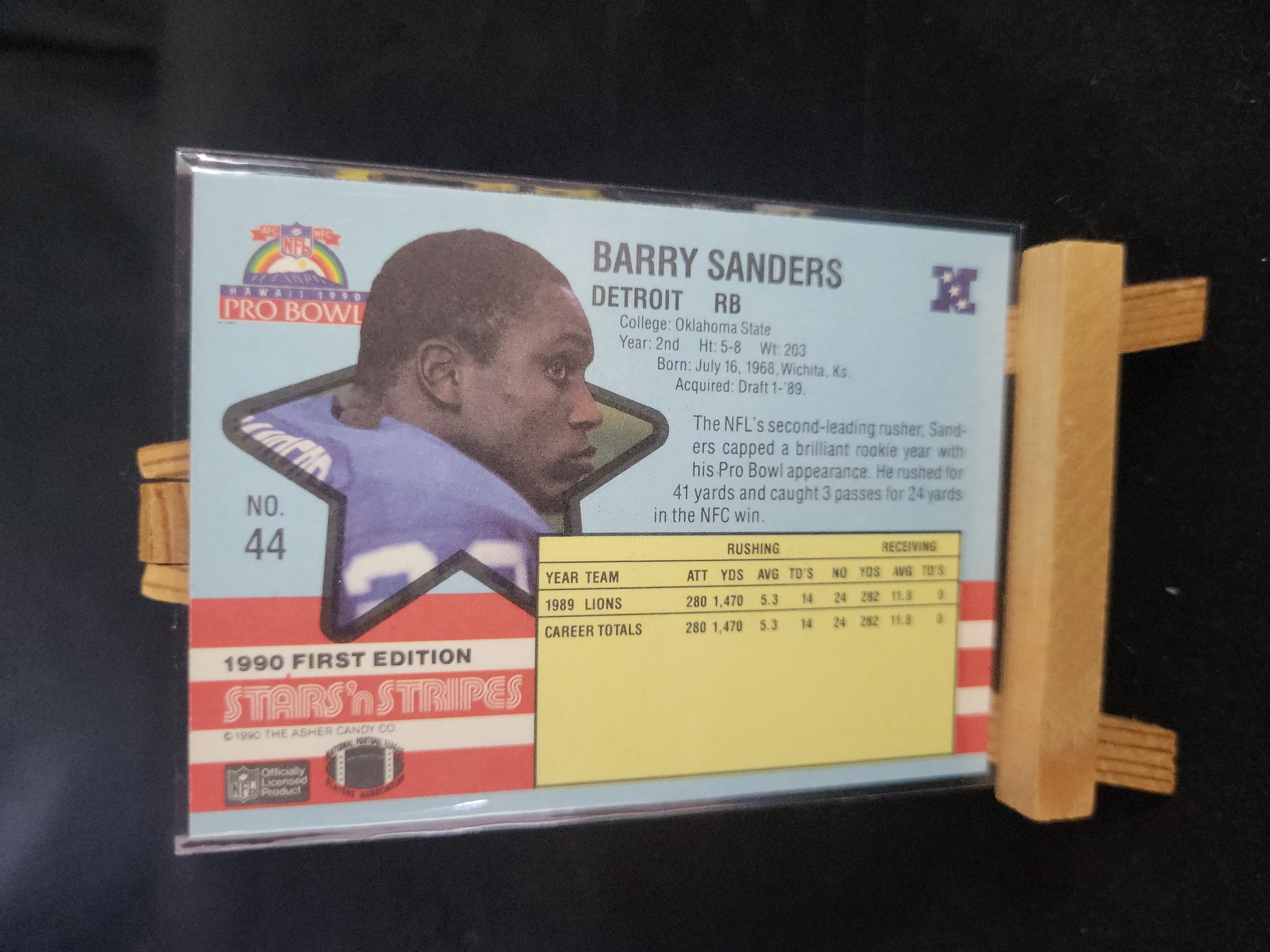 Brand: Asher Candy Co. Year: 1990. Set: Stars ‘n Stripes First Edition. Card Number: #44. Player: Barry Sanders. Team: Detroit Lions. Position: Running Back. Rookie Status: Non-rookie (Second-year card). Parallel/Subset: Pro Bowl. Certification: Ungraded (Raw). This collectible card features Detroit Lions legend Barry Sanders in his National team Pro Bowl uniform.