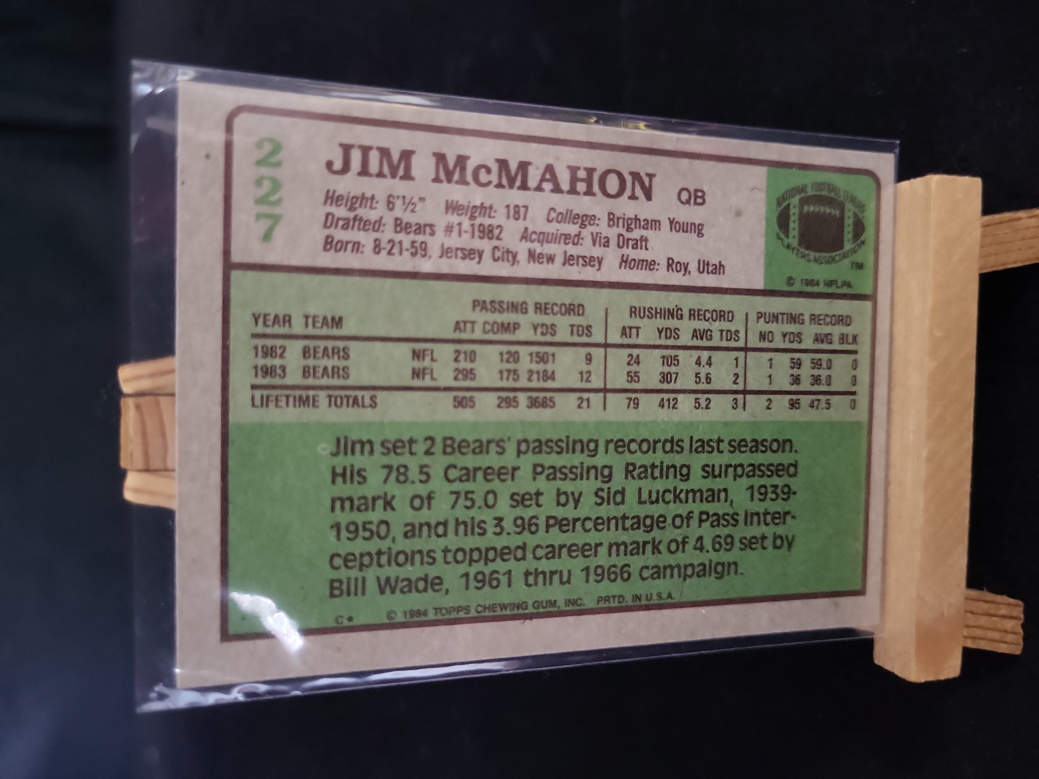 Brand: Topps. Year: 1984. Set: Football Base Set. Card Number: #227. Player: Jim McMahon. Rookie Status: Not a rookie card (second-year card). Parallel Type: Base set. Certification: Raw (Ungraded).