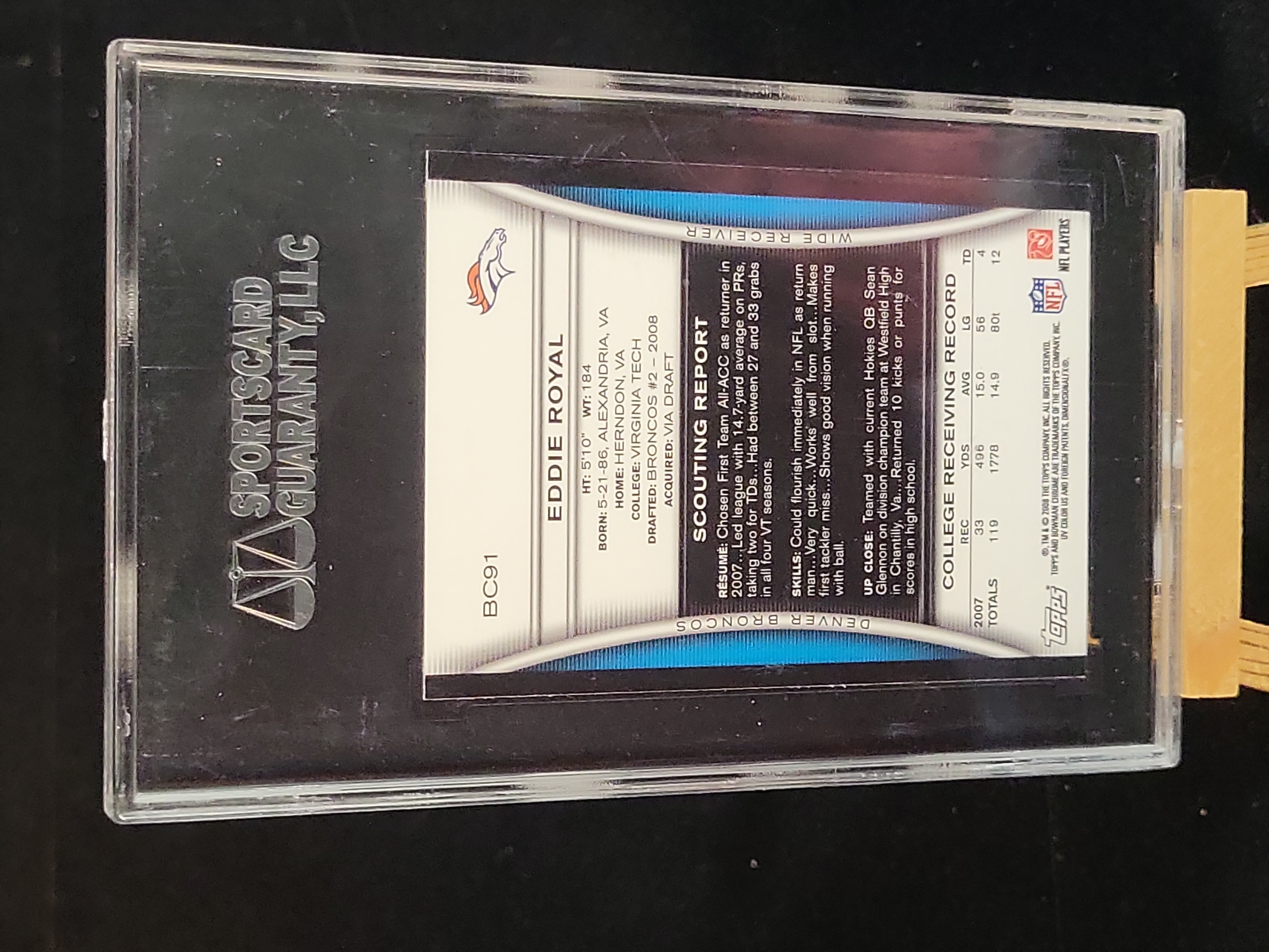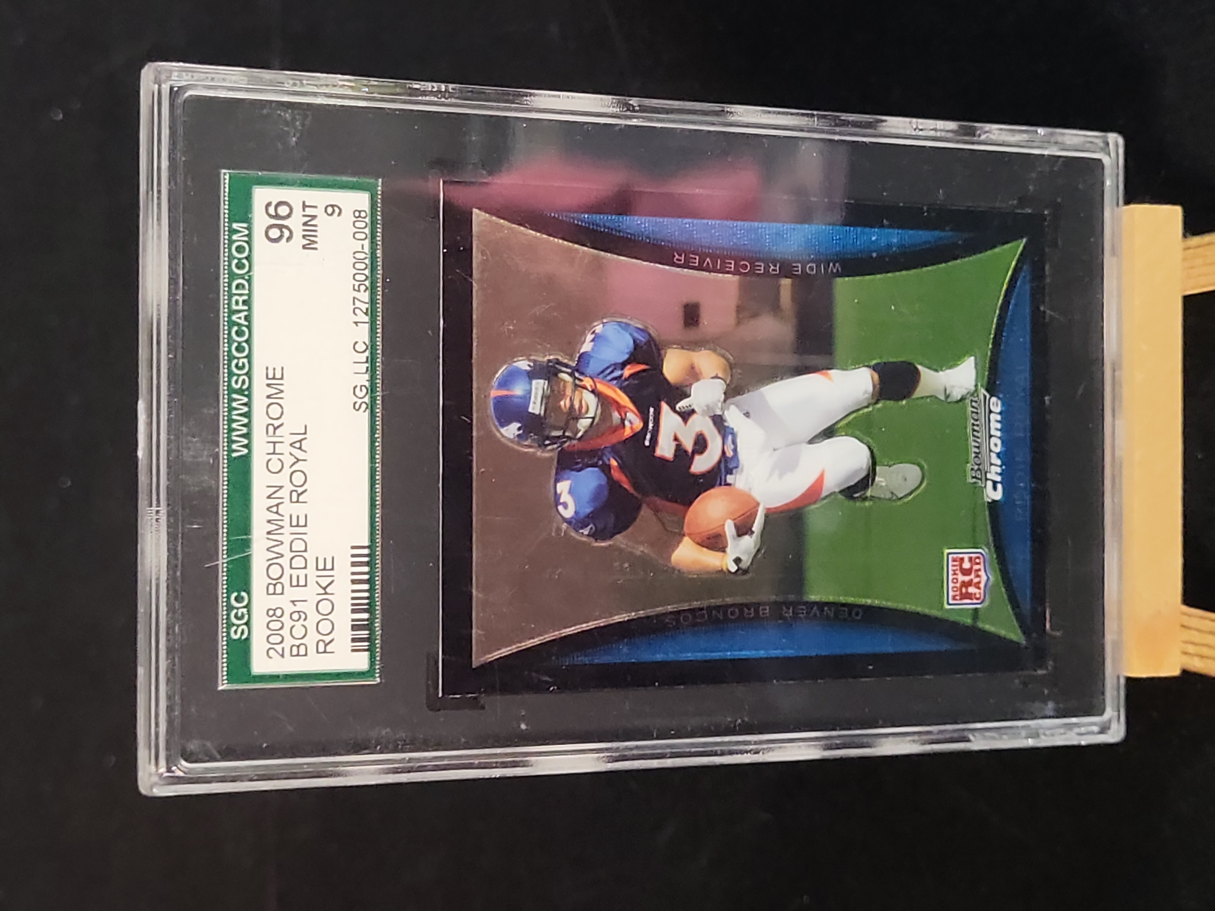 Bowman Chrome, 2008, Bowman Chrome Football, BC91, Eddie Royal, Rookie Card (RC), Base Chrome, SGC 96 MINT 9 (Certification Number: 1275000-008).