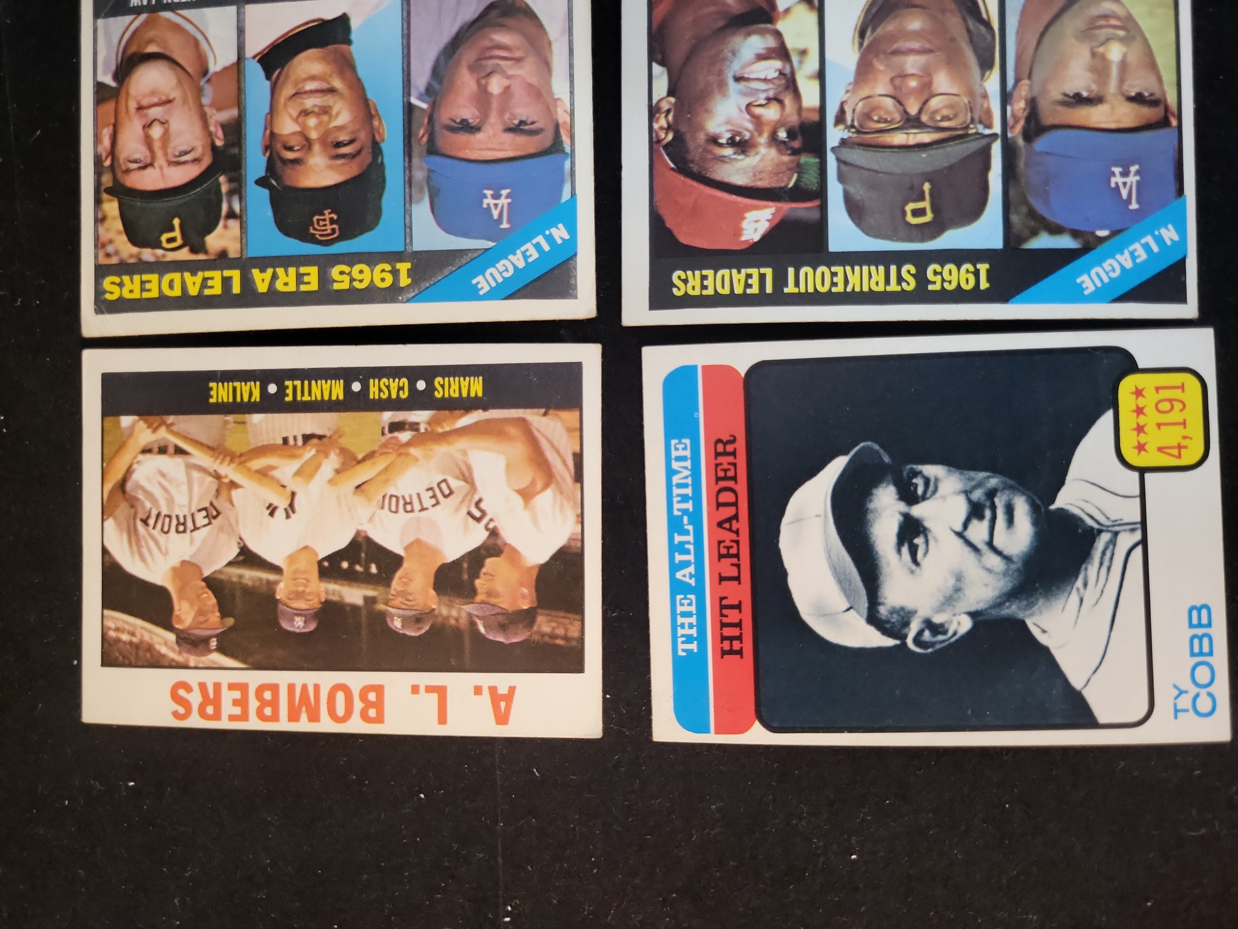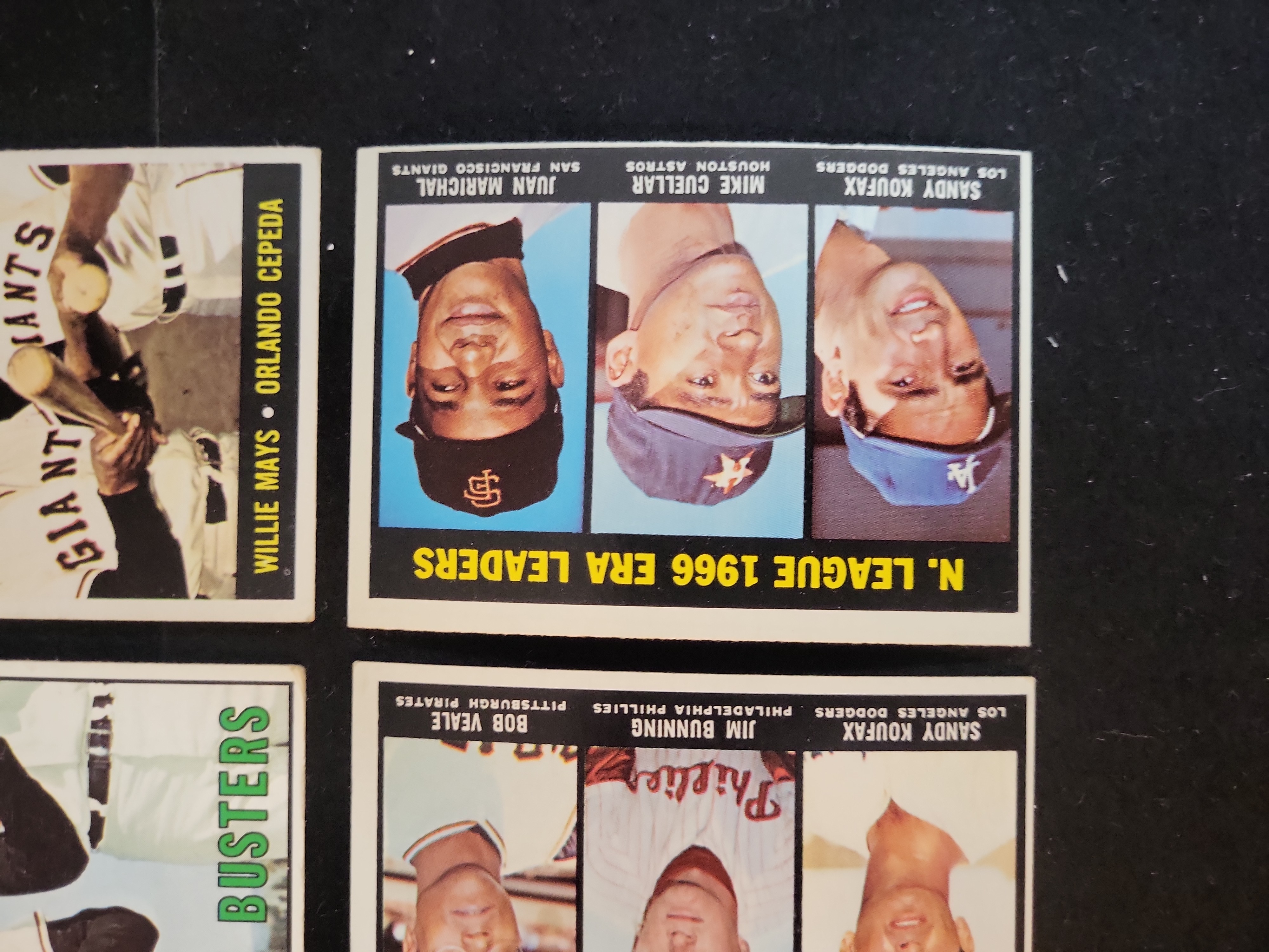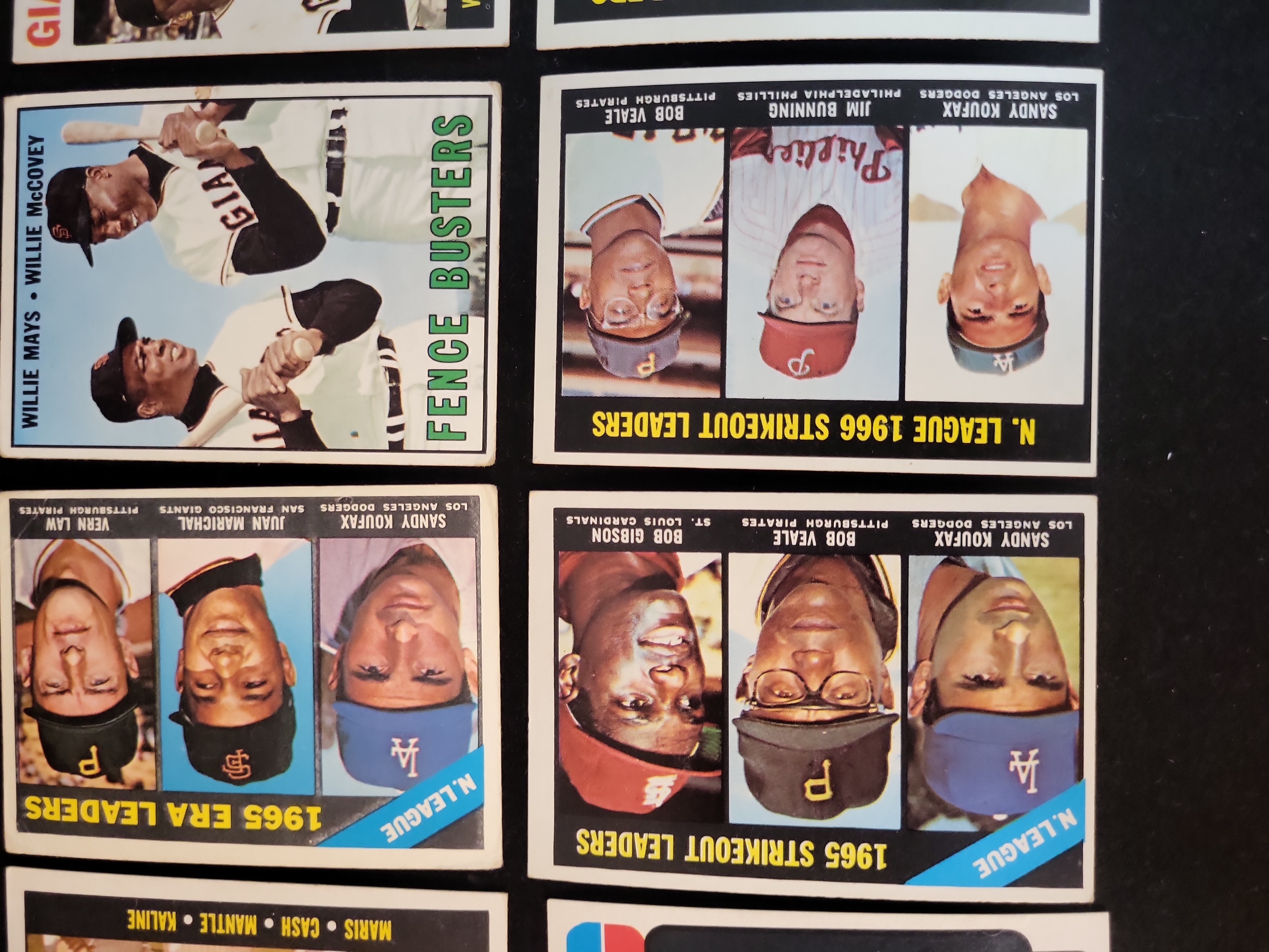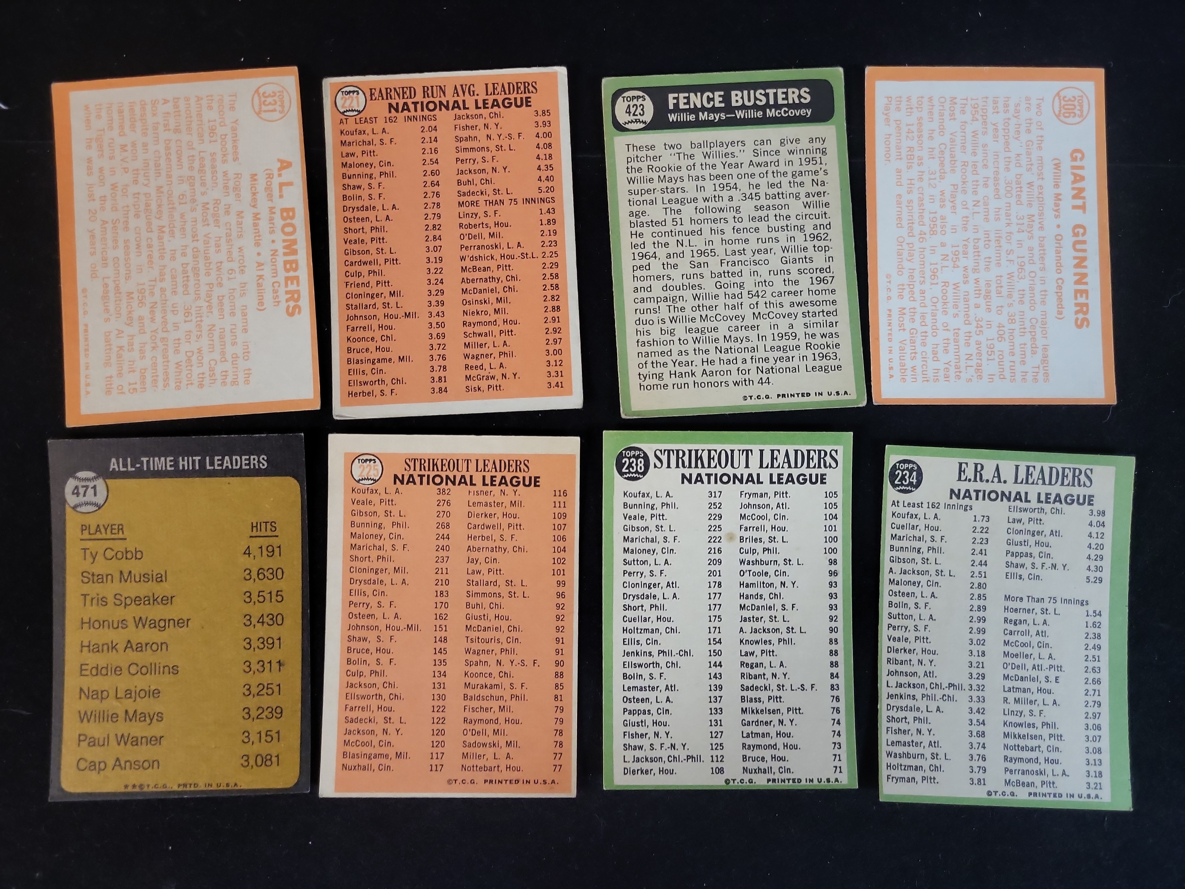 Topps, 1964-1973, Base Set and Subsets, #331, #221, #423, #306, #471, #225, #238, #234. Featured players include Mickey Mantle, Willie Mays, Sandy Koufax, Roger Maris, Ty Cobb, Bob Gibson, Juan Marichal, and Jim Bunning. No rookie cards present. Special subsets include A.L. Bombers, Fence Busters, Giant Gunners, and League Leaders. All cards are raw and uncertified.